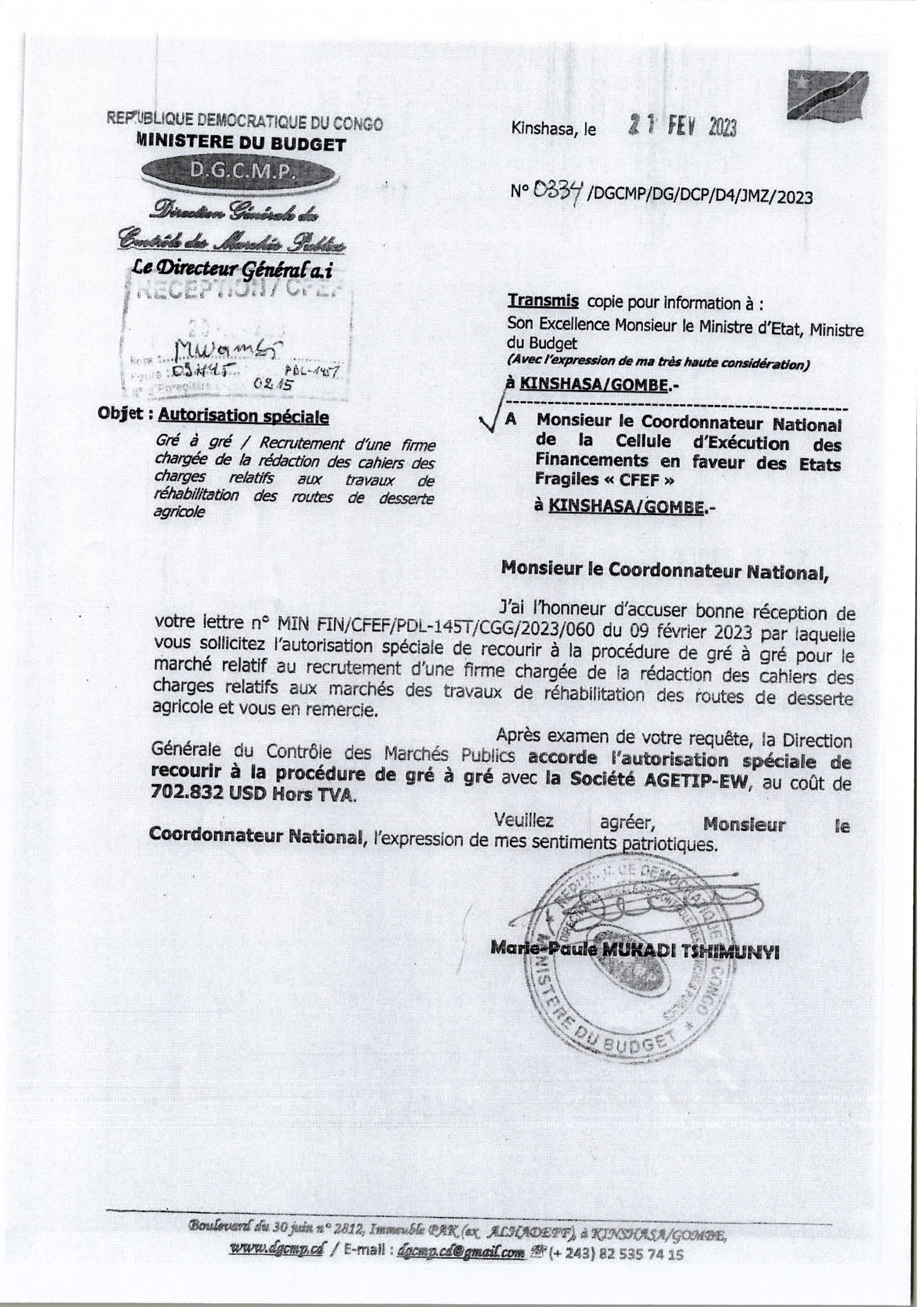 Autorisation spécial de la CFEF accordée a la société AGETIP-EW relative au recrutement d’un consultant chargée de la rédaction des cahiers des chargée relatif aux travaux de réhabilitation des routes de desserte agricole.