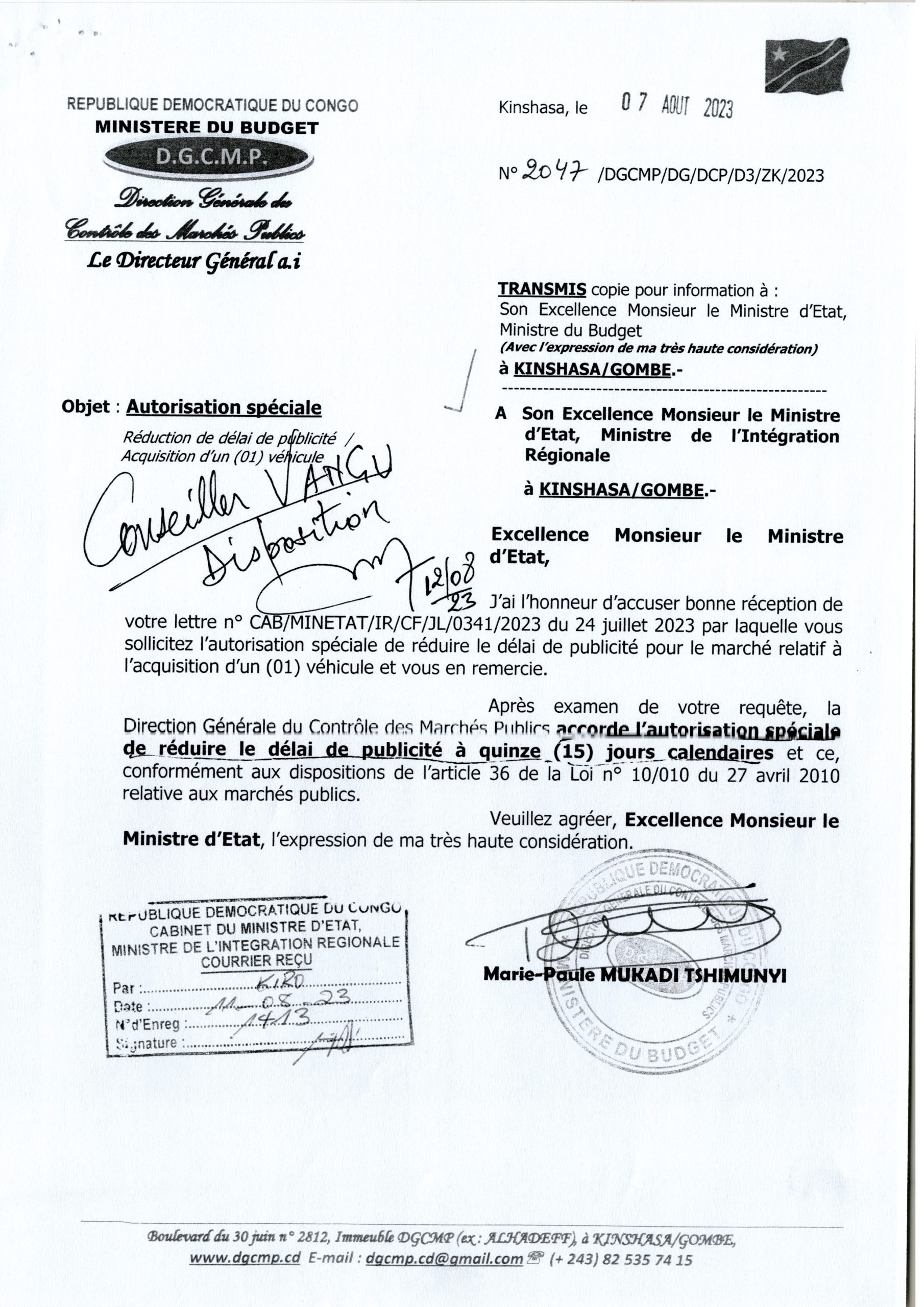 Autorisation Spéciale accordée au Ministre de l’Intégration Régionale de réduire le délai de publicité à quinze (15) jours calendaires relatif au marché d’acquisition d’un (01)véhicule