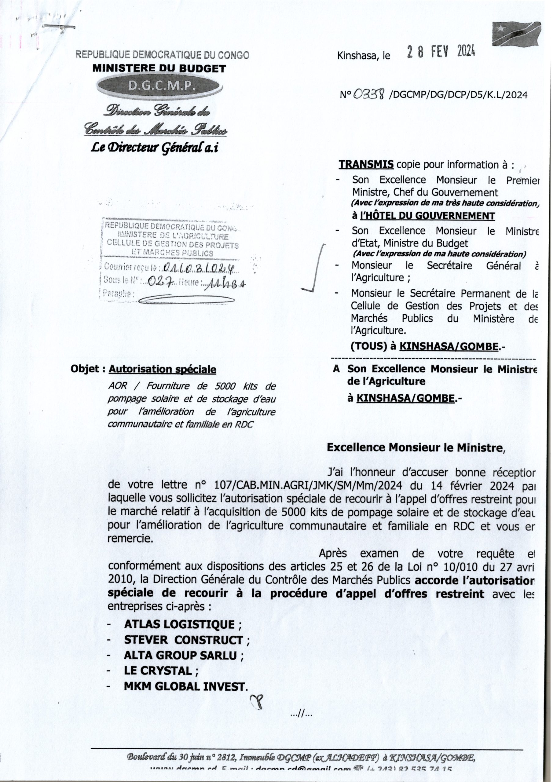 Autorisation Spéciale du Ministère de l’Agriculture relative à la fourniture de 5000 kits de pompage solaire et de stockage d’eau pour l’amélioration de l’agriculture communautaire et familiale en RDC