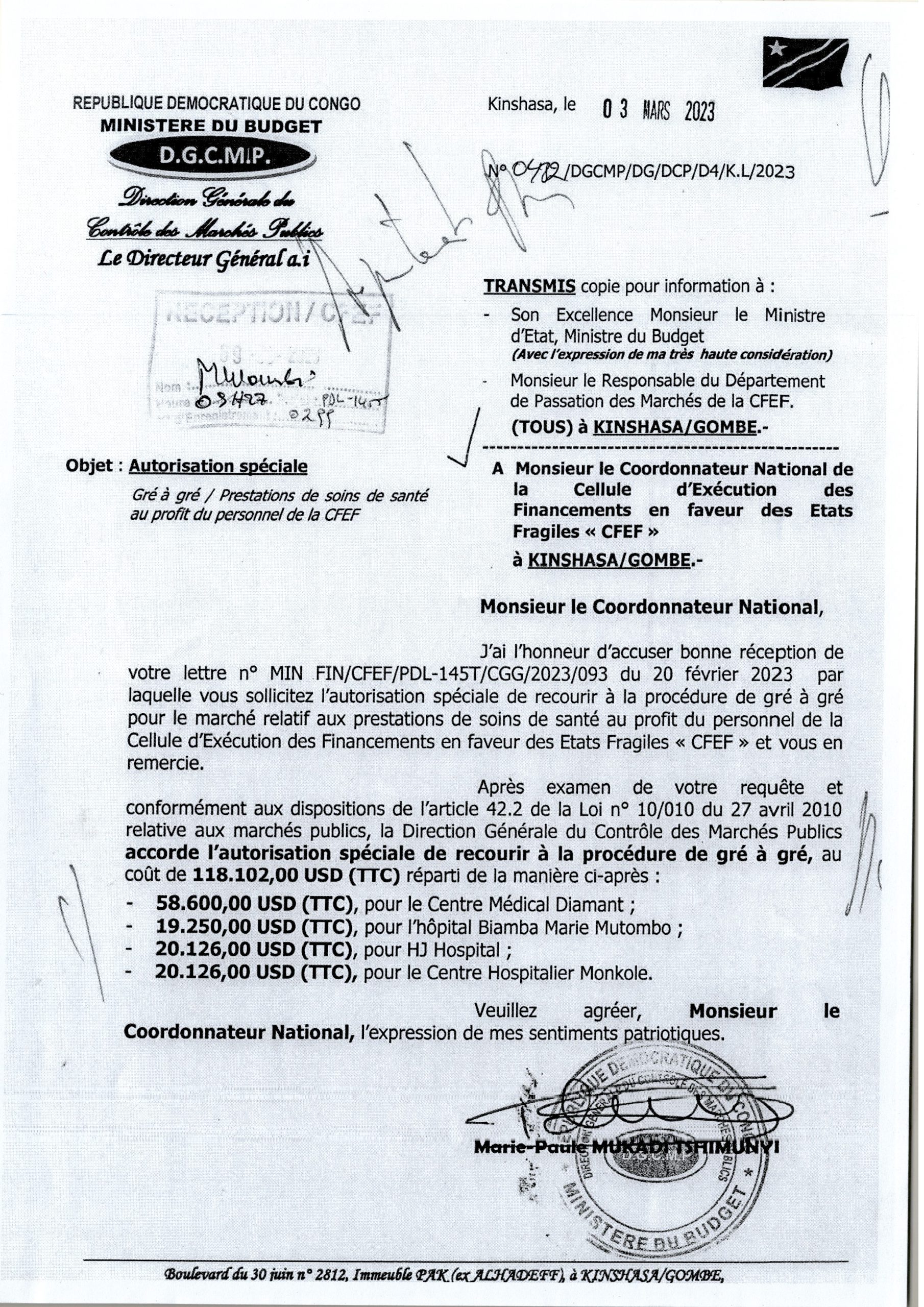Autorisation spéciale Gré à Gré/Prestations de soins de Santé au profit du personnel de la CFEF