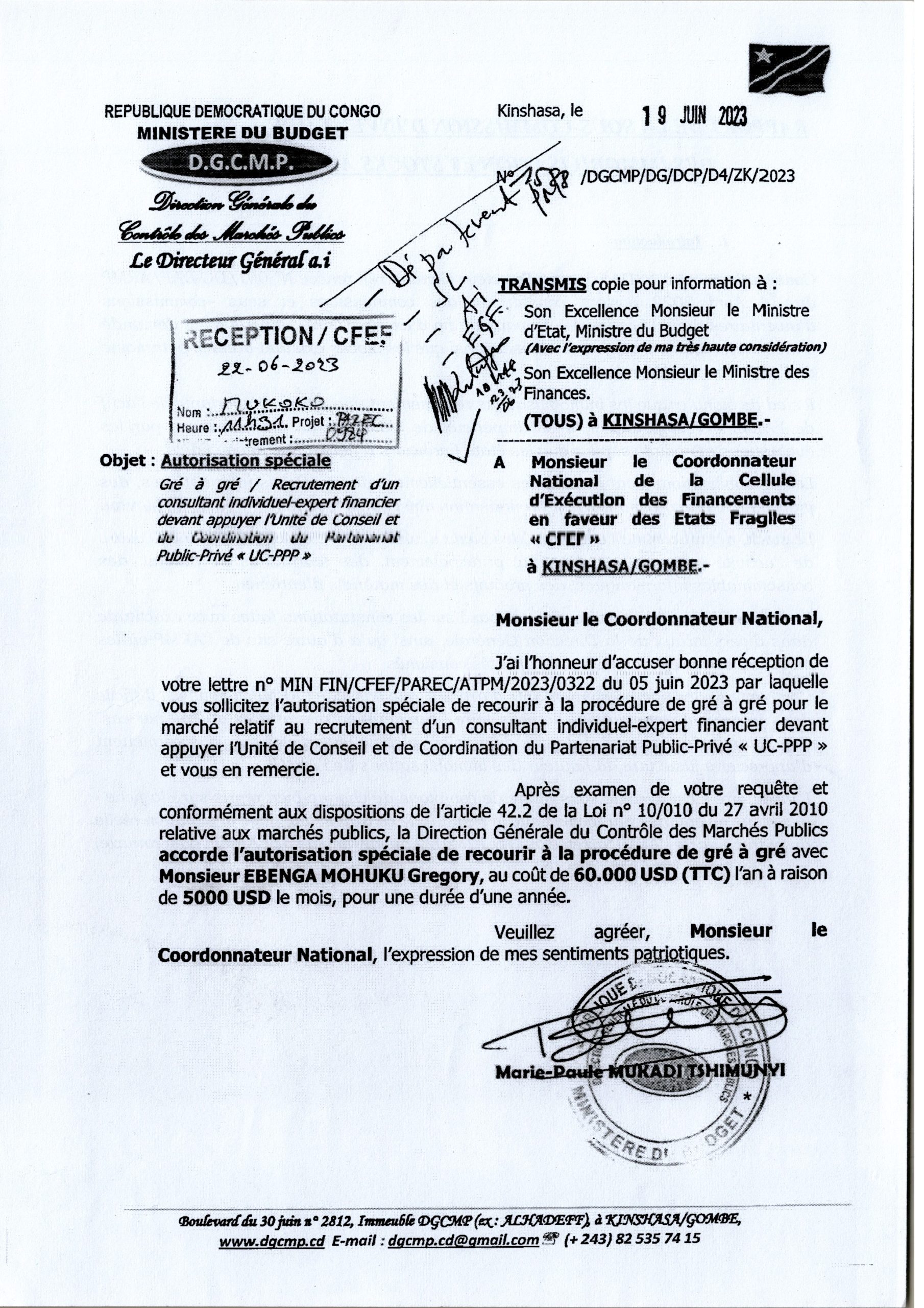 Autorisation Spéciale gré à gré / Recrutement d’un consultant Individuel-Expert financier devant appuyer l’Unité de Conseil et de Coordination du Partenariat Public-Privé “UC-PPP” à Monsieur EBENGA MOHUKU Gregory