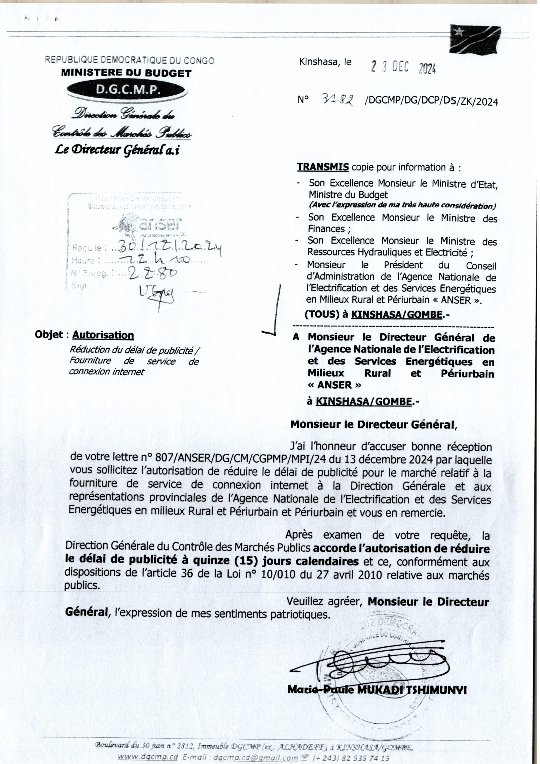 Autorisation spéciale pour la réduction du délai de publicité sur le marché de fourniture de service de connexion Internet