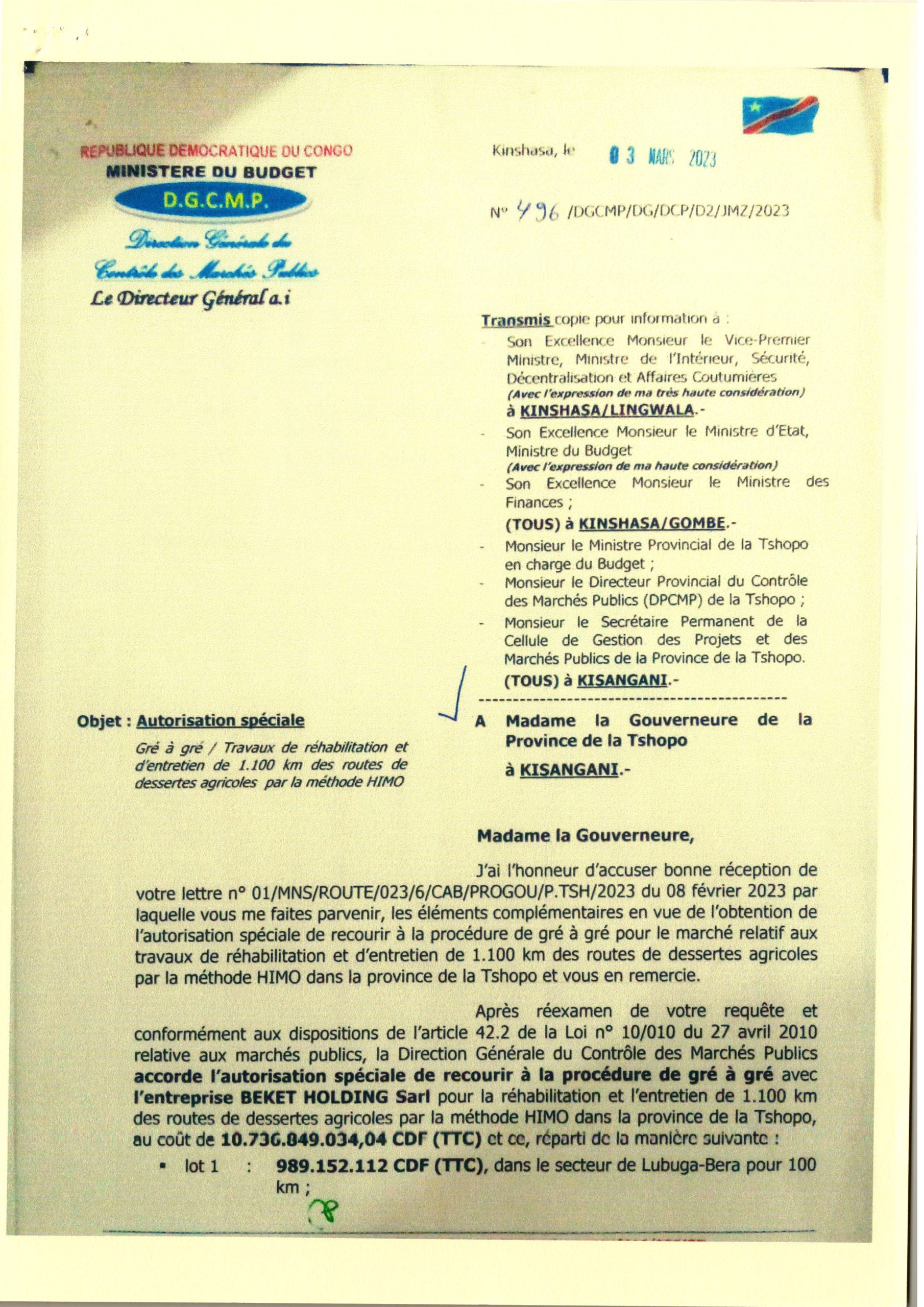 AUTORISATION SPECIALE POUR LE RECOURS A LA PROCEDURE DE GRE A GRE POUR LE MARCHE DES TRAVAUX DE REHABILITATION ET ENTRETIEN DE 1100KM DE DESSERTES AGRICOLES PAR LA METHODE HIMO