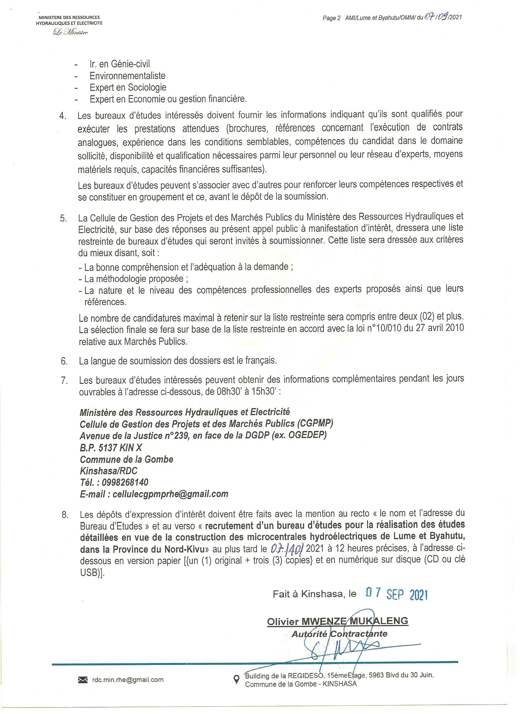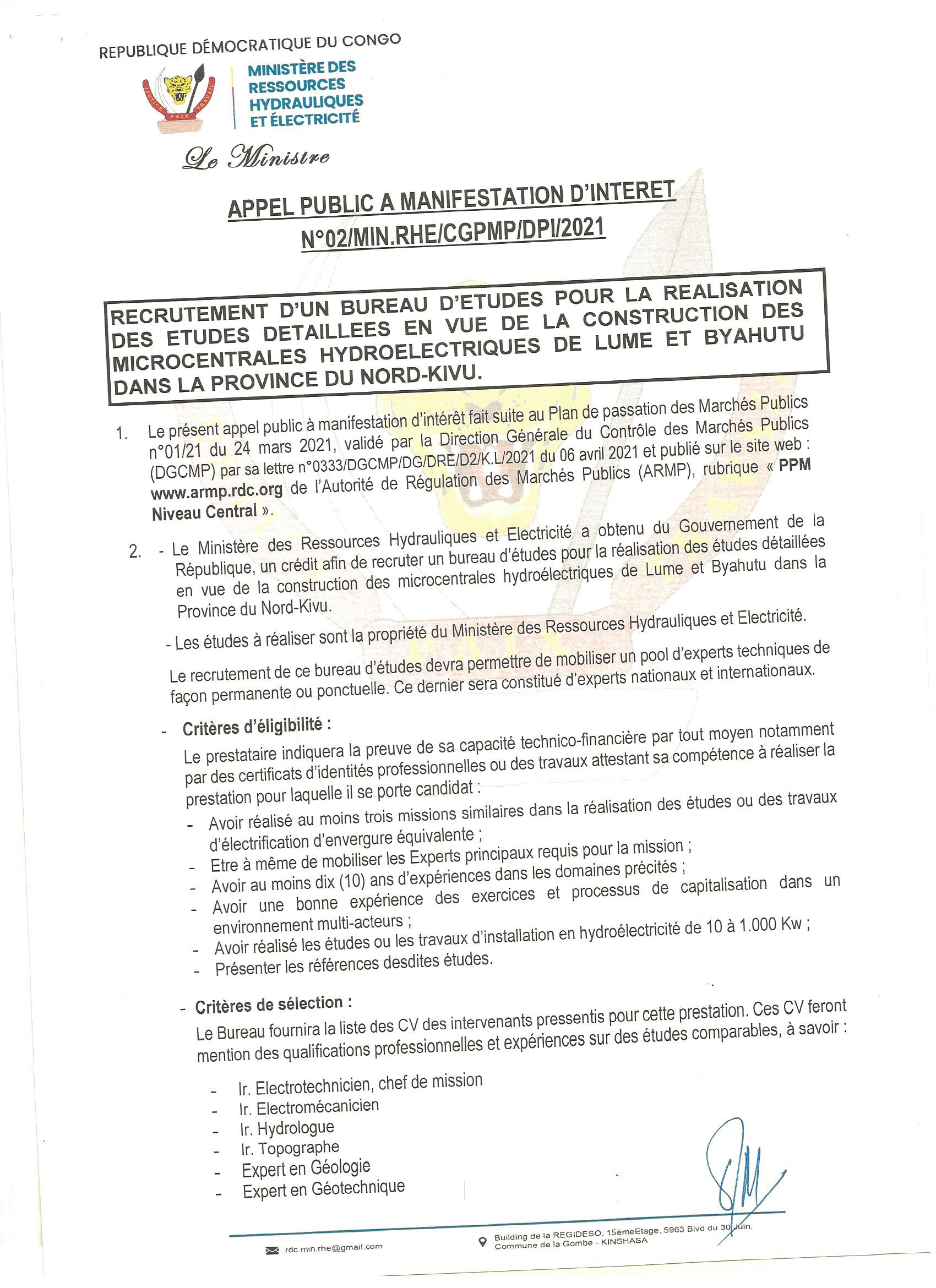 Recrutement d’un bureau d’études pour la réalisation des études détaillées en vue de la construction de la microcentrale hydroélectrique de LUME et BYAHUTU dans la province du NORD-KIVU