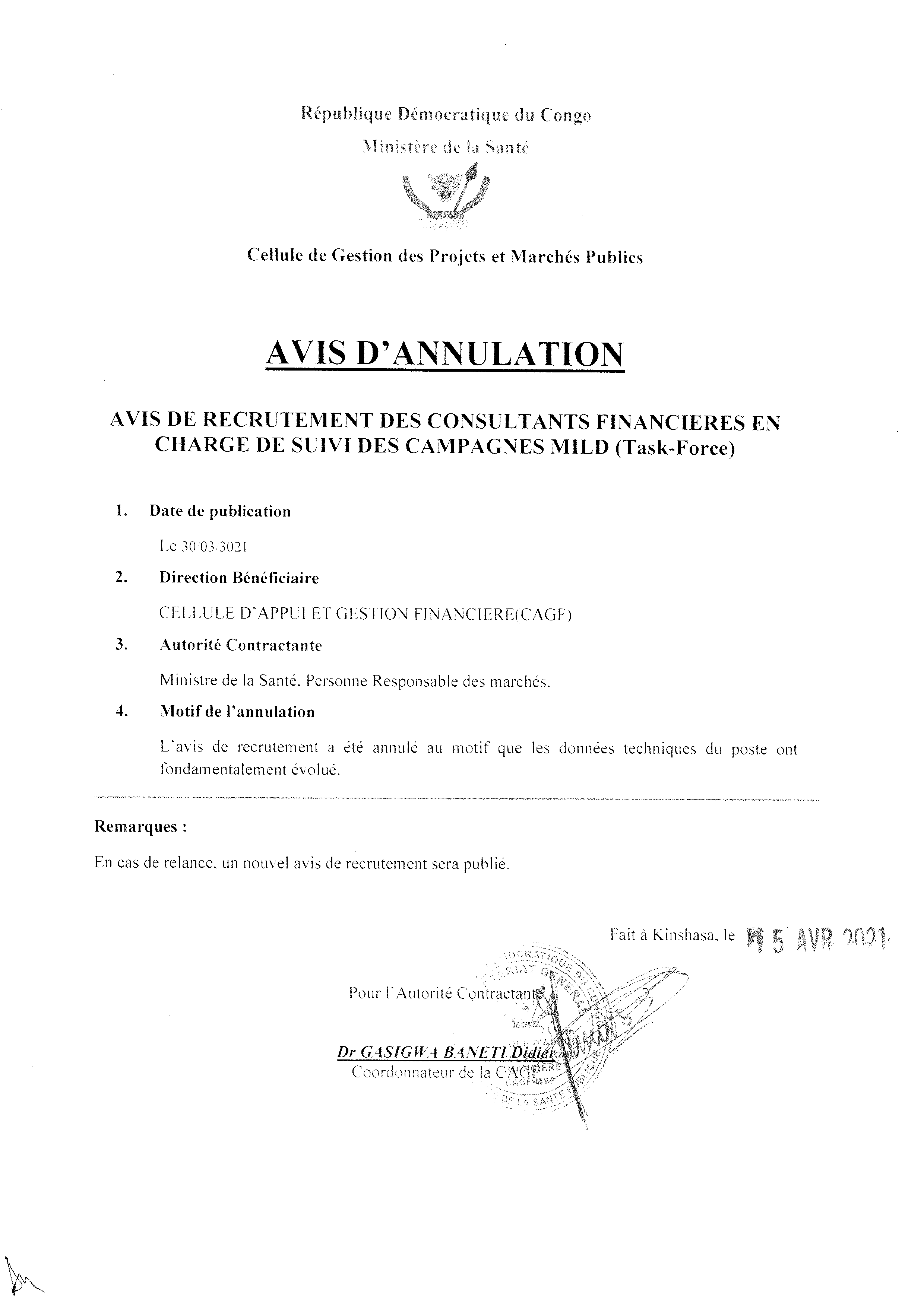 Avis d’annulation de recrutement des consultants Financières en charge de suivi des Campagnes MILD (Task-Force)