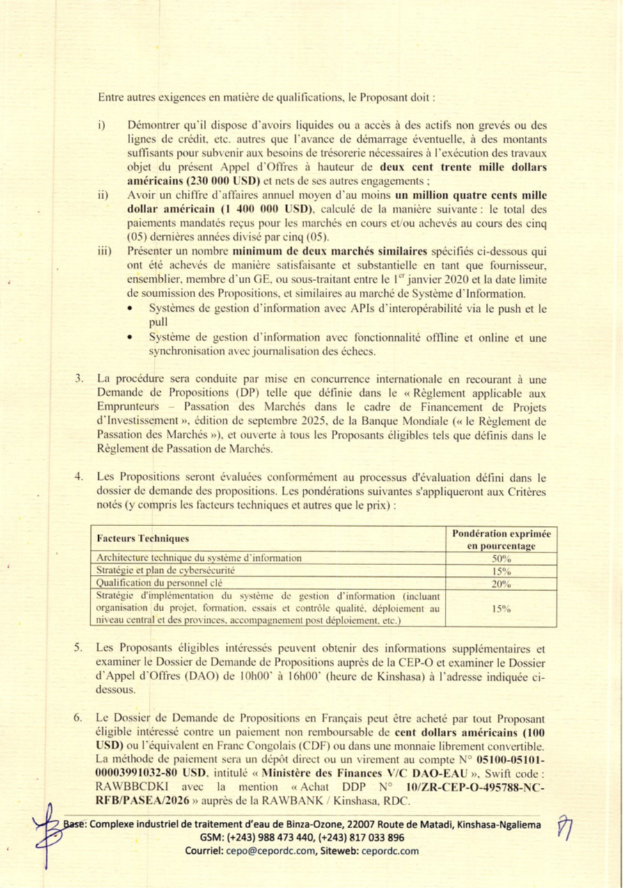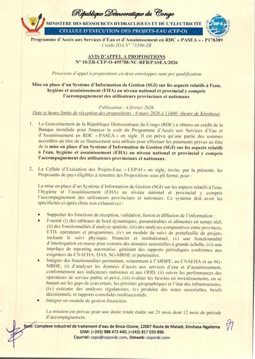 Avis d’appel à propositions relatif à la mise en place d’un Système d’Information de Gestion sur les aspects de l’Eau, Hygiène et assaisnnissement…