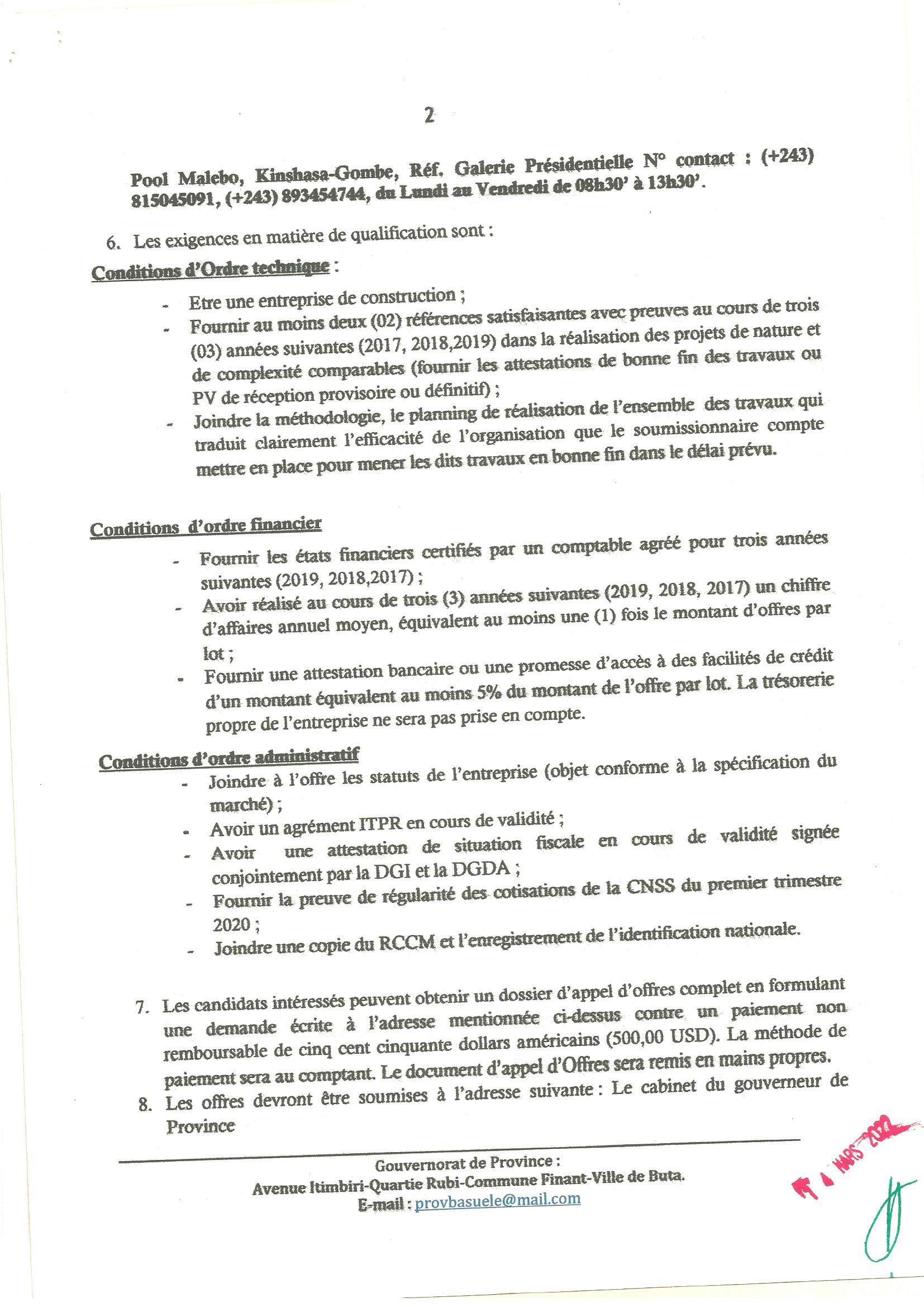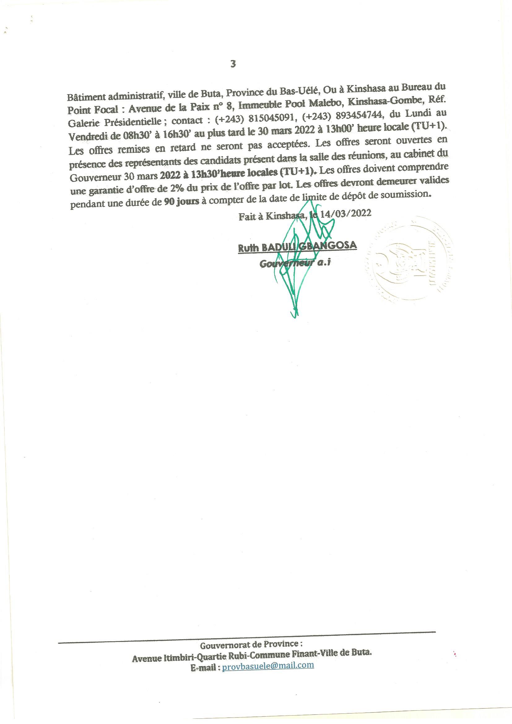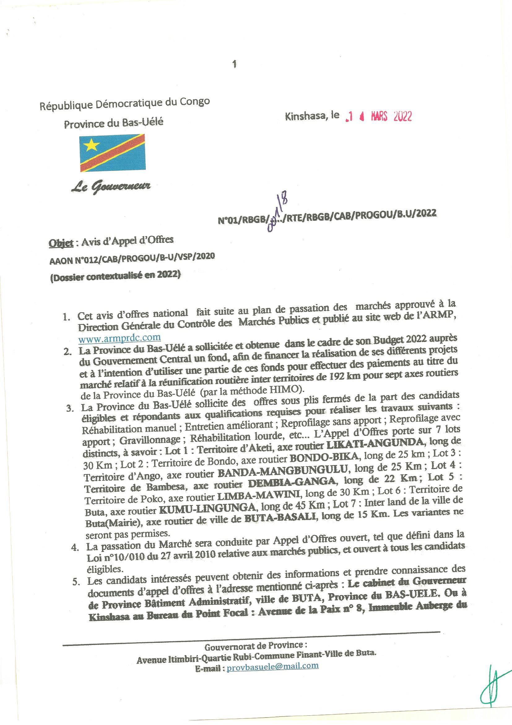 AVIS D’APPEL D’OFFRE DE BAS-UELE RELATIF A LA REUNIFICATION ROUTIERE INTER TERRITOIRES DE 192KM POUR SEPT AXES ROUTIERS DE LA PROVINCE DU BAS-UELE (PAR LA METHODE HIMO).