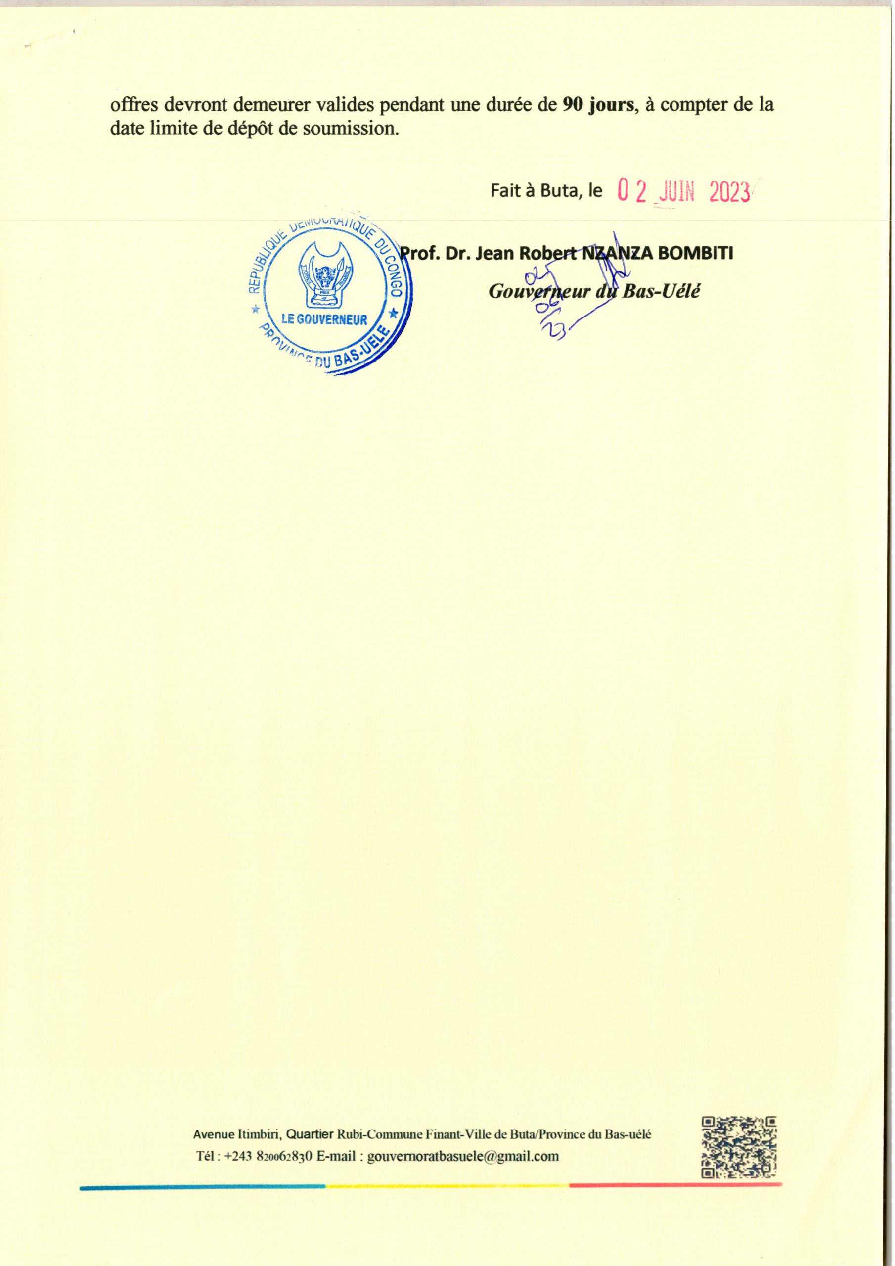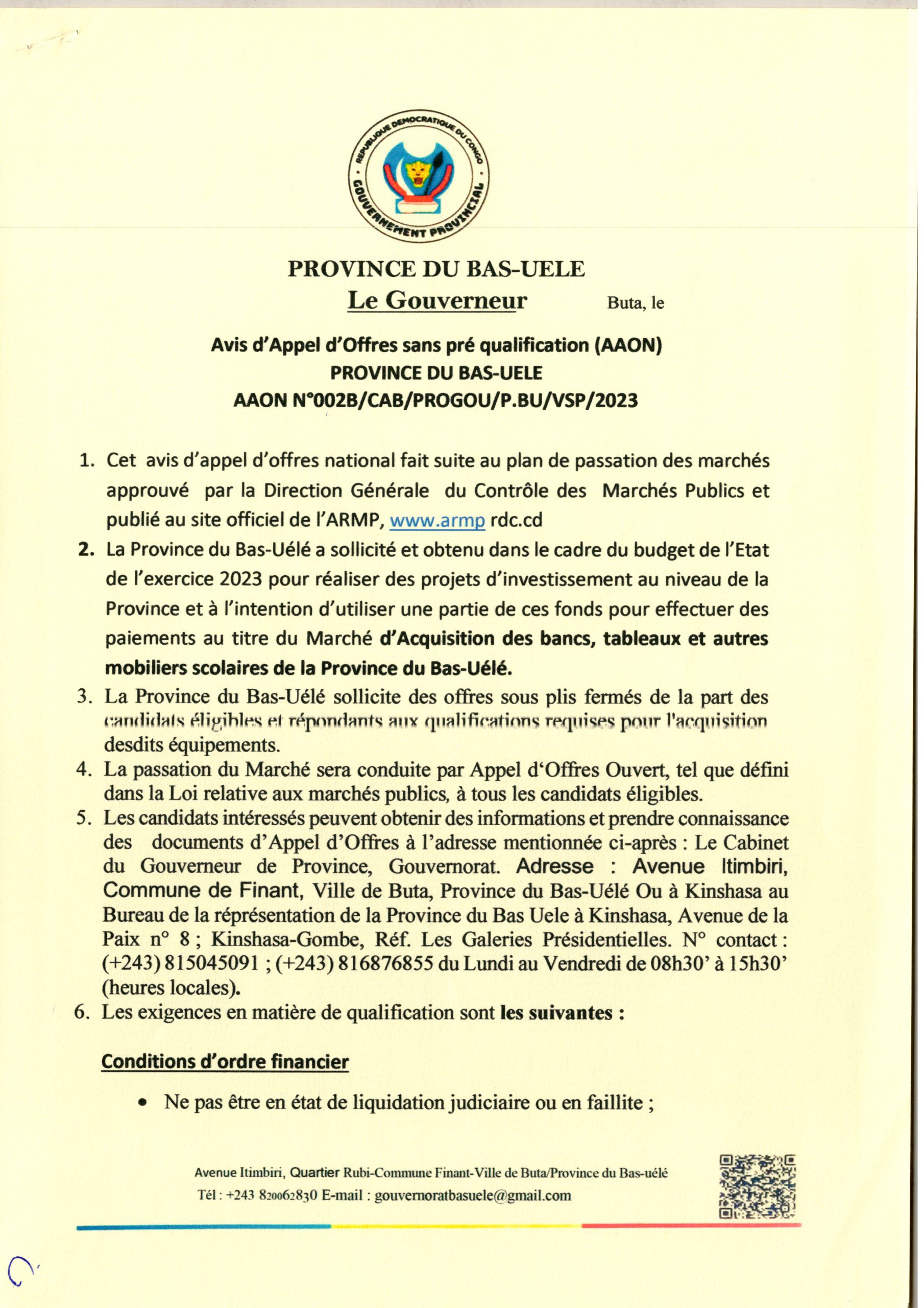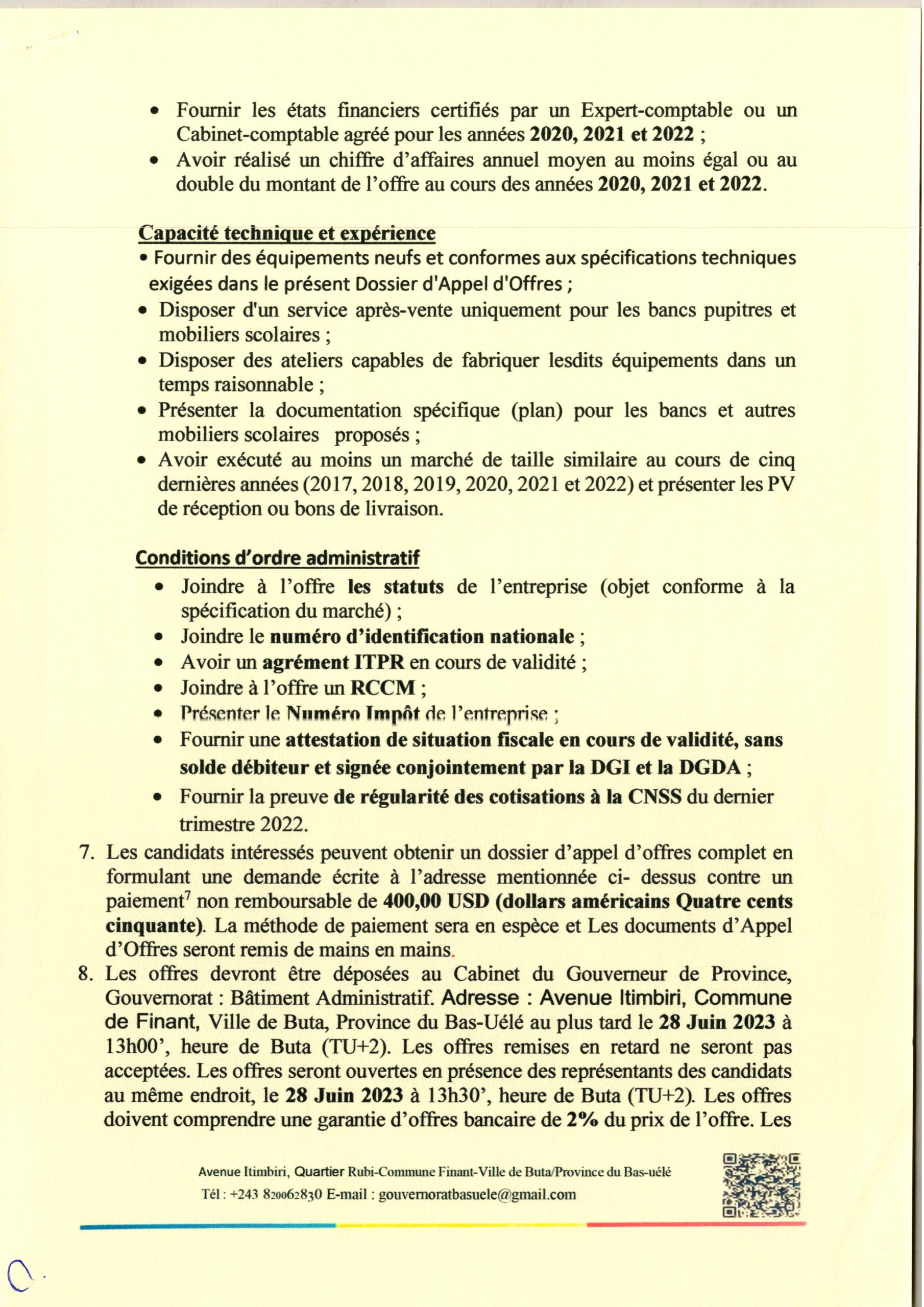 Avis d’appel d’offre de la Province du Bas-Uele relatif au marché d’acquisition des bancs, tableaux et autres mobiliers scolaires de la Province du Bas-Uélé.
