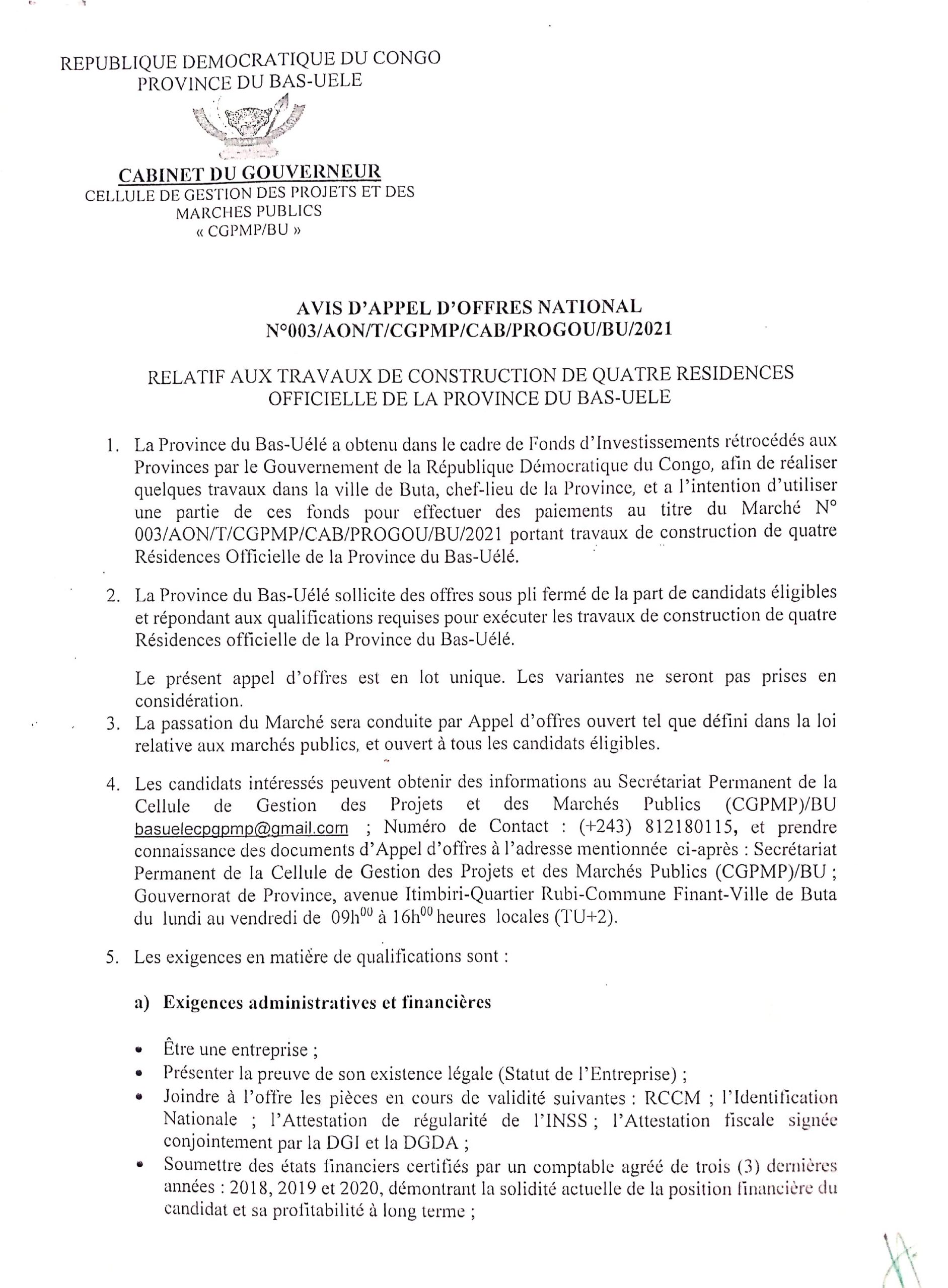 AVIS D’APPEL D’OFFRE NATIONAL RELATIF A LA CONSTRUCTION DE QUATRE RESIDENCES OFFICIELLES DE LA PROVINCE DU BAS-UELE