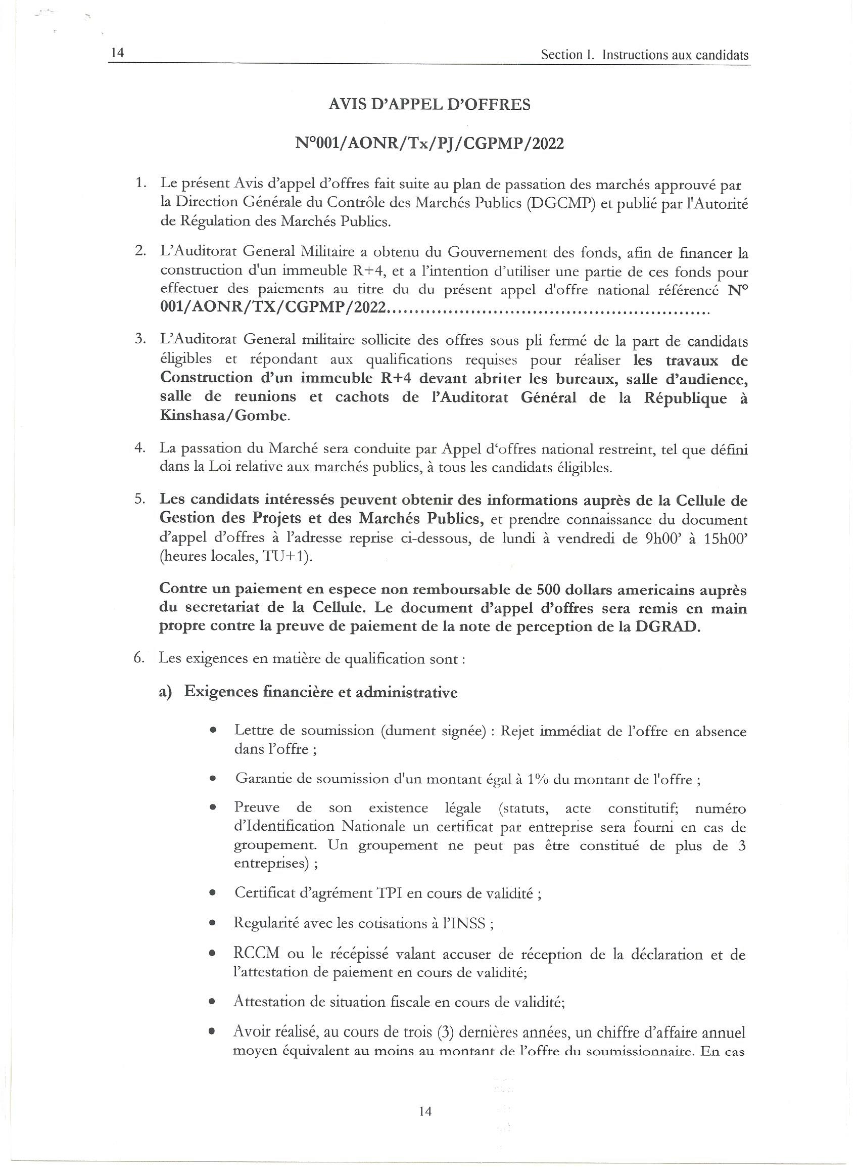 AVIS D’APPEL D’OFFRE POUR LA CONSTRUCTION DU BATIMENT ABRITANT LES BUREAUX DE L’AUDITORAT GENERAL MILITAIRE A KINSHASA-GOMBE.
