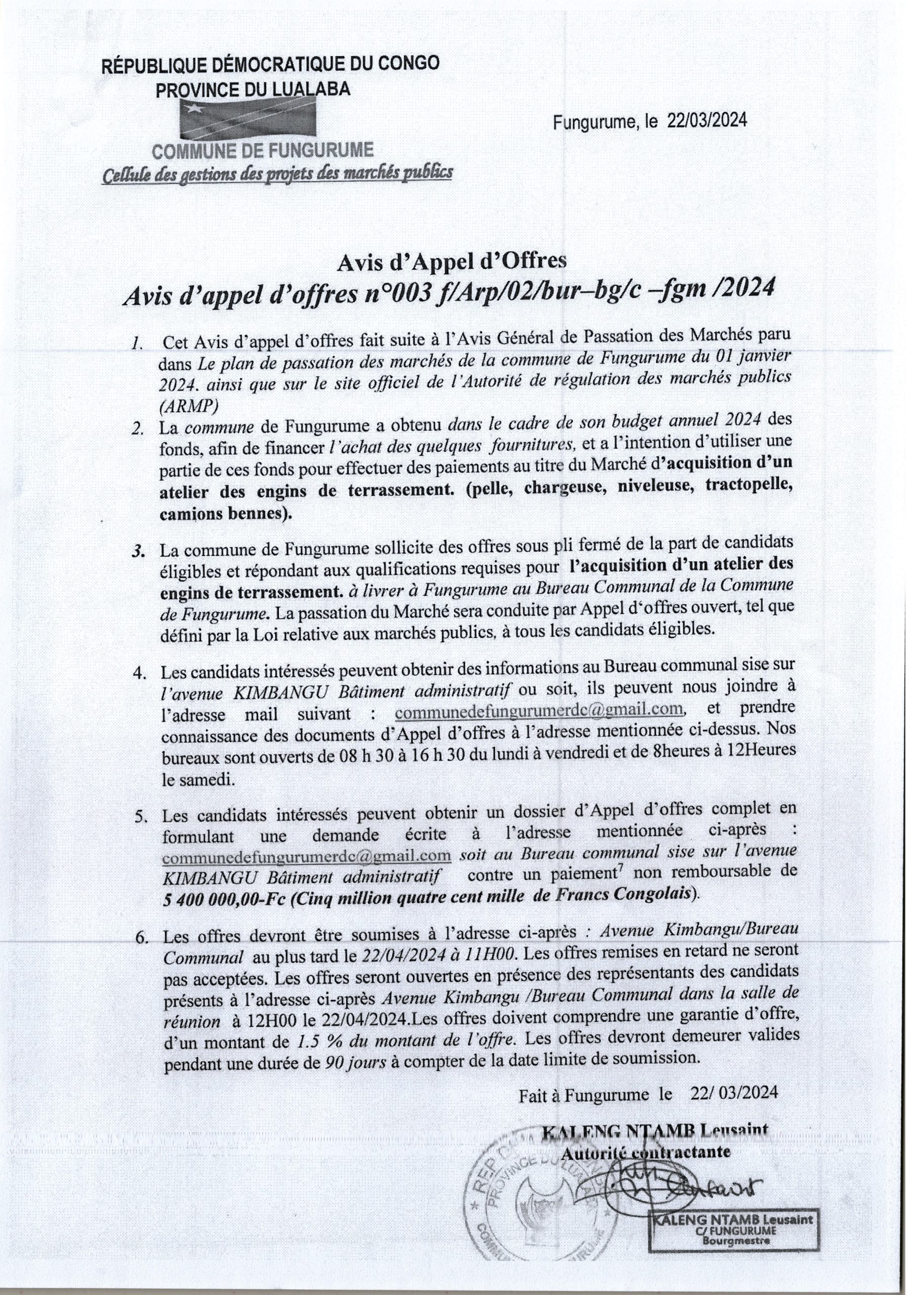 Avis d’appel d’offres de la commune de Fungurume relatif à l’acquisition d’un atelier des engins de terrassement. (pelle, chargeuse, niveleuse, tractopelle, camion bennes)