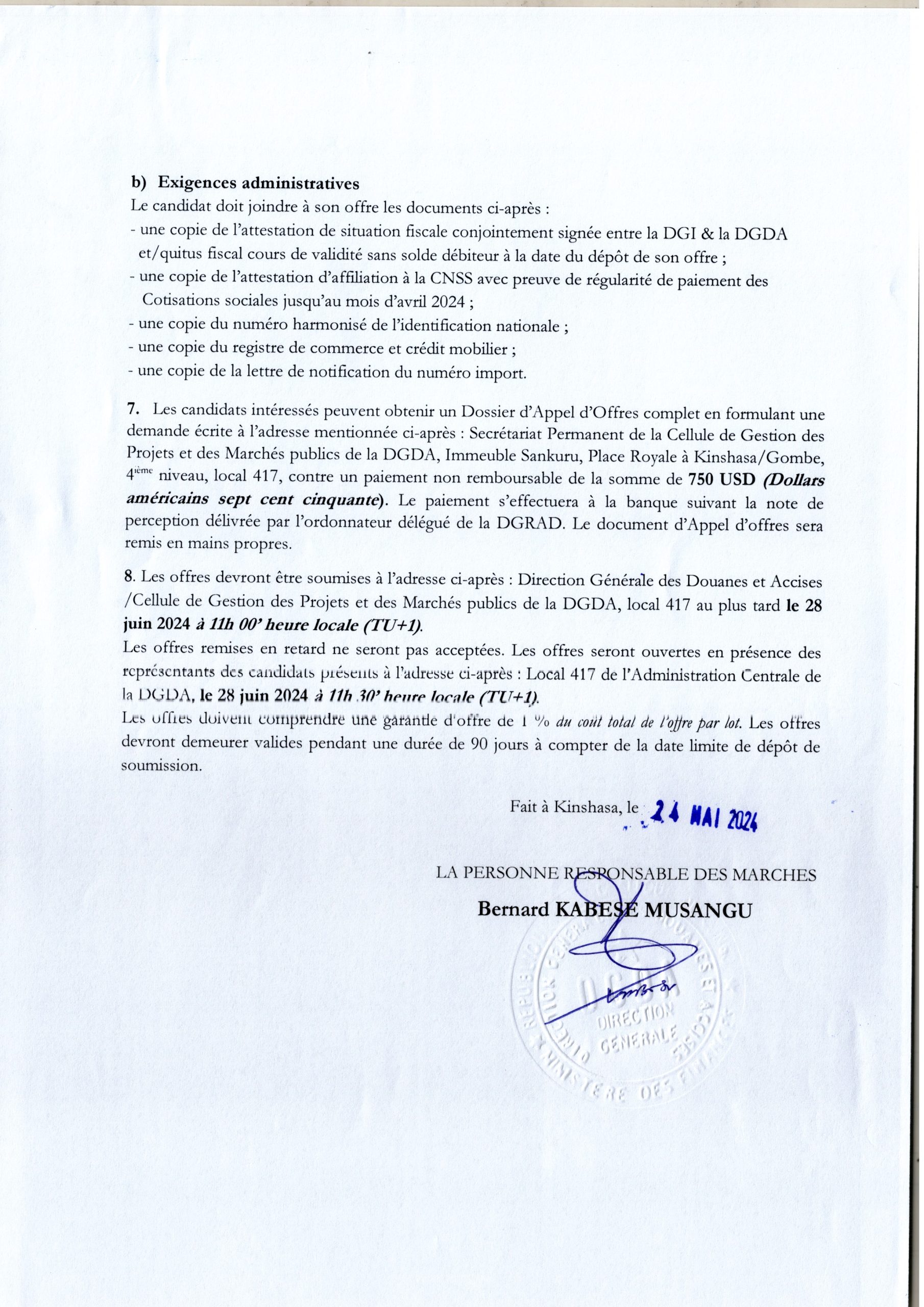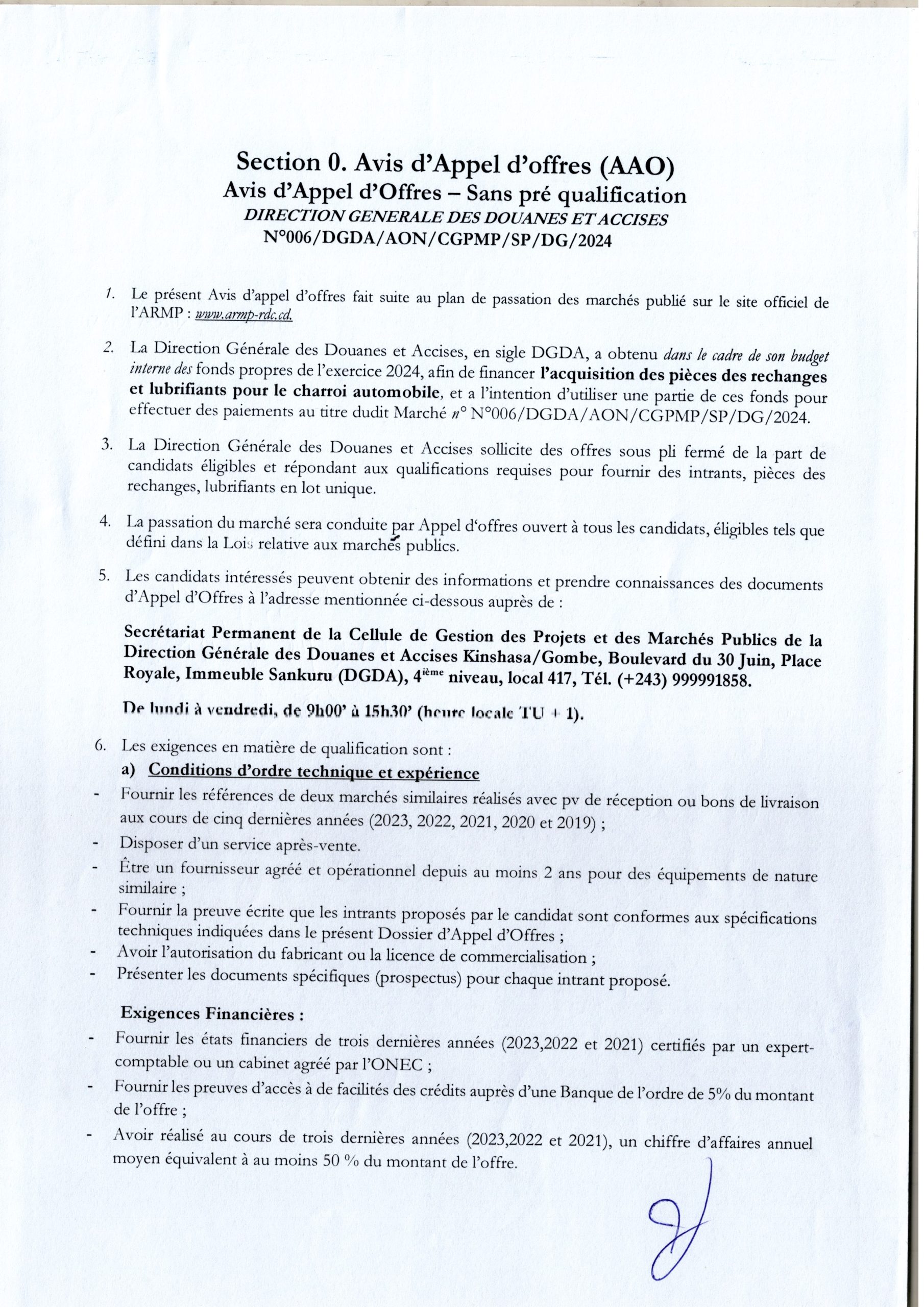 Avis d’appel d’offres de la DGDA relatif à l’acquisition des pièces des rechanges et lubrifiants pour le charroi automobile