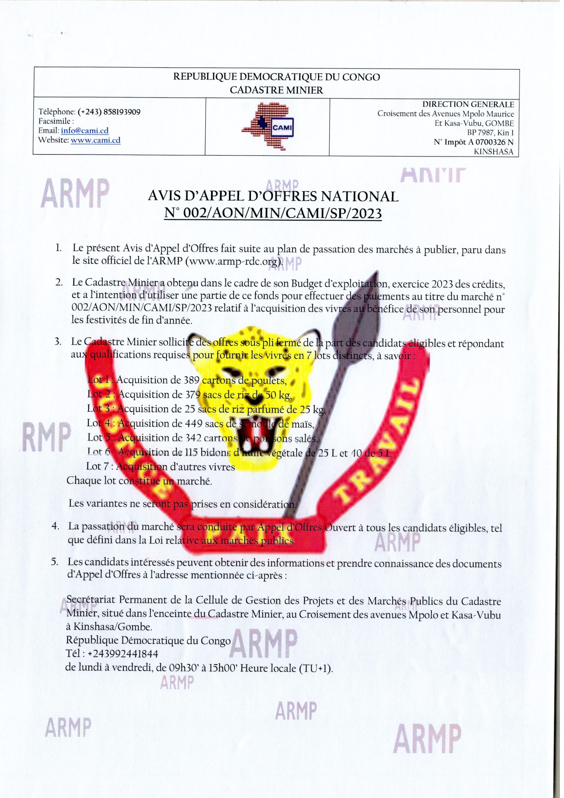 Avis d’appel d’offres du Cadastre Minier relatif à l’acquisition des vivres au bénéfice de son personnel pour les festivités de fin d’année.