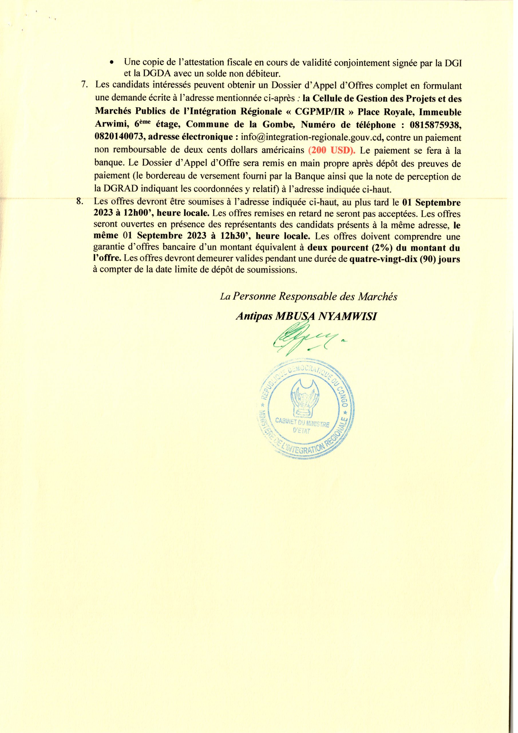 Avis d’Appel d’Offres du Ministère de l’Intégration Régionale relatif à l’acquisition d’un (01) bus pour le Ministère de l’Intégration Régionale.