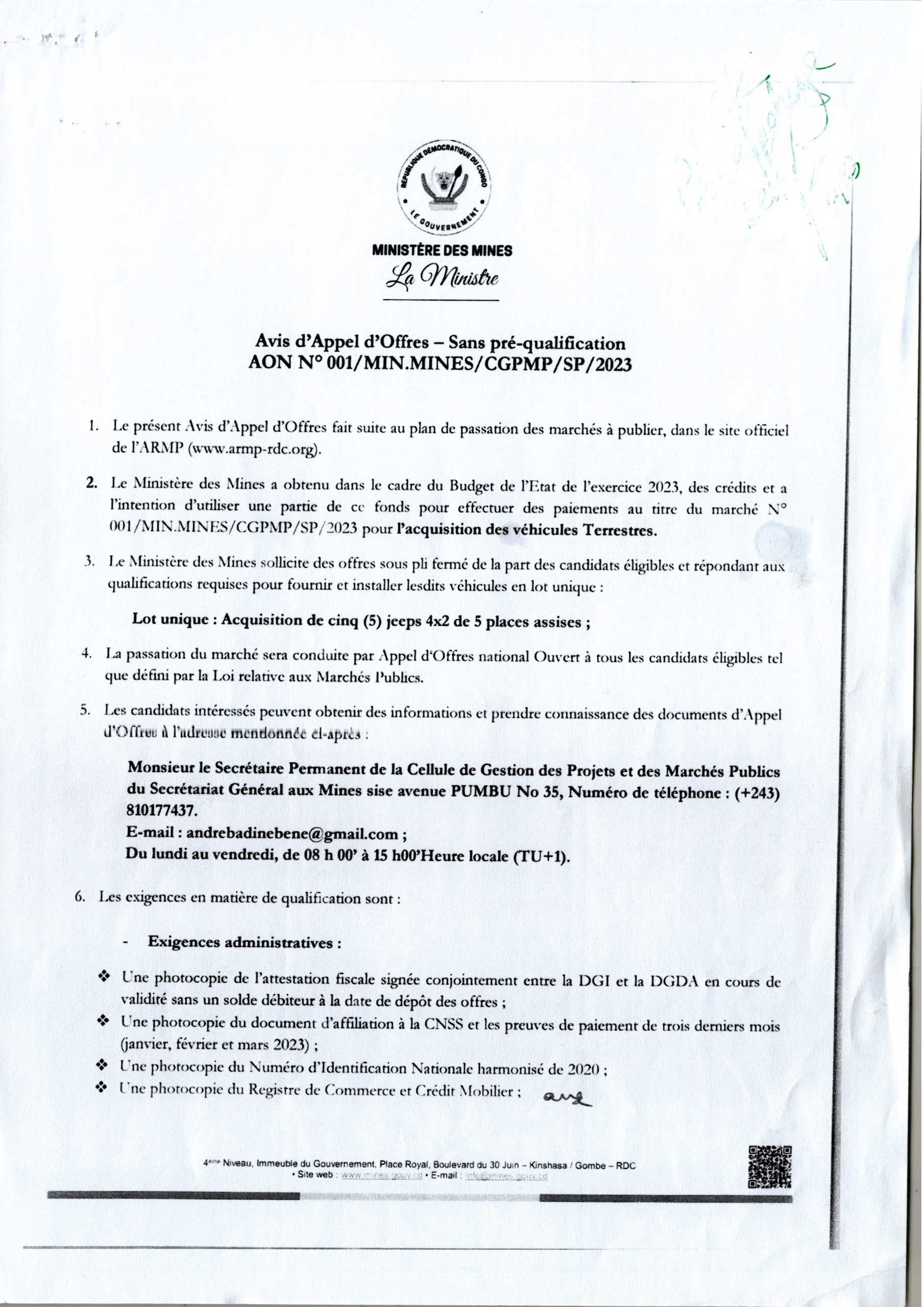 Avis d’appel d’offres du ministère des Mines relatif à l’acquisition des véhicules Terrestres( lot unique).