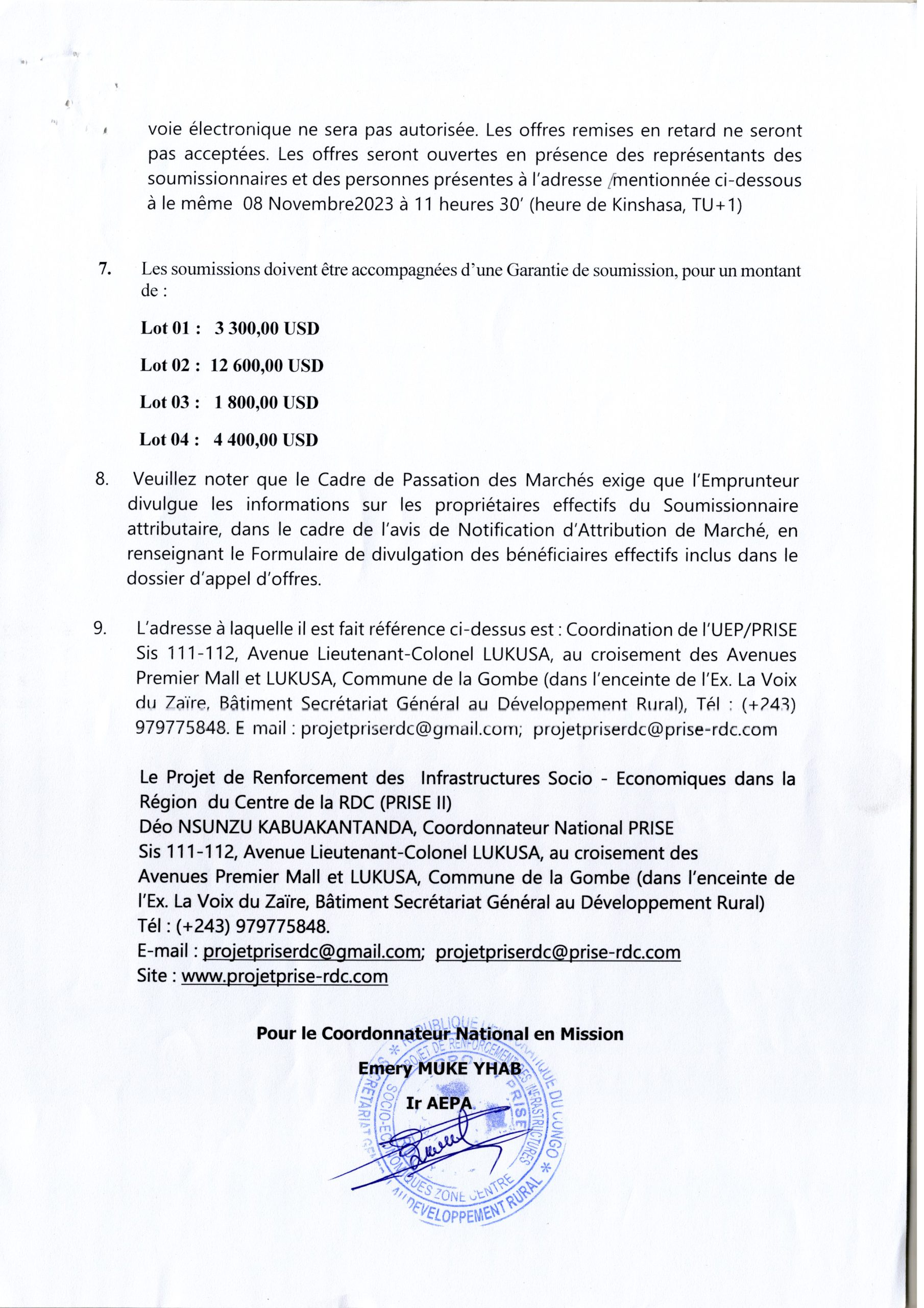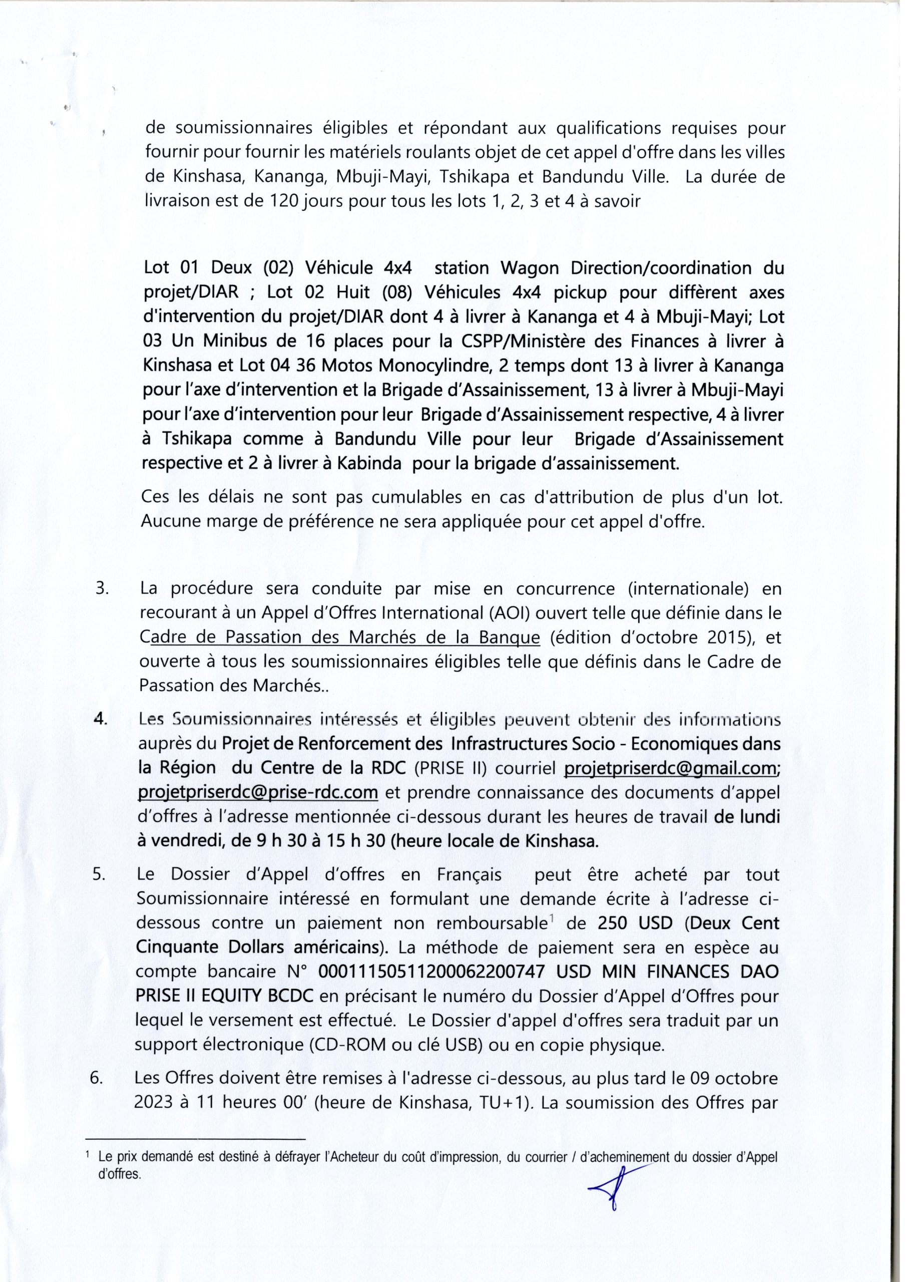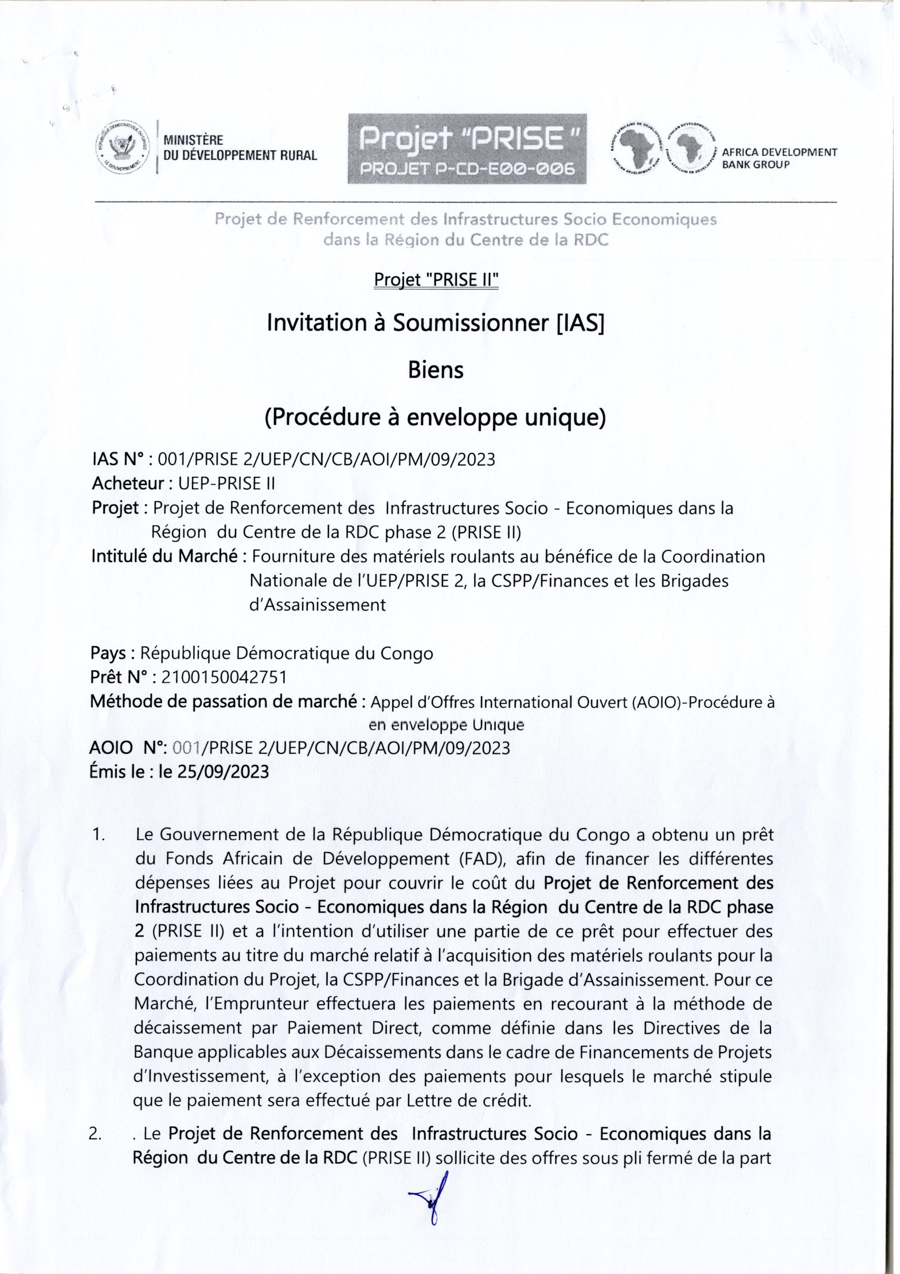 Avis d’appel d’offres du Ministère du Développement Rural (Projet Prise) relatif au marché de Fourniture des matériels roulants au bénéfice de la coordination nationale de l’UEP/PRISE 2, la CSPP/Finances et les Brigades d’Assainissement.