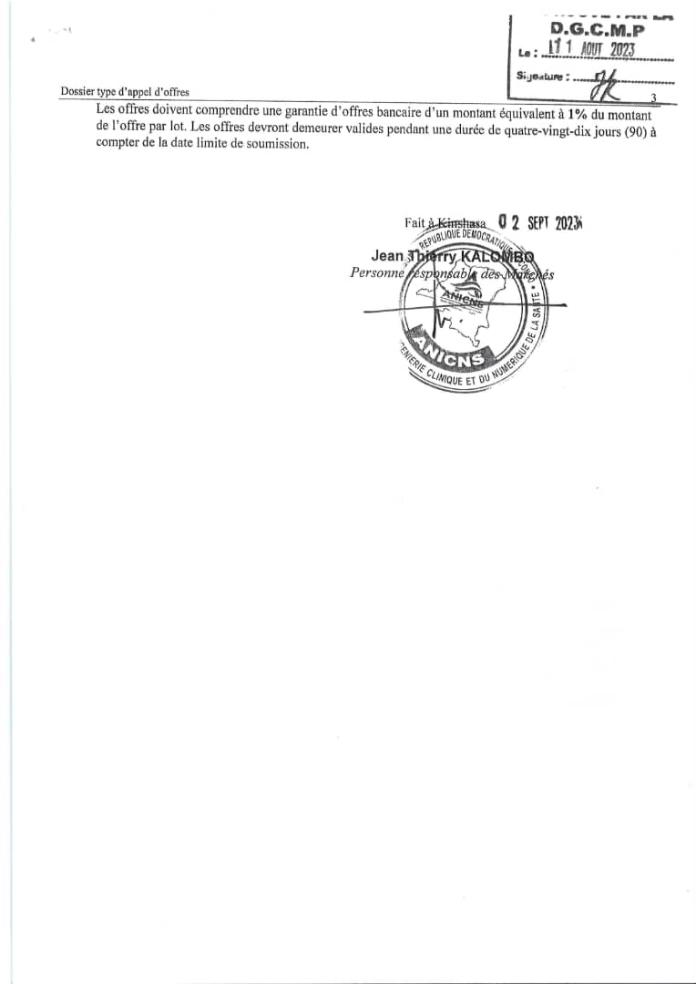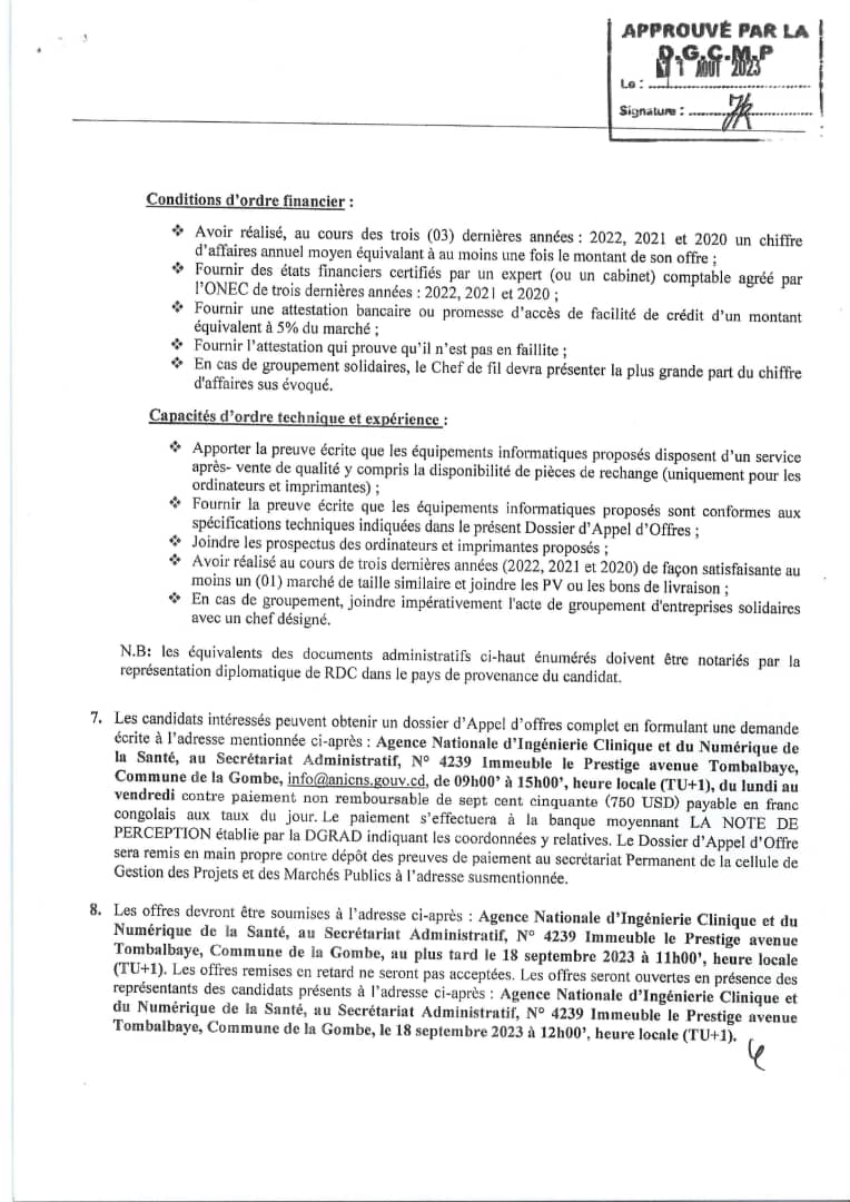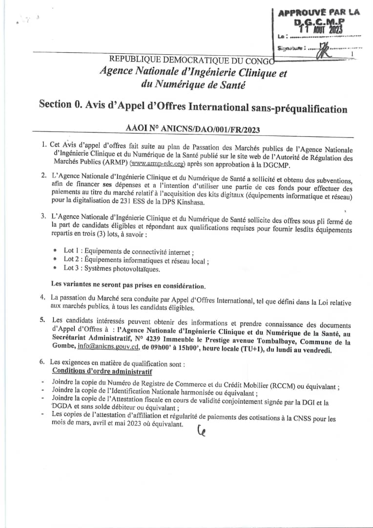 Avis d’appel d’offres International de l’ANICNS relatif à l’acquisition des Kits digitaux (équipements informatique et réseau) pour la digitalisation de 231 ESS de la DPS Kinshasa.