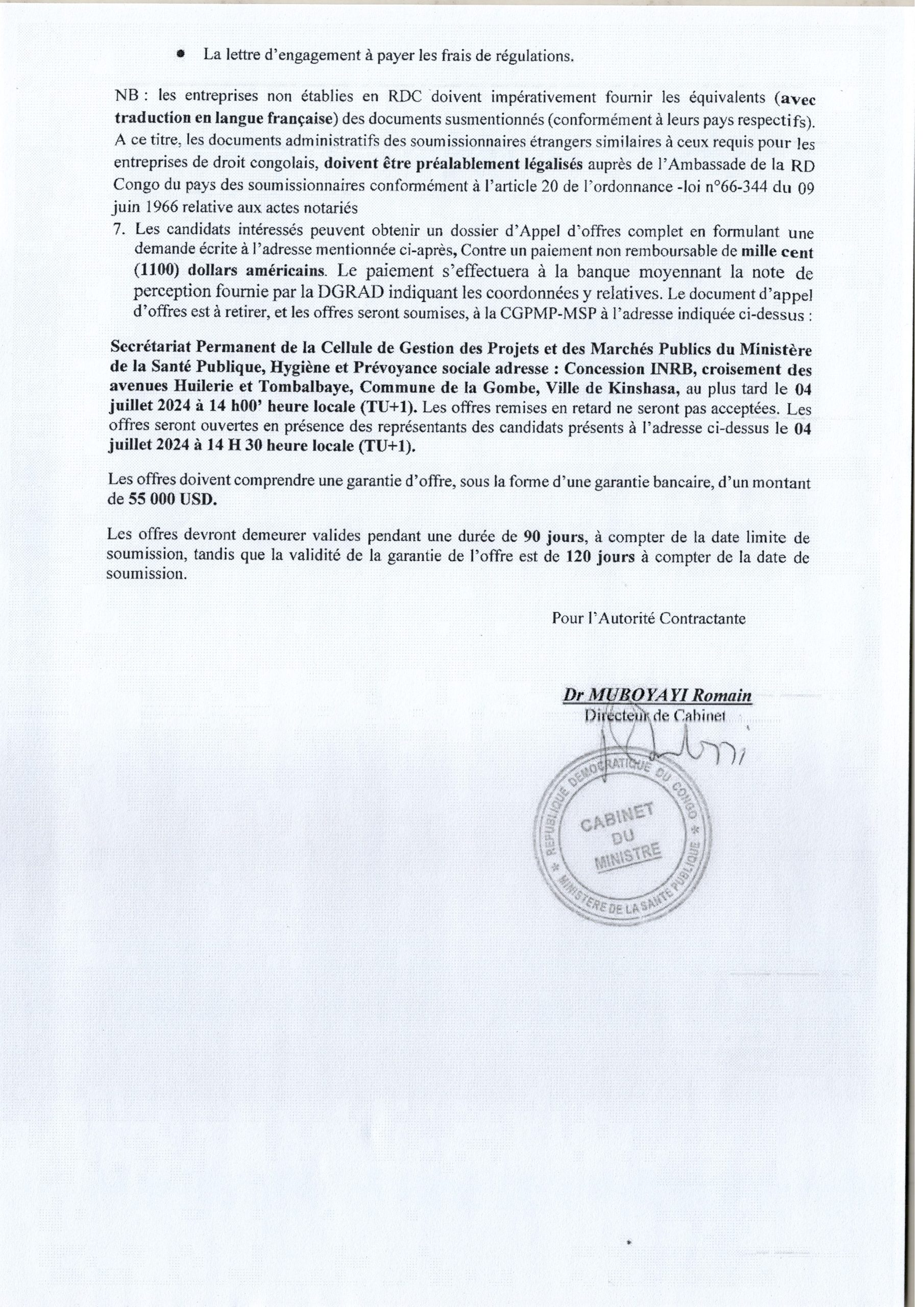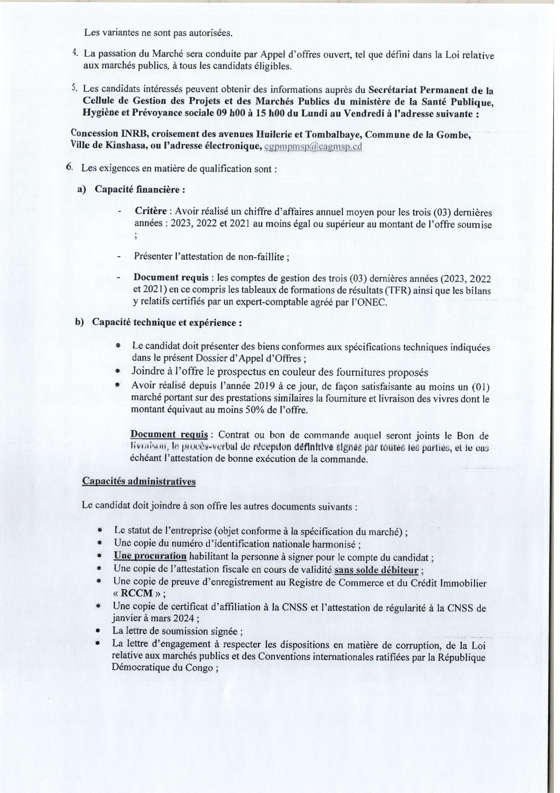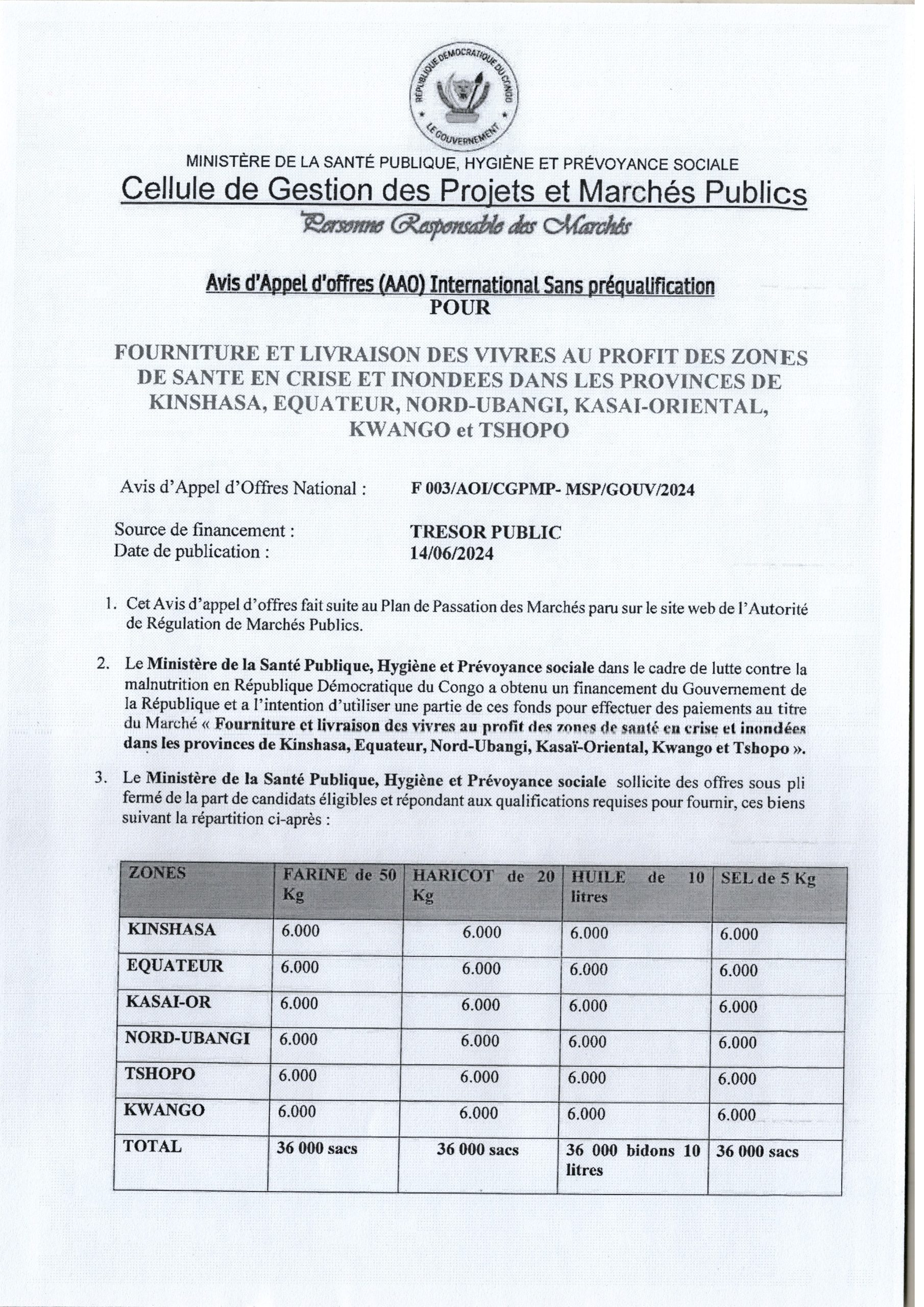 Avis d’appel d’offres International du Ministère de la Santé Publique, Hygiène et Prévoyance Sociale relatif à la fourniture et livraison des vivres au profit des zones de santé en crise et Inondées dans les provinces de Kinshasa, Equateur, Nord-Ubangi, Kasaï-Oriental, Kwango et Tshopo