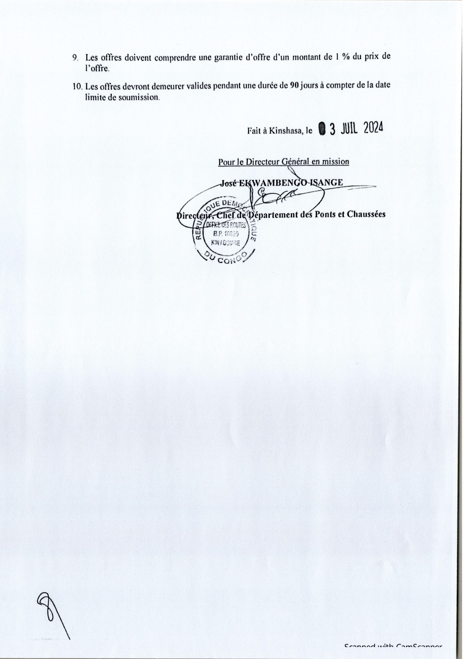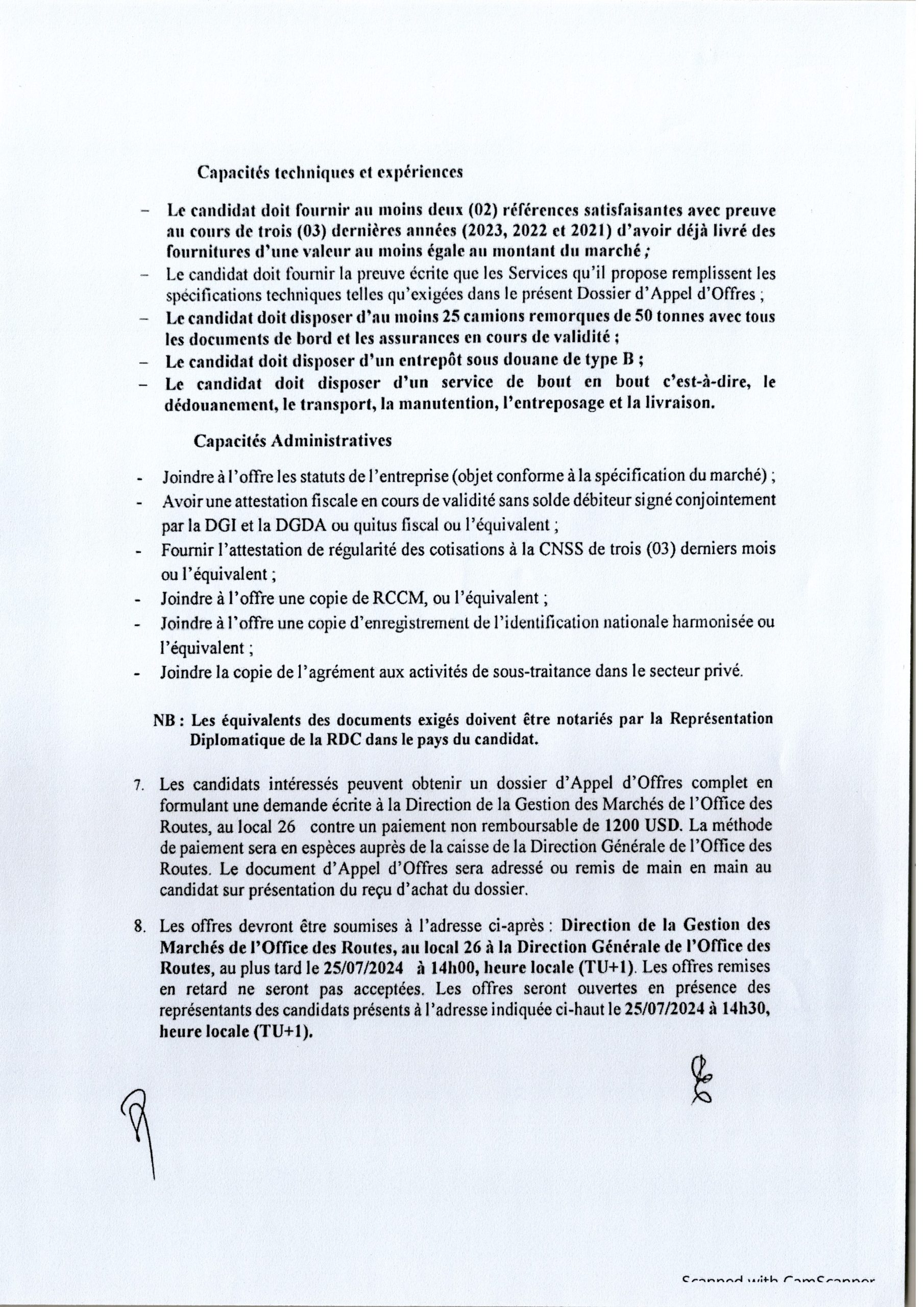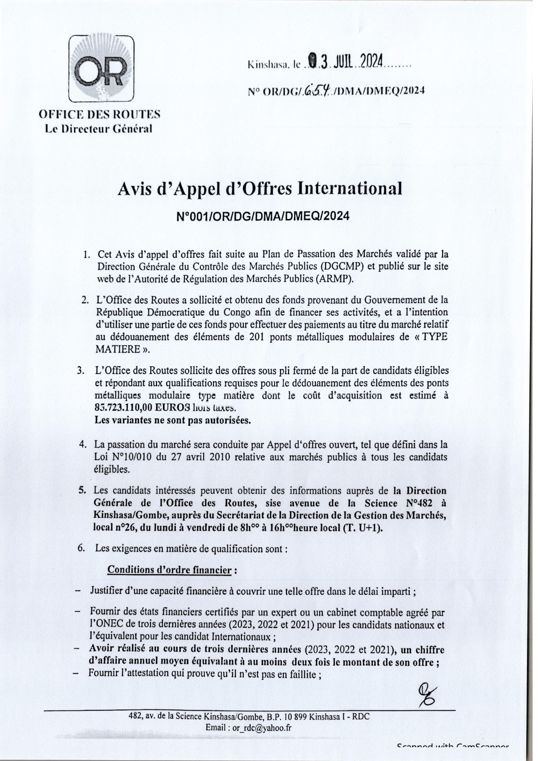 AVIS D’APPEL D’OFFRES INTERNATIONAL RELATIF AU DÉDOUANEMENT DES ÉLÉMENTS DE 201 PONTS MÉTALLIQUES MODULAIRES DE “TYPE MATIERE”.