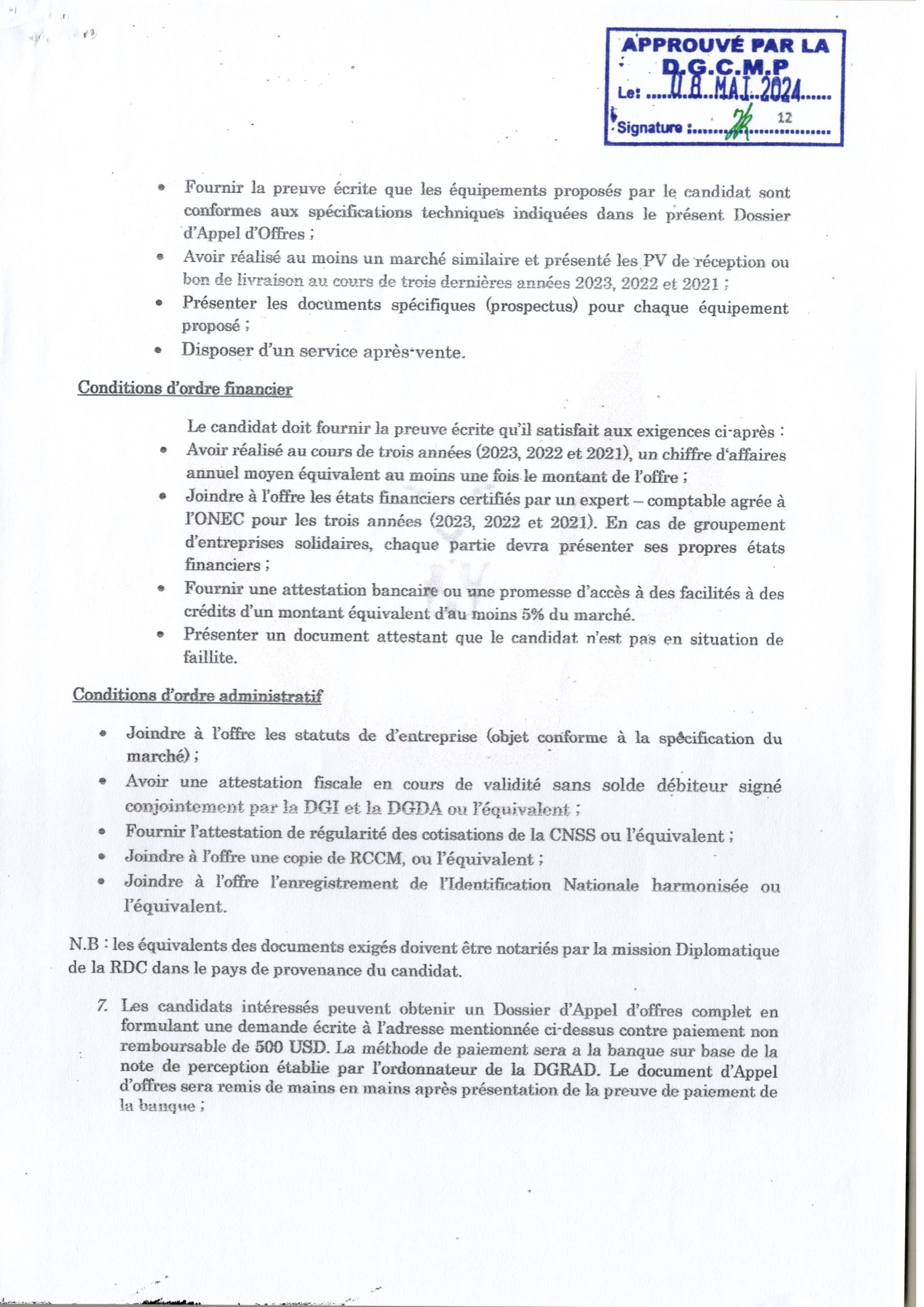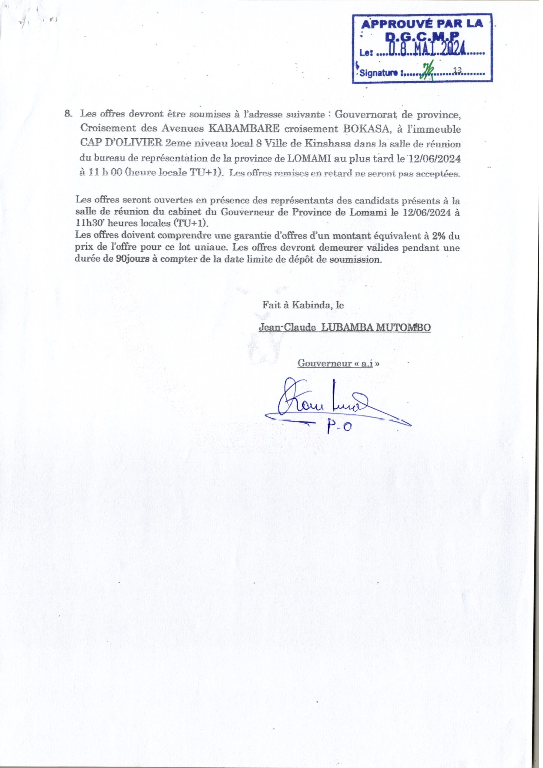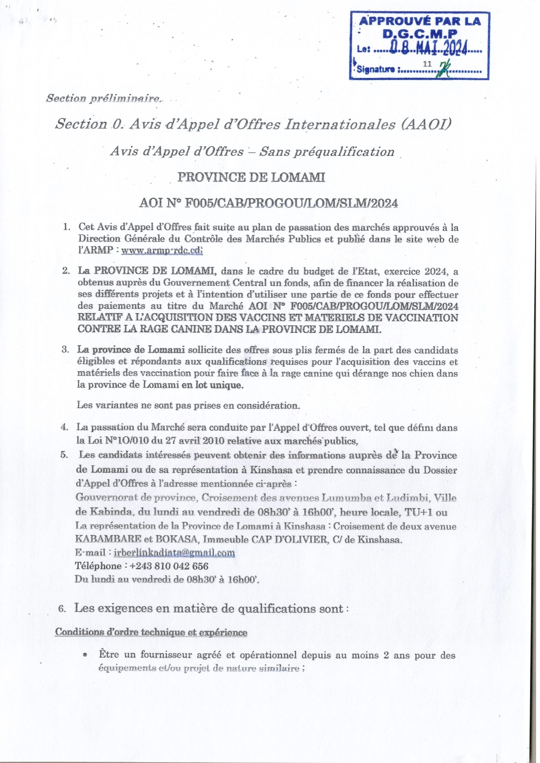 AVIS D’APPEL D’OFFRES INTERNATIONAL SANS PRÉ-QUALIFICATION RELATIF À L’ ACQUISITION DES VACCINS ET MATÉRIELS DE VACCINATION CONTRE LA RAGE CANINE DANS LA PROVINCE DE LOMAMI.