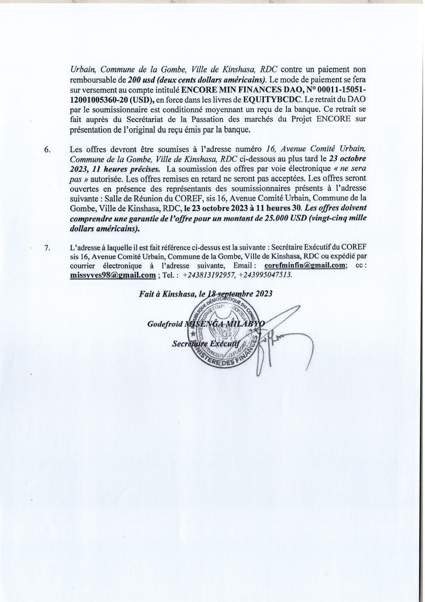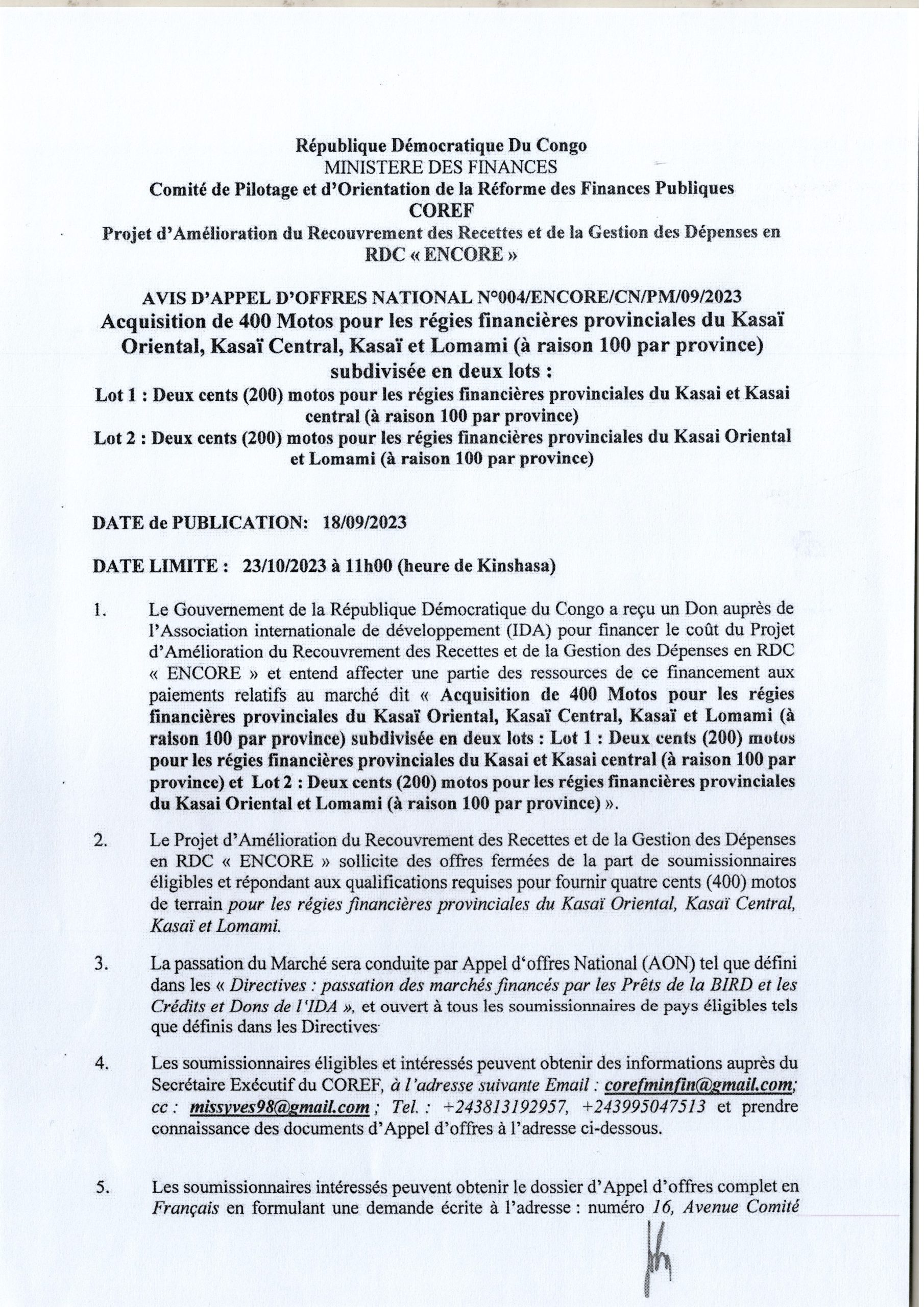 Avis d’appel d’offres national de la COREF relatif à l’acquisition de 400 Motos pour les régies financières provinciales du Kasaï Oriental, Kasaï Central, Kasaï et Lomami (à raison 100 par province) lot 1 et lot 2.