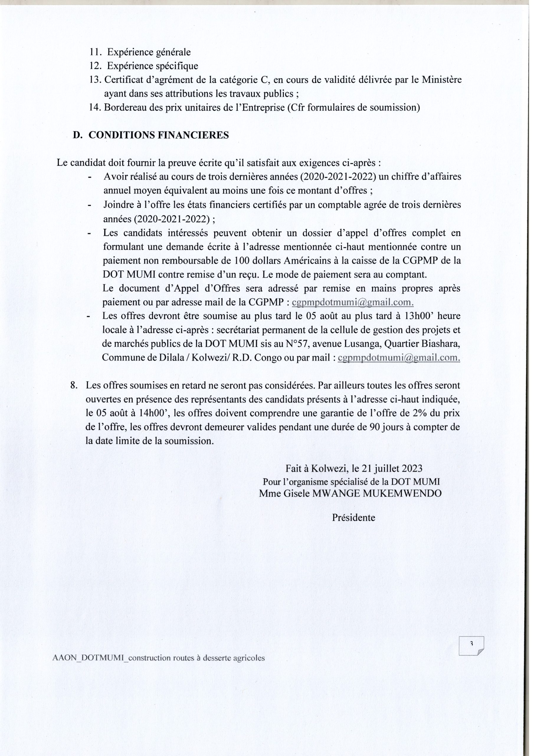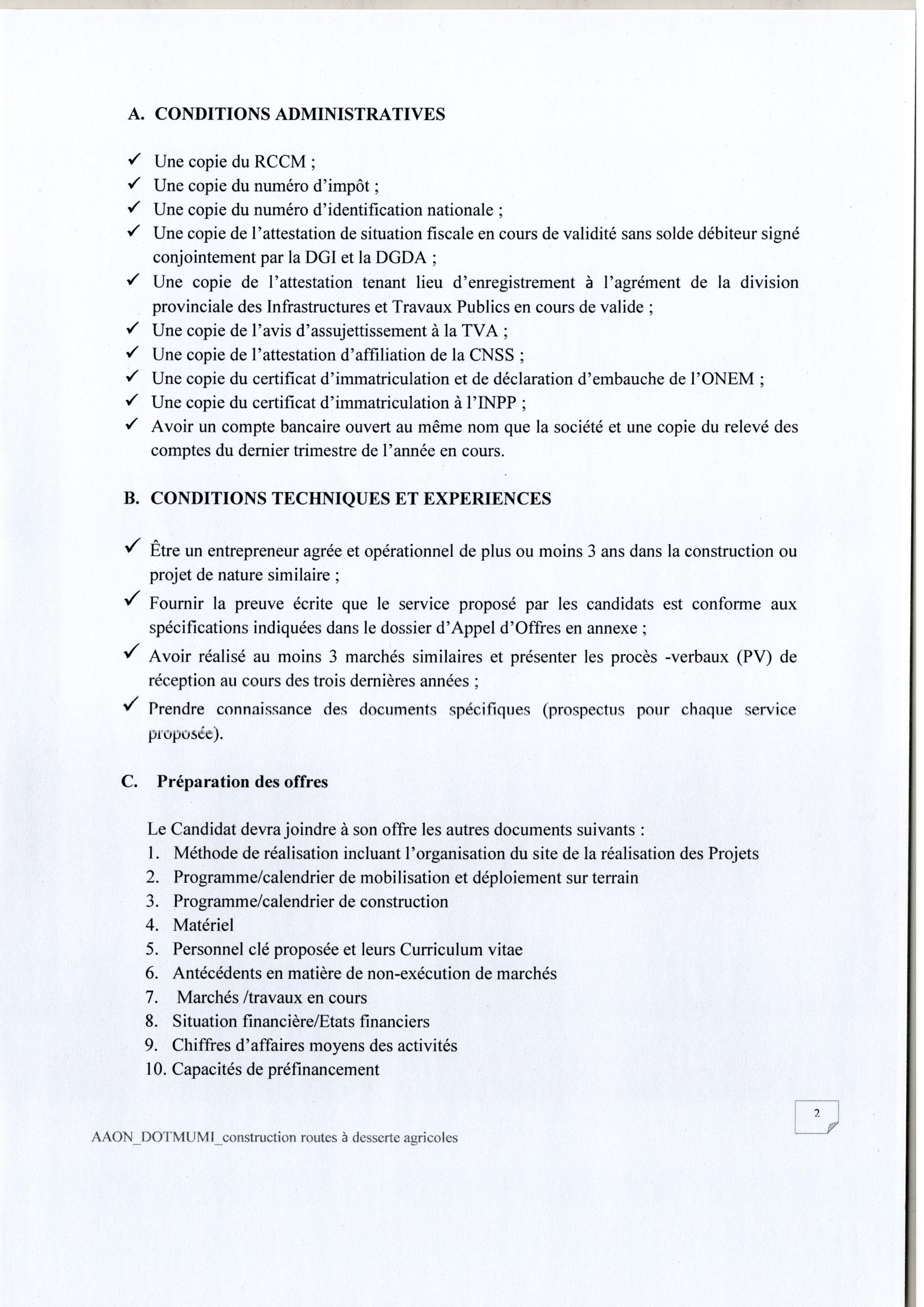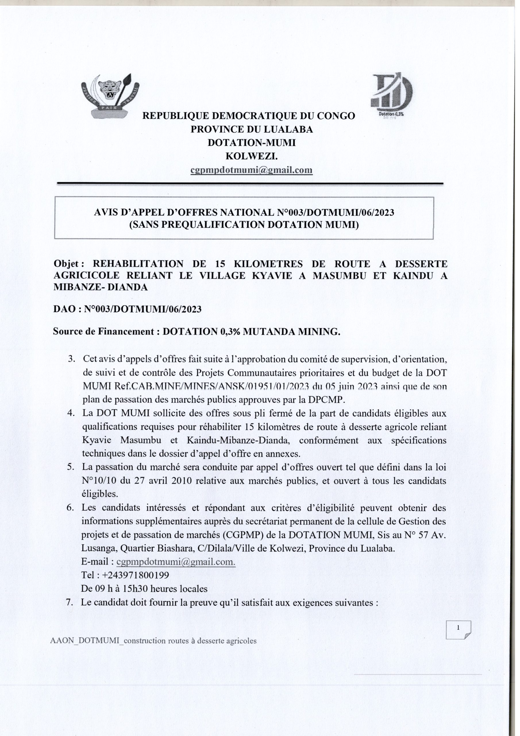 Avis d’appel d’offres National de la Dotation-MUMI relatif à la Réhabilitation de 15 Kilomètres de Route à desserte Agricole reliant le Village Kyavie à Masumbu et Kaindu à Mibanze-Dianda.