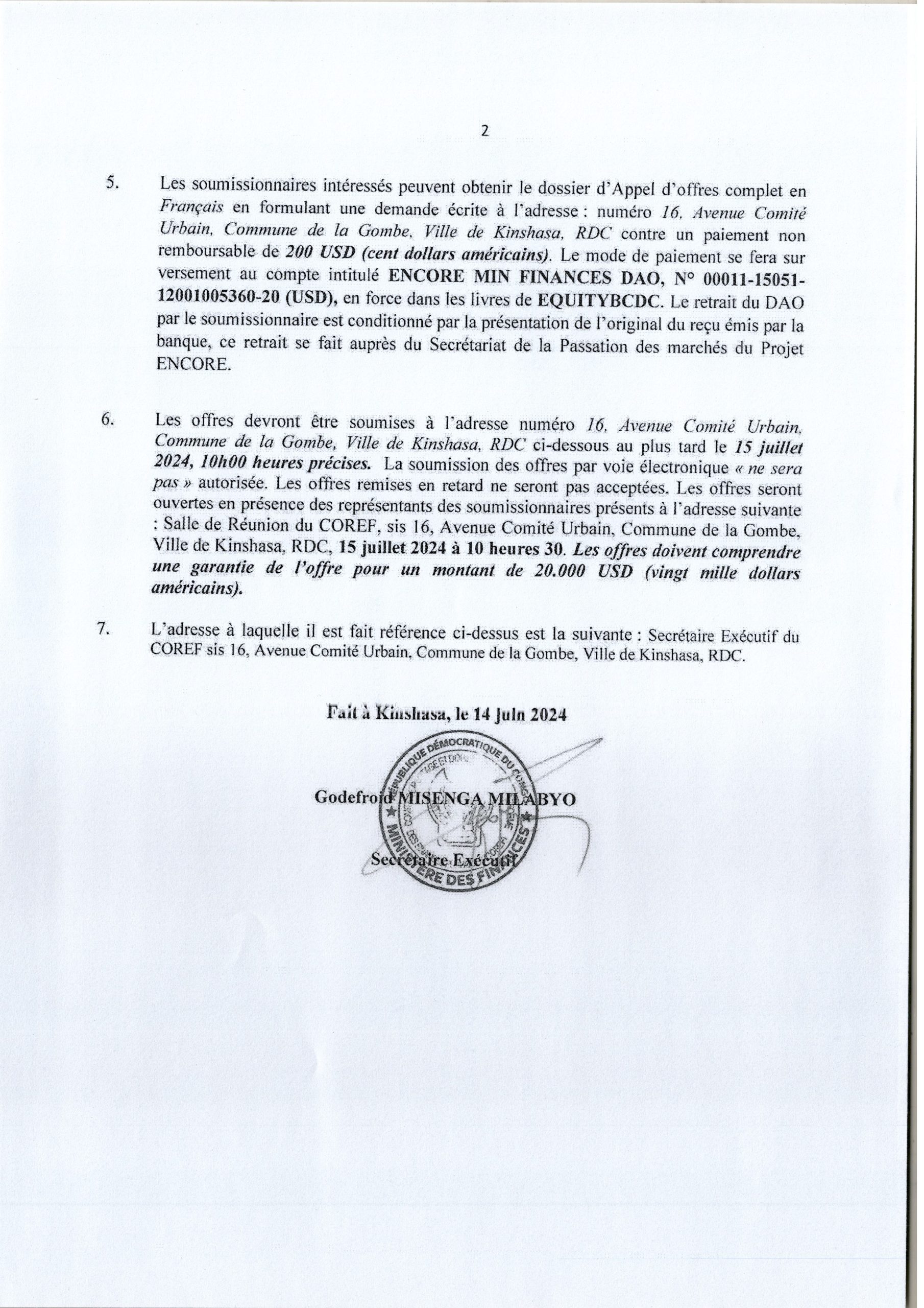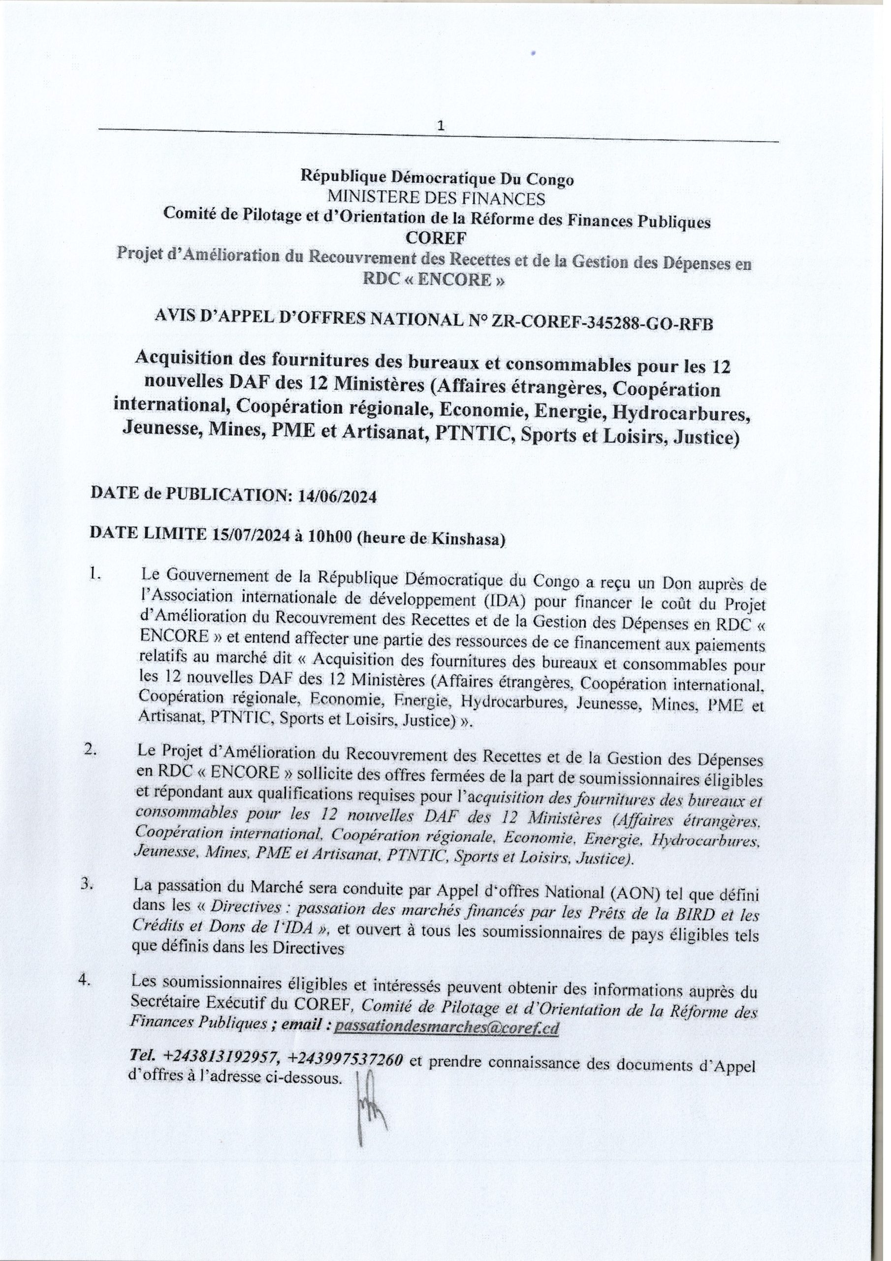 Avis d’Appel d’Offres National du COREF relatif à l’acquisition des fournitures des bureaux et consommables pour les 12 nouvelles DAF des 12 Ministères (Affaires étrangères, Coopération international, Coopération régionale, Economie, Energie, Hydrocarbures, Jeunesse, Mines, PME et Artisanat, PTNTIC, Sports et Loisirs, Justice)