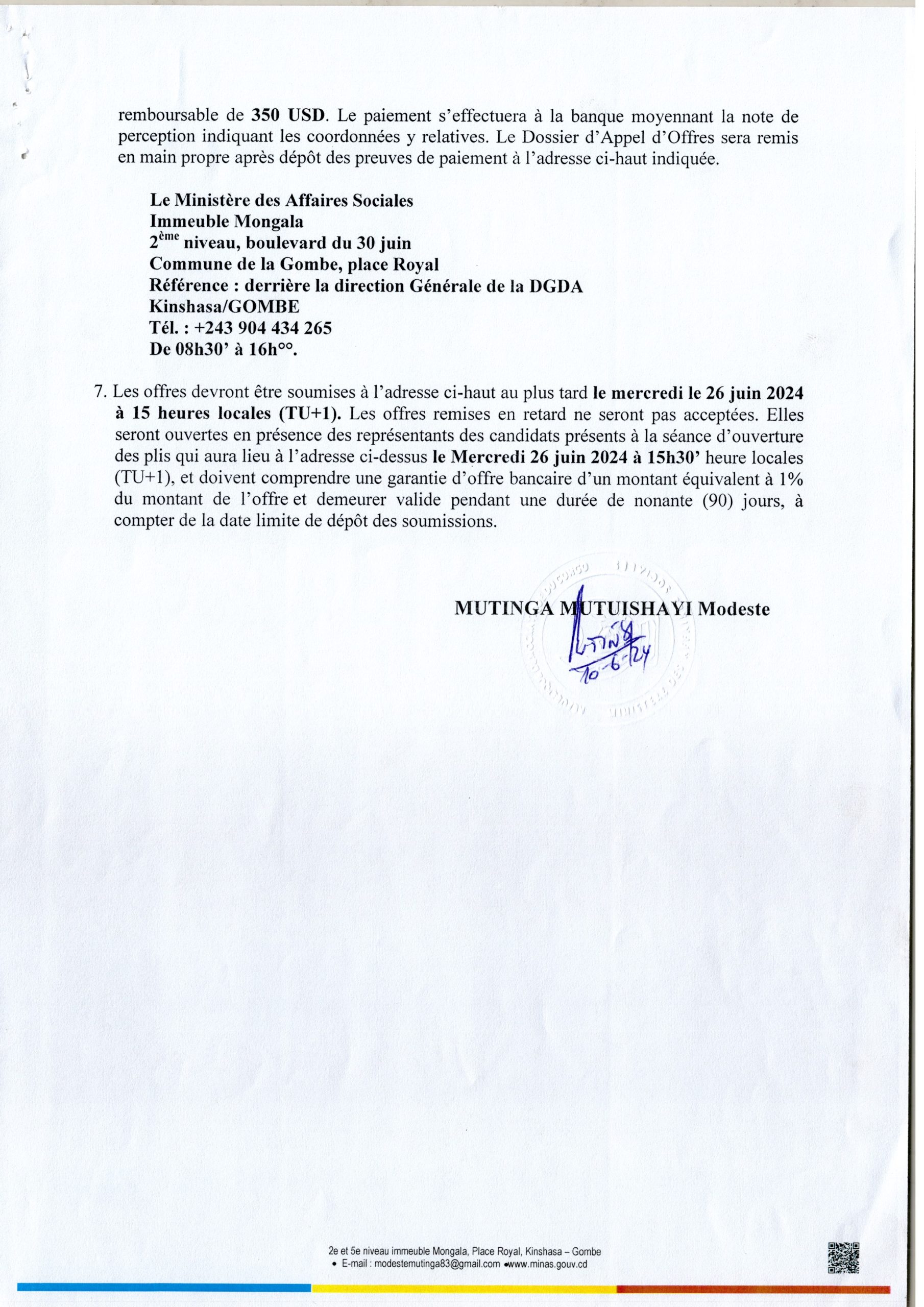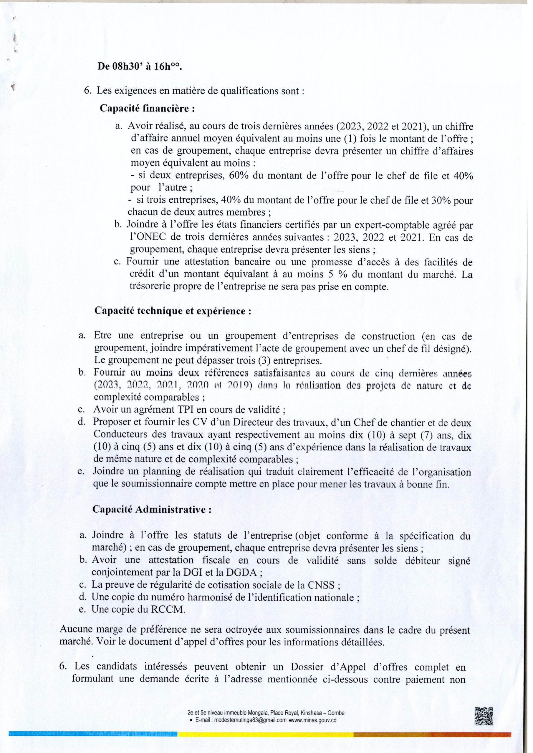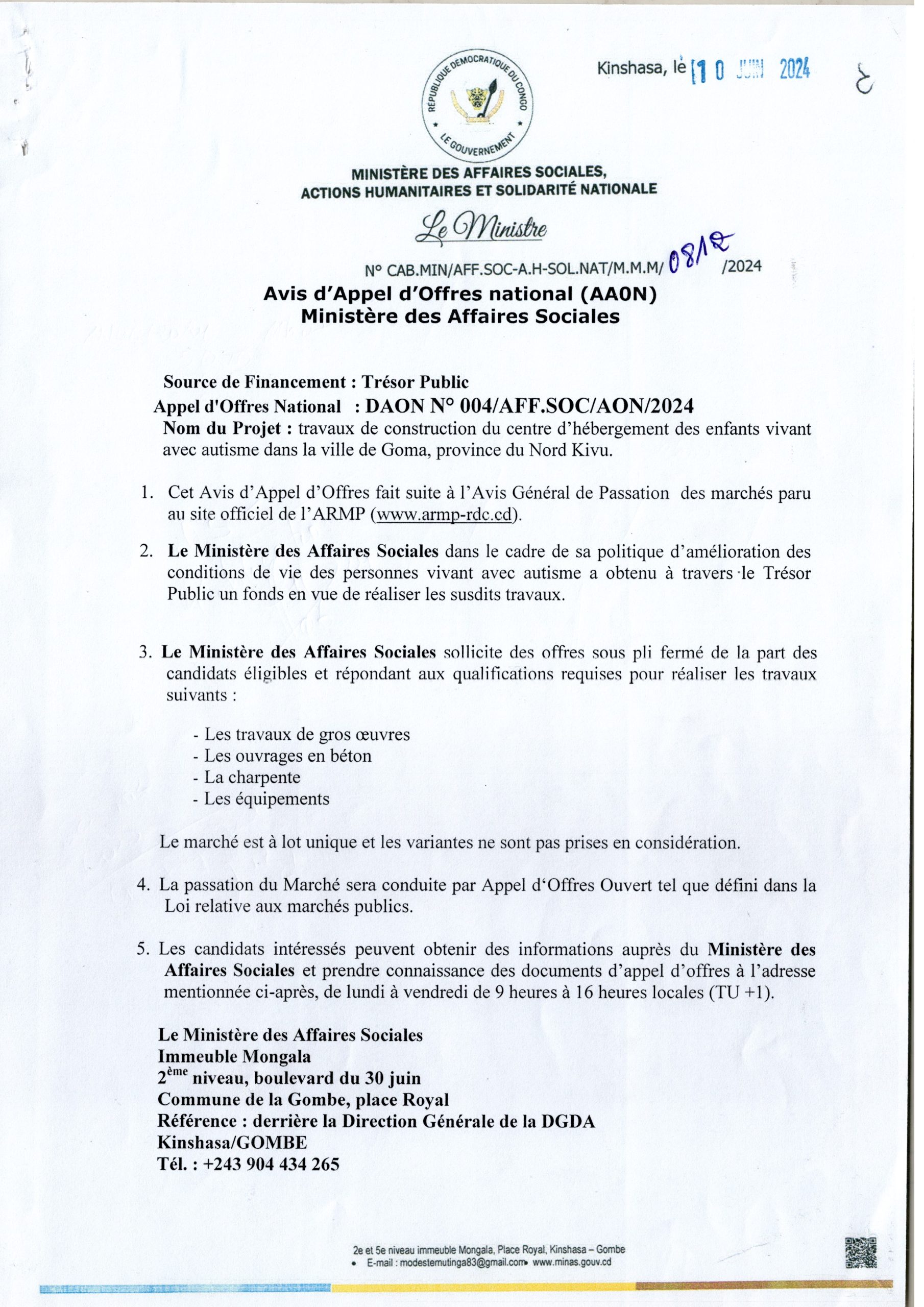 Avis d’appel d’offres national du Ministère des Affaires Sociales relatif aux travaux de construction du centre d’hébergement des enfants vivant avec autisme dans la ville de Goma, province du Nord Kivu.