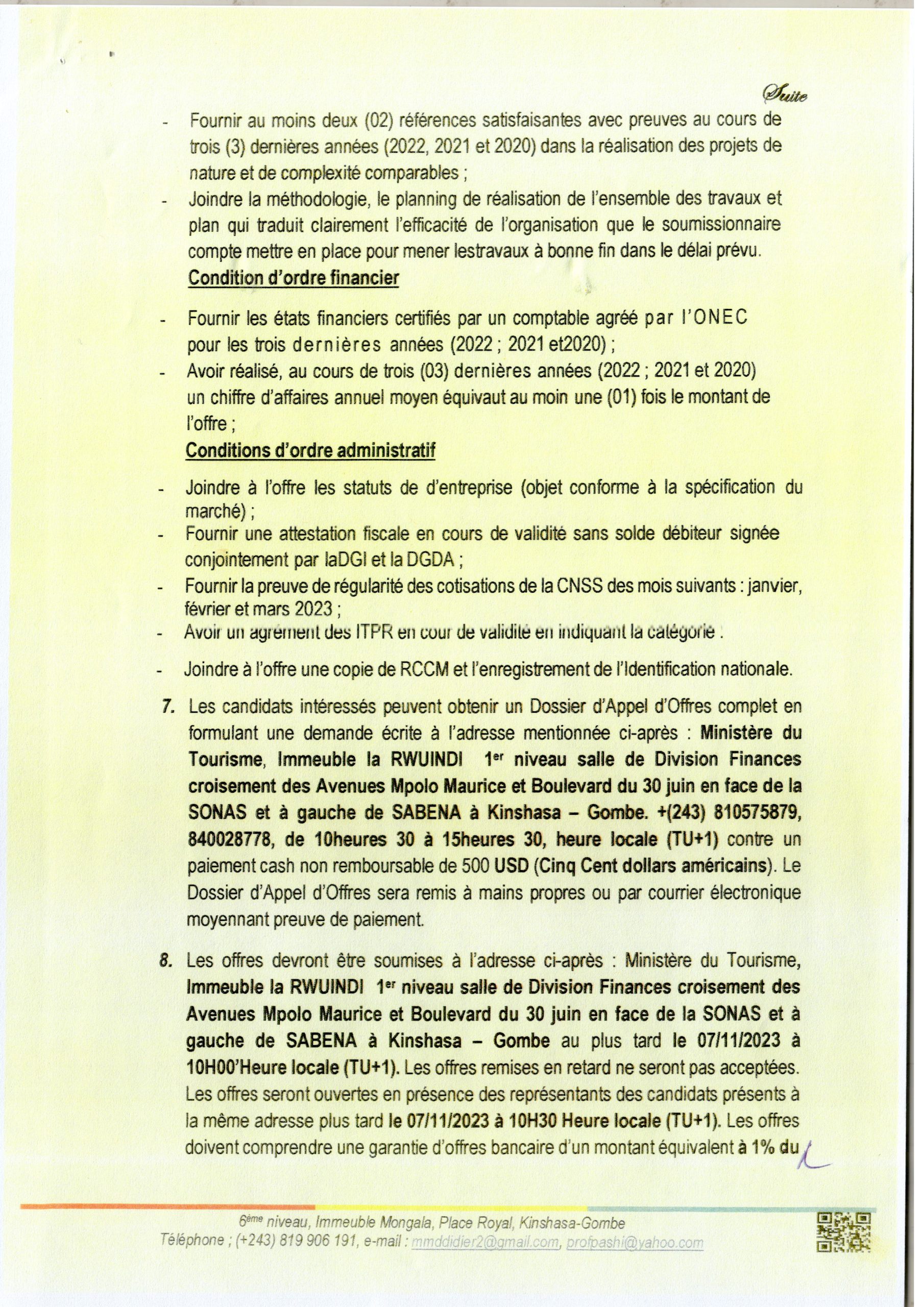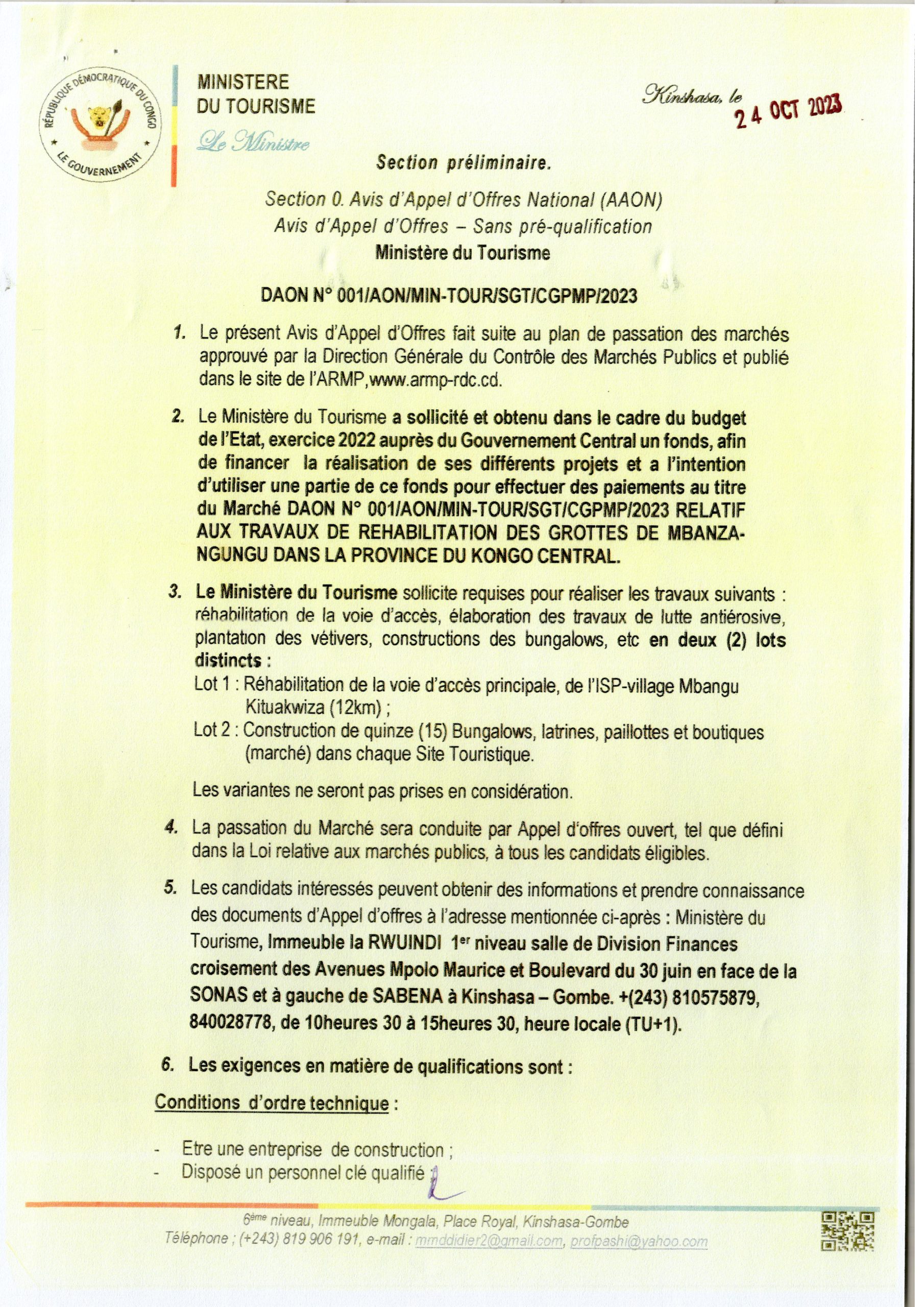 Avis d’appel d’offres national du ministère du Tourisme relatif aux travaux de réhabilitation des Grottes de Mbanza-Ngungu dans la Province du Kongo Central.