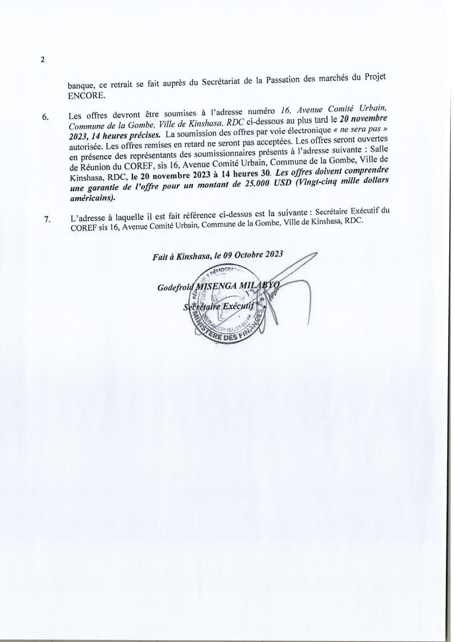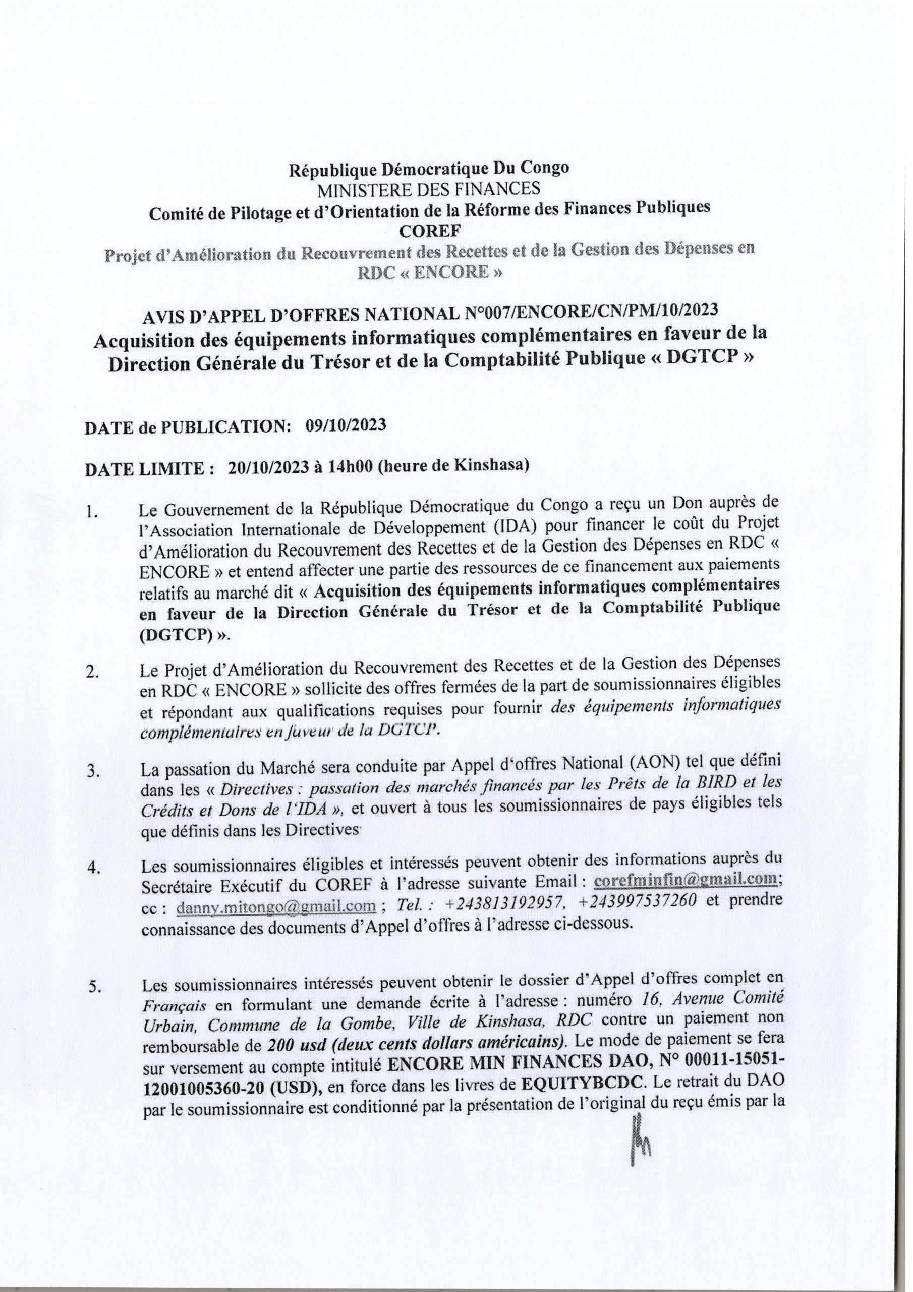 Avis d’appel d’offres National relatif à l’acquisition des équipements informatiques complémentaires en faveur de la Direction Générale du Trésor et de la Comptabilité Publique “DGTCP”.