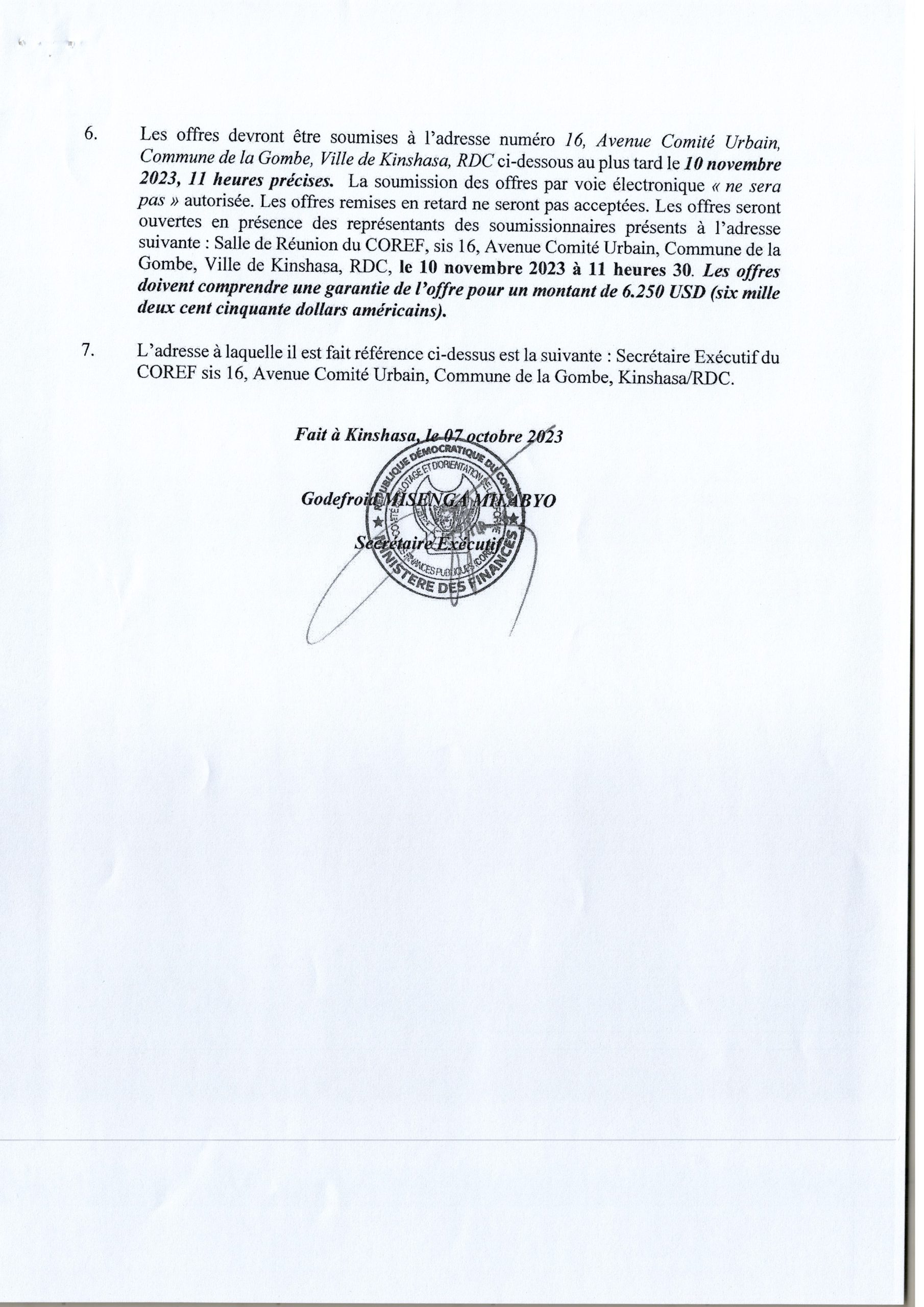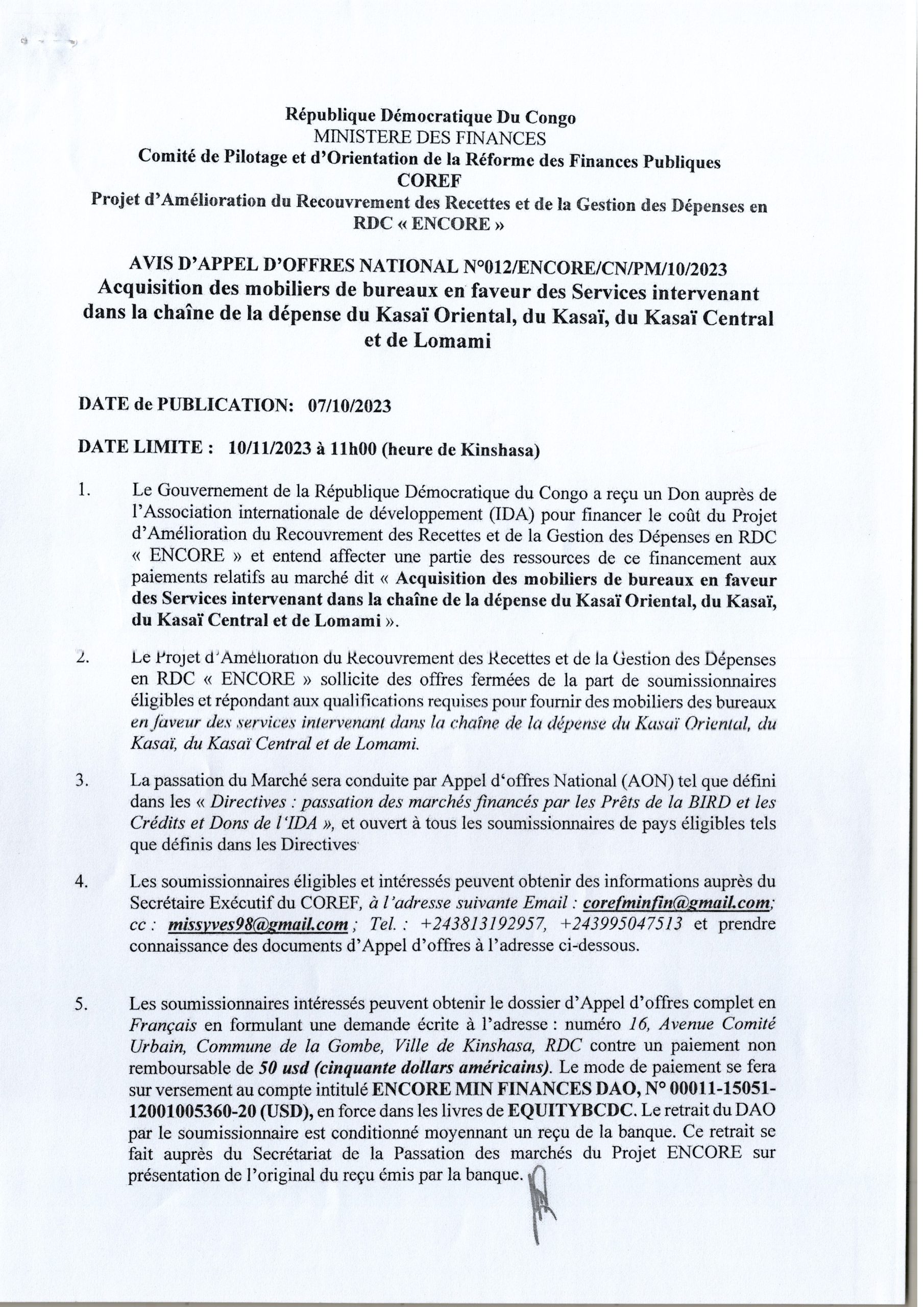 AVIS D’APPEL D’OFFRES NATIONAL RELATIF À L’ACQUISITION DES MOBILIERS DE BUREAUX EN FAVEUR DES SERVICES INTERVENANT DANS LA CHAINE DE LA DÉPENSE DU KASAÏ ORIENTAL, DU KASAÏ, DU KASAÏ CENTRAL ET DE LOMAMI.