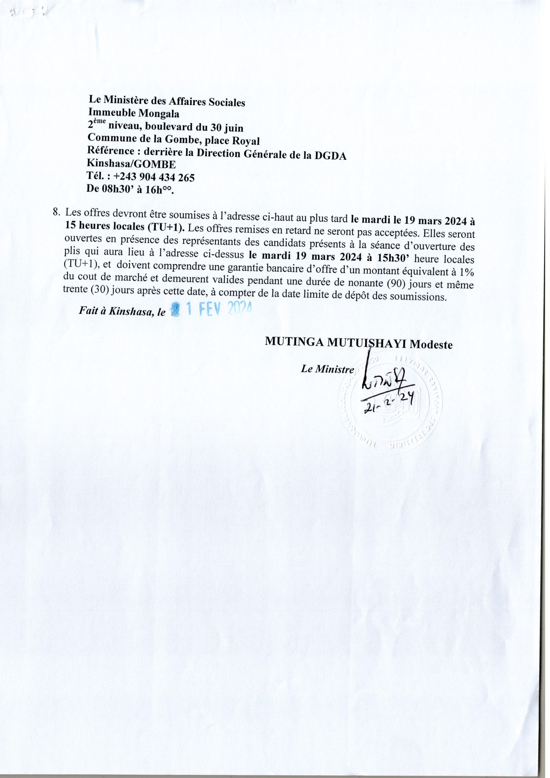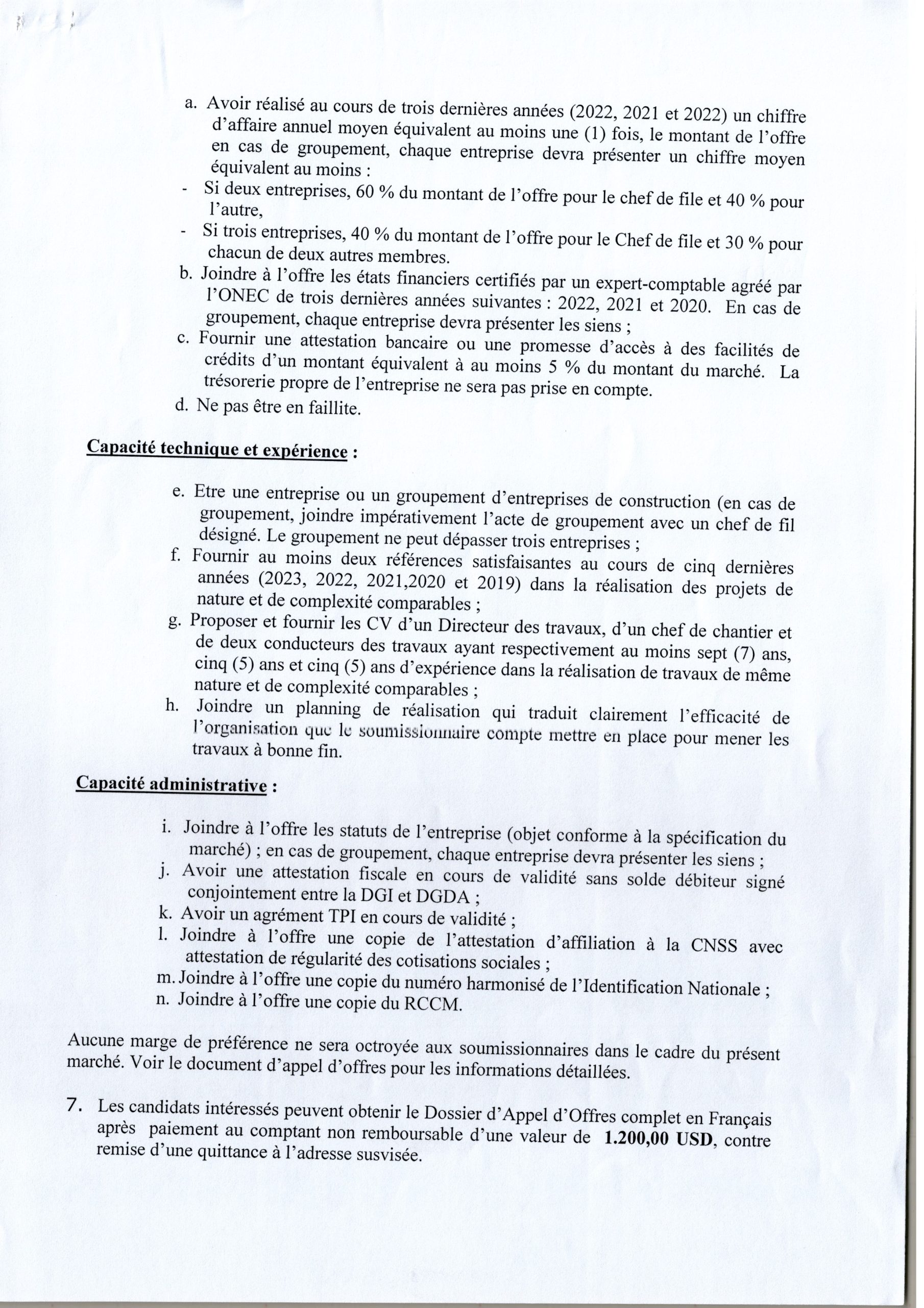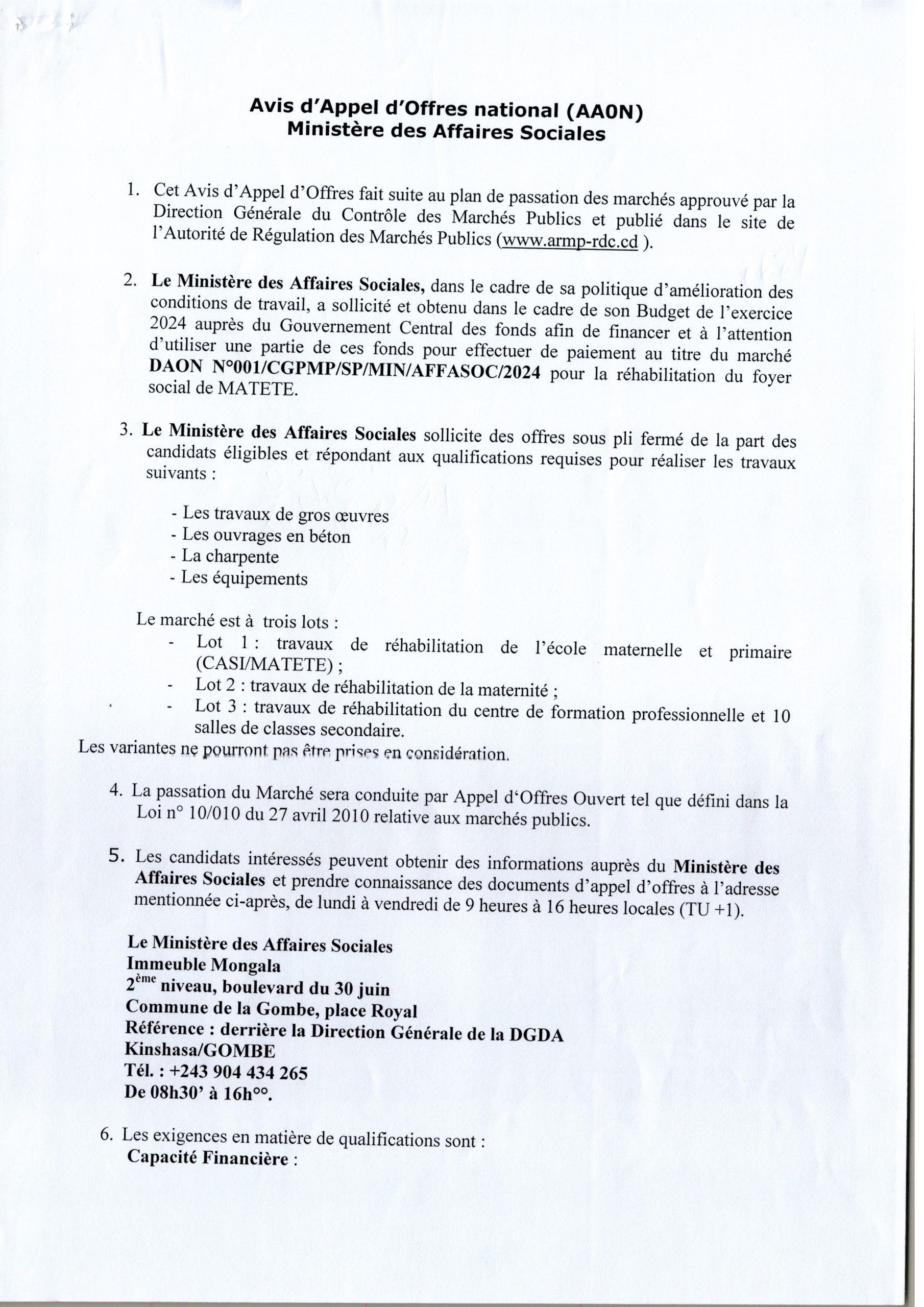 AVIS D’APPEL D’OFFRES NATIONAL RELATIF AU MARCHÉ DES TRAVAUX DE RÉHABILITATION DU FOYER SOCIAL DE MATETE À TROIS LOTS (LOT1,LOT2 ET LOT3).