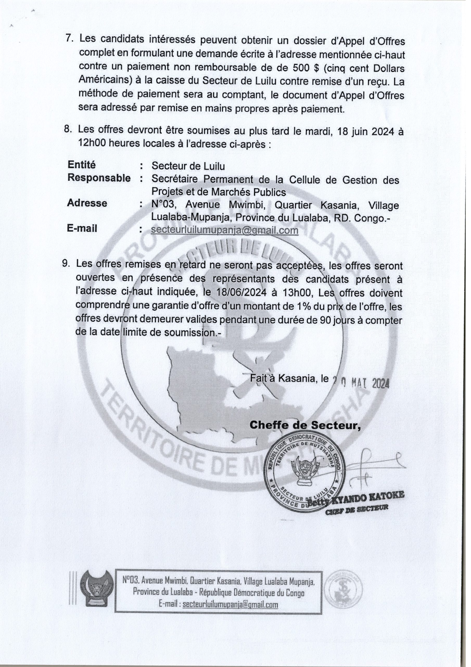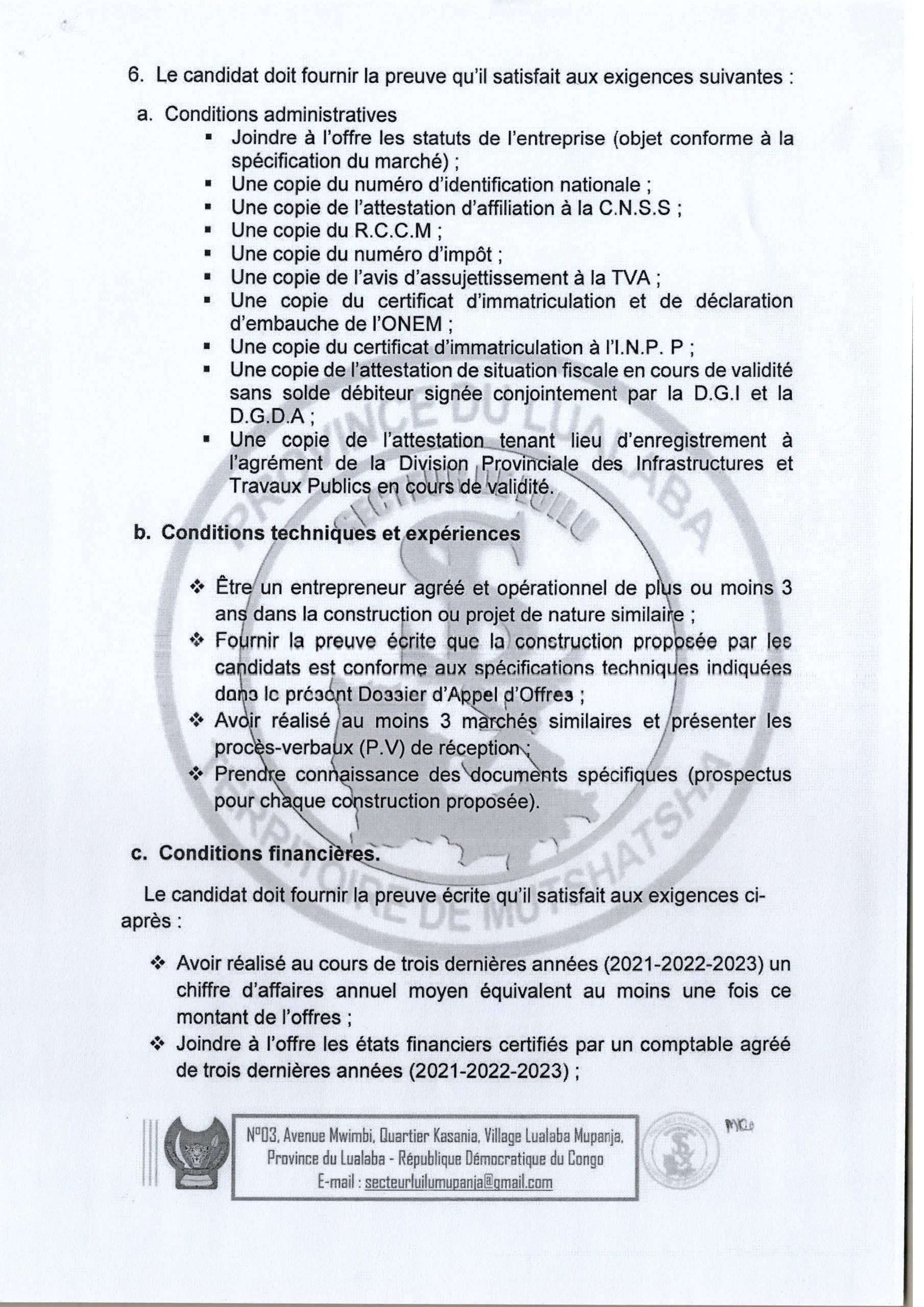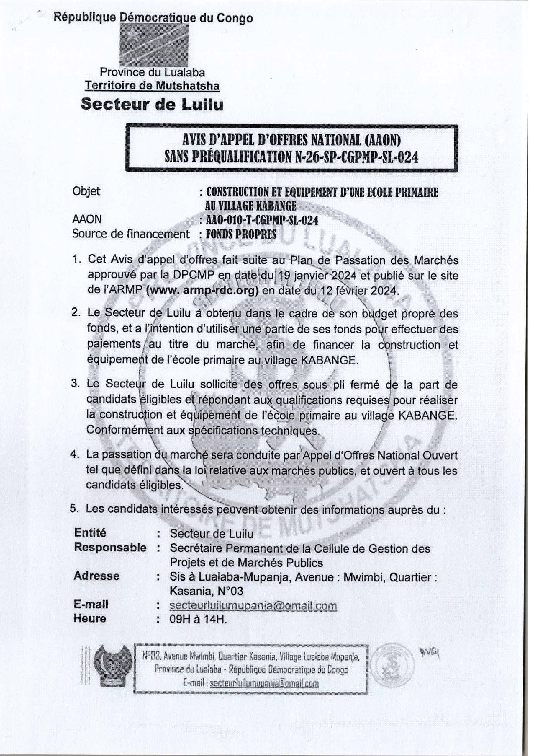 AVIS D’APPEL D’OFFRES NATIONAL SANS PRÉ-QUALIFICATION RELATIF AU MARCHÉ DE CONSTRUCTION ET ÉQUIPEMENT D’UNE ÉCOLE PRIMAIRE AU VILLAGE KABANGE.