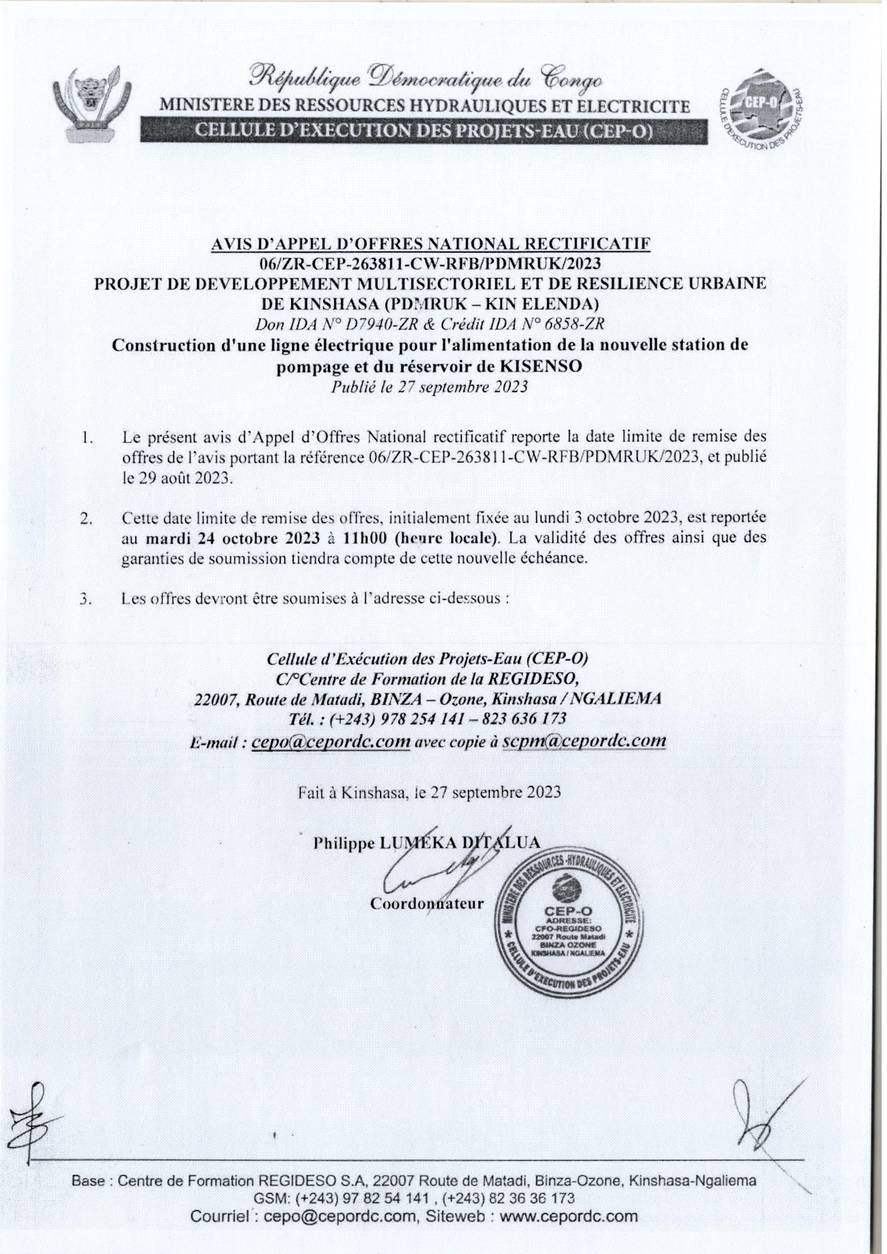 Avis d’appel d’offres Rectificatif du ministère des RHE relatif à la Construction d’une ligne électrique pour l’alimentation de la nouvelle station de pompage et du réservoir de KISENSO.
