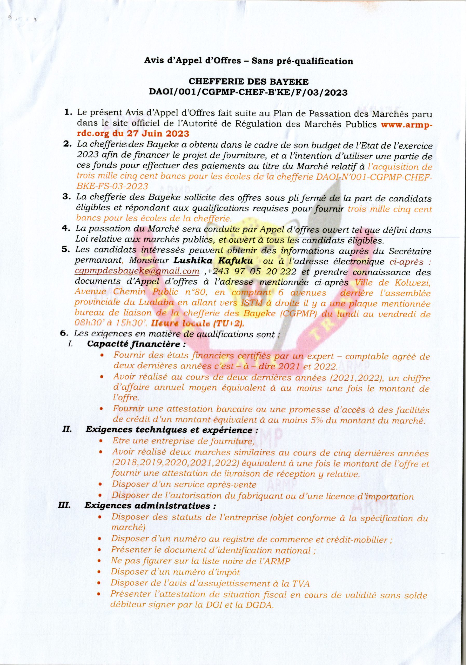 Avis d’appel d’offres relatif à l’acquisition de trois mille cinq cent bancs pour les écoles de la chefferie .