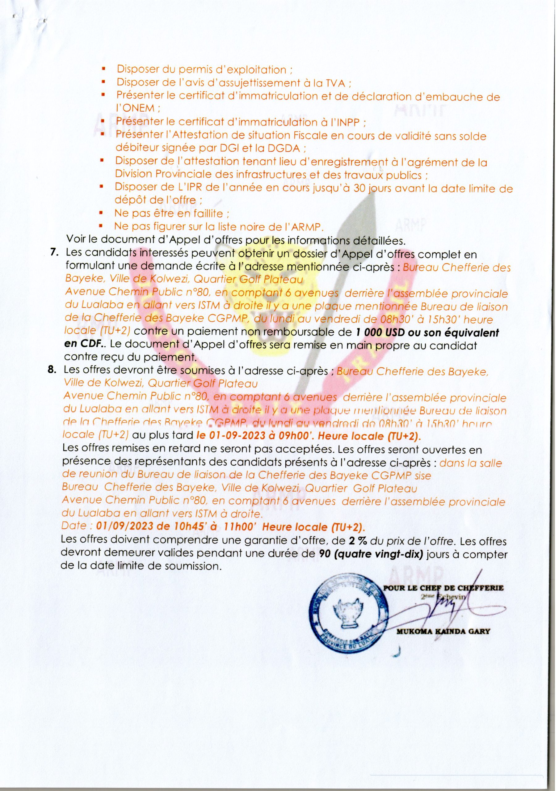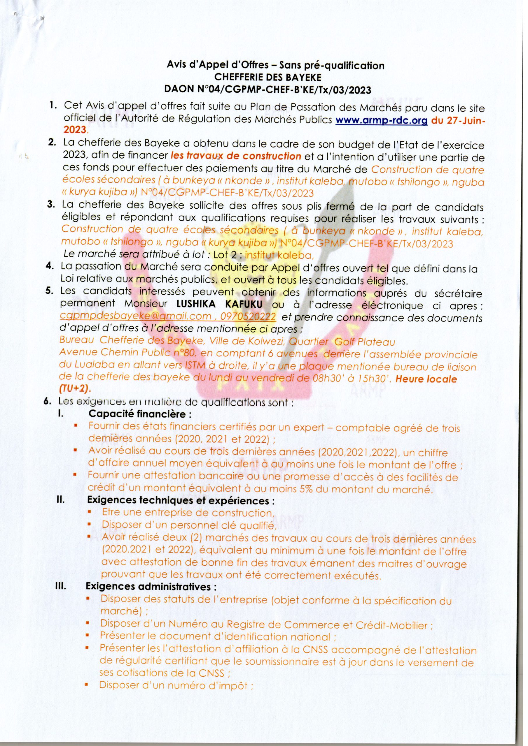 AVIS D’APPEL D’OFFRES RELATIF AU MARCHÉ DE CONSTRUCTION DE QUATRE ÉCOLES SECONDAIRES (À BUNKEYA “NKANDE “, INSTITUT KALEBA MUTOBO “TSHILONGO” NGUBA “KURYA KUJIKA”.