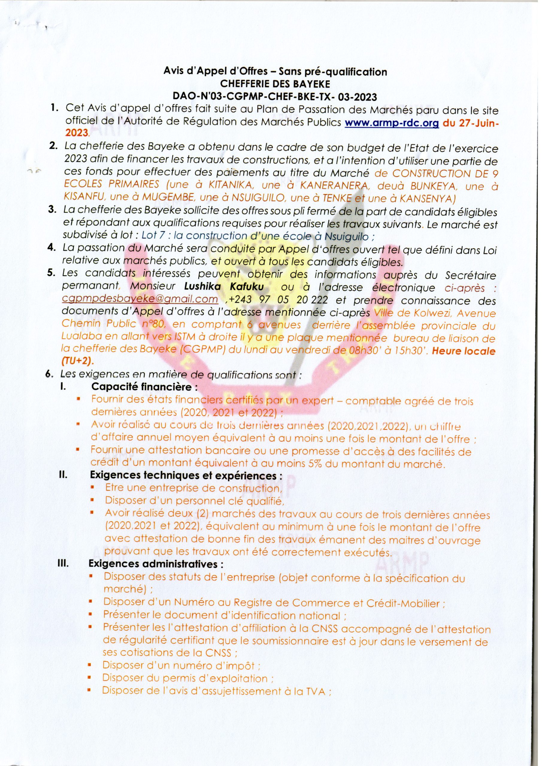 Avis d’appel d’offres relatif au travaux de construction d’une école à Nsuiguilo (lot 7)