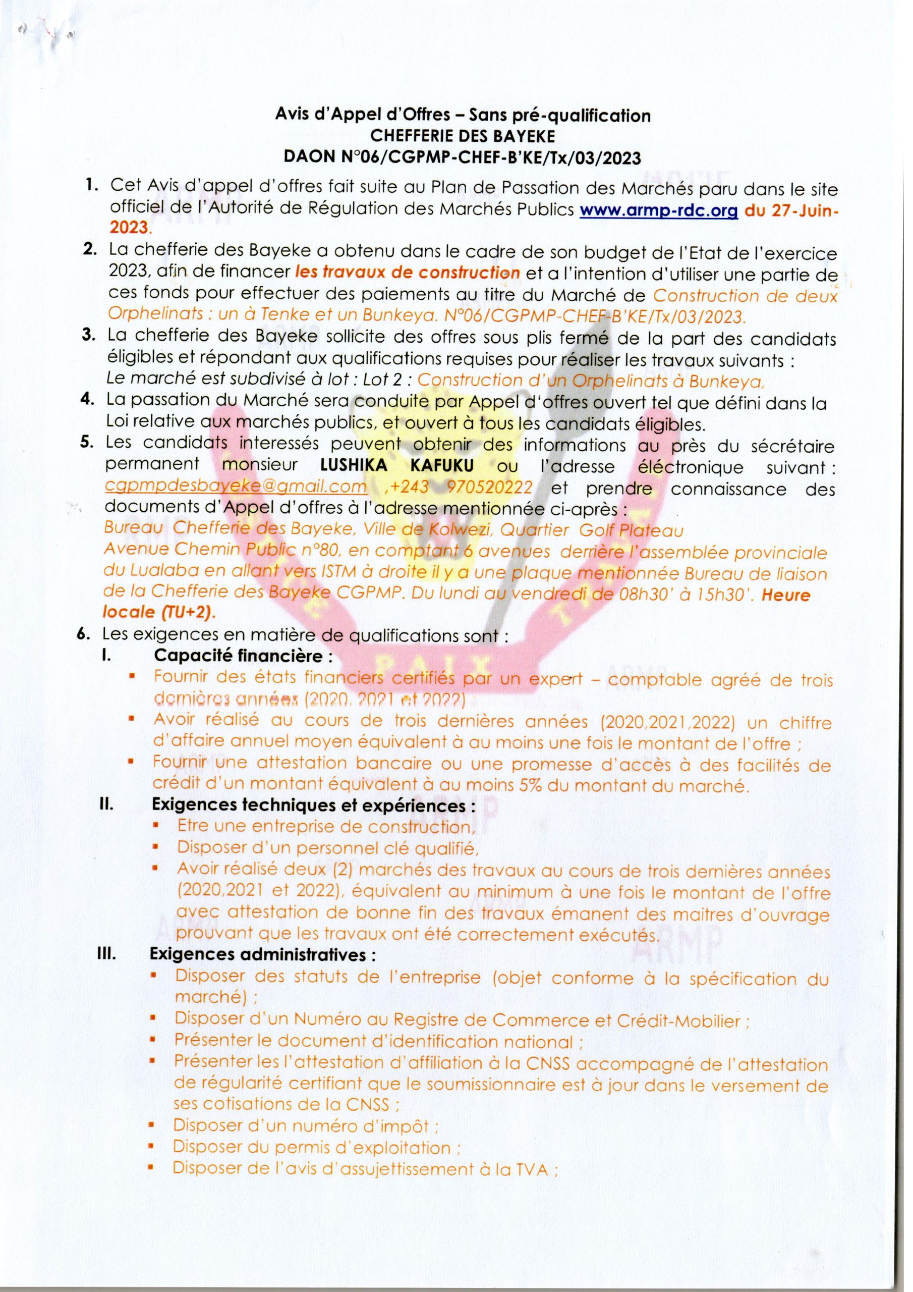 AVIS D’APPEL D’OFFRES RELATIF AUX TRAVAUX DE CONSTRUCTION DE DEUX ORPHELINATS : UN À TENKE ET UN BUNKEYA .