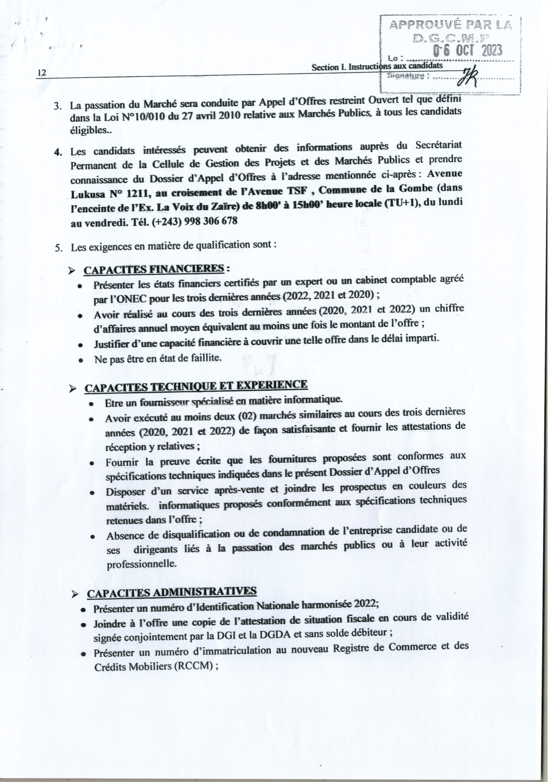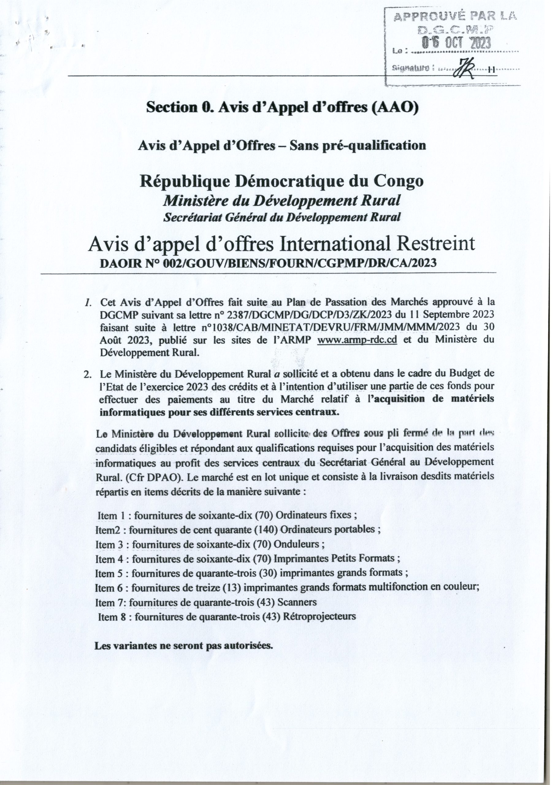 AVIS D’APPEL D’OFFRES SANS PRÉ-QUALIFICATION RELATIF À L’ACQUISITION DE MATÉRIELS INFORMATIQUES POUR SES DIFFÉRENTS SERVICES CENTRAUX.