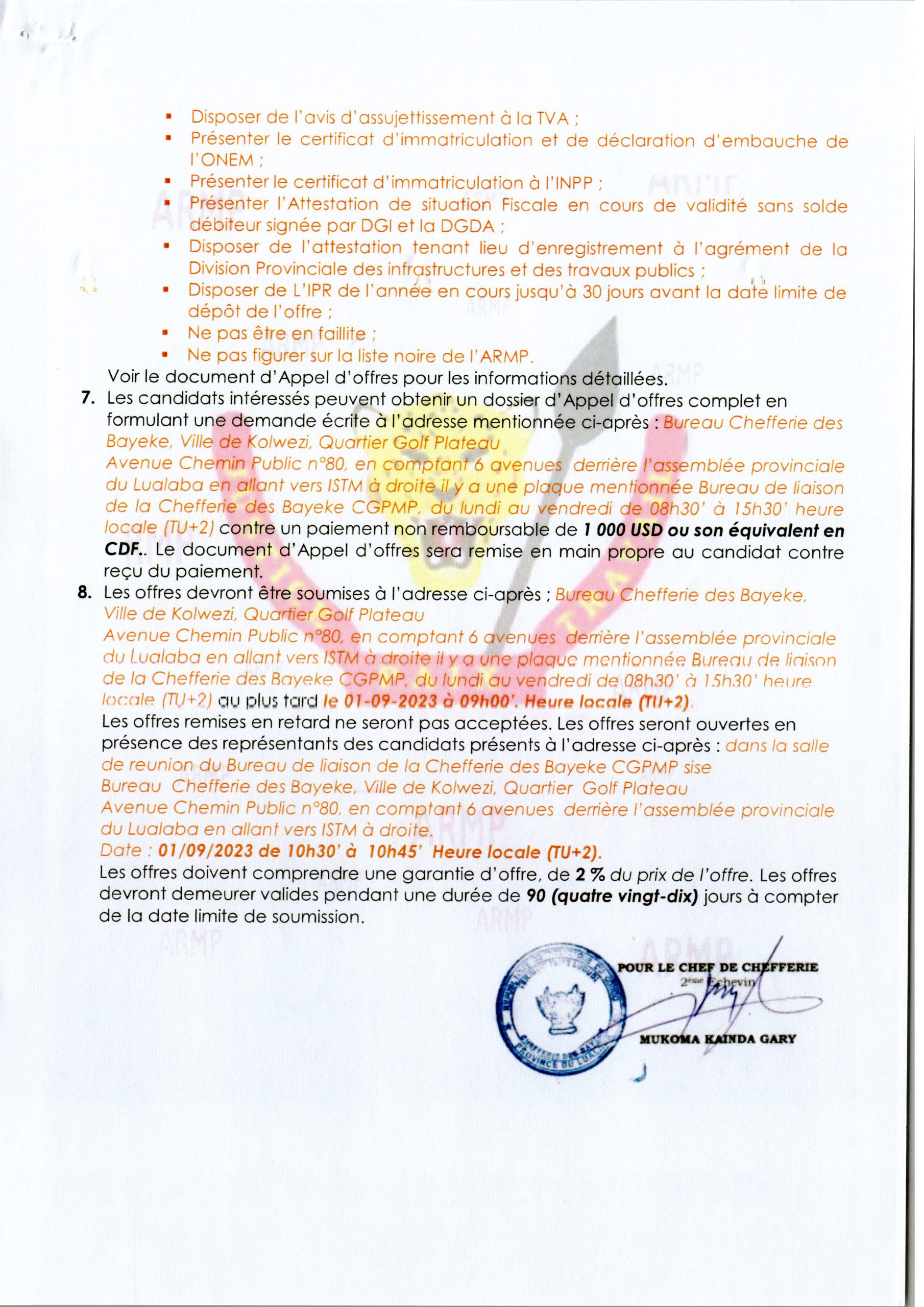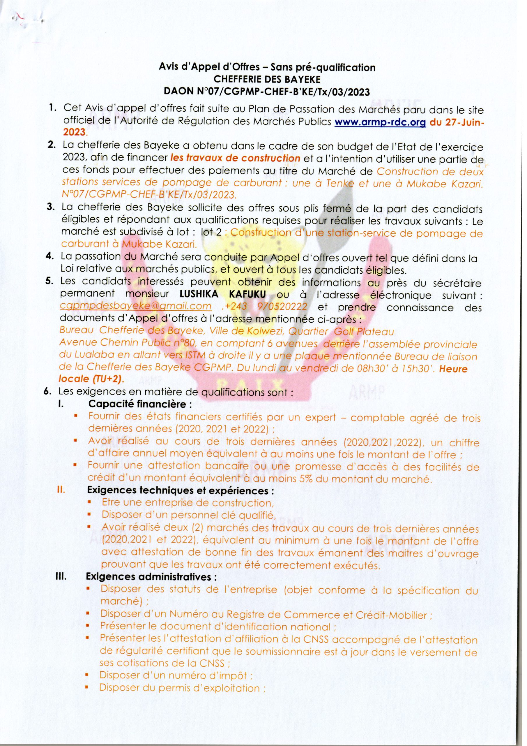 AVIS D’APPEL D’OFFRES SANS PRÉ- QUALIFICATION RELATIF AU MARCHÉ DE CONSTRUCTION DE DEUX STATIONS SERVICES DE POMPAGE DE CARBURANT : UNE À TENKE ET UNE À MUKABE KAZARI
