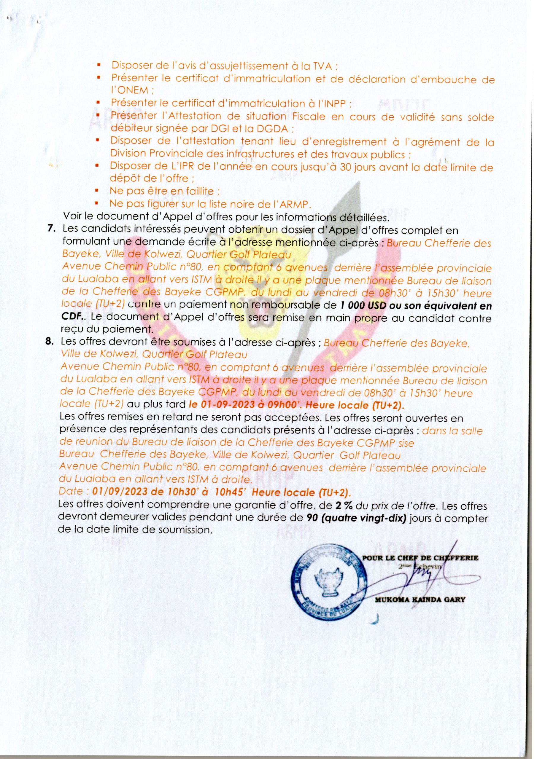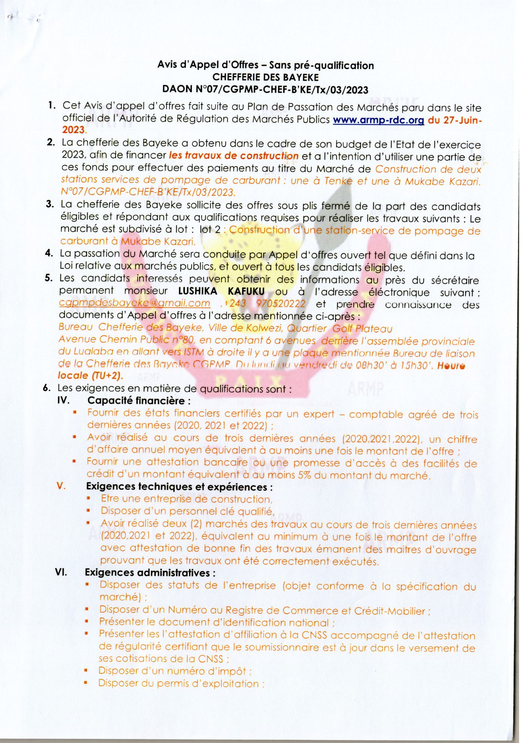 CONSTRUCTION DE DEUX STATIONS SERVICES DE POMPAGE DE CARBURANT : UNE À TENKE ET UNE À MUKABE KAZARI .
