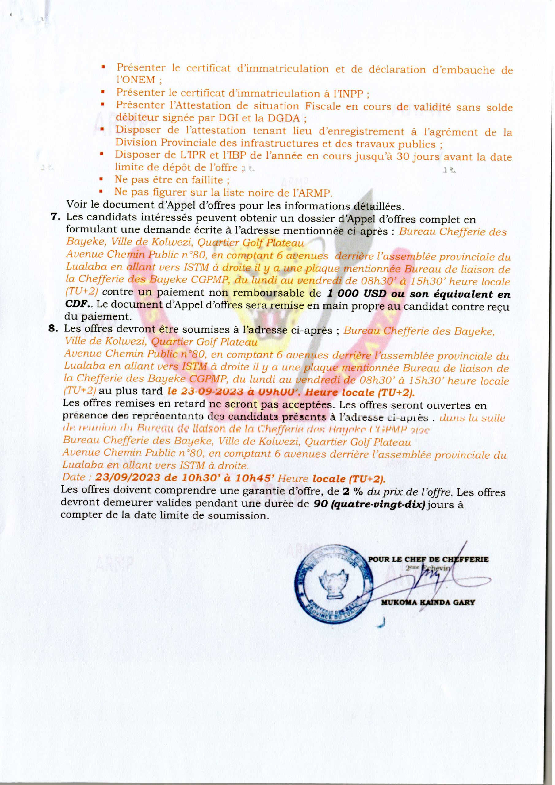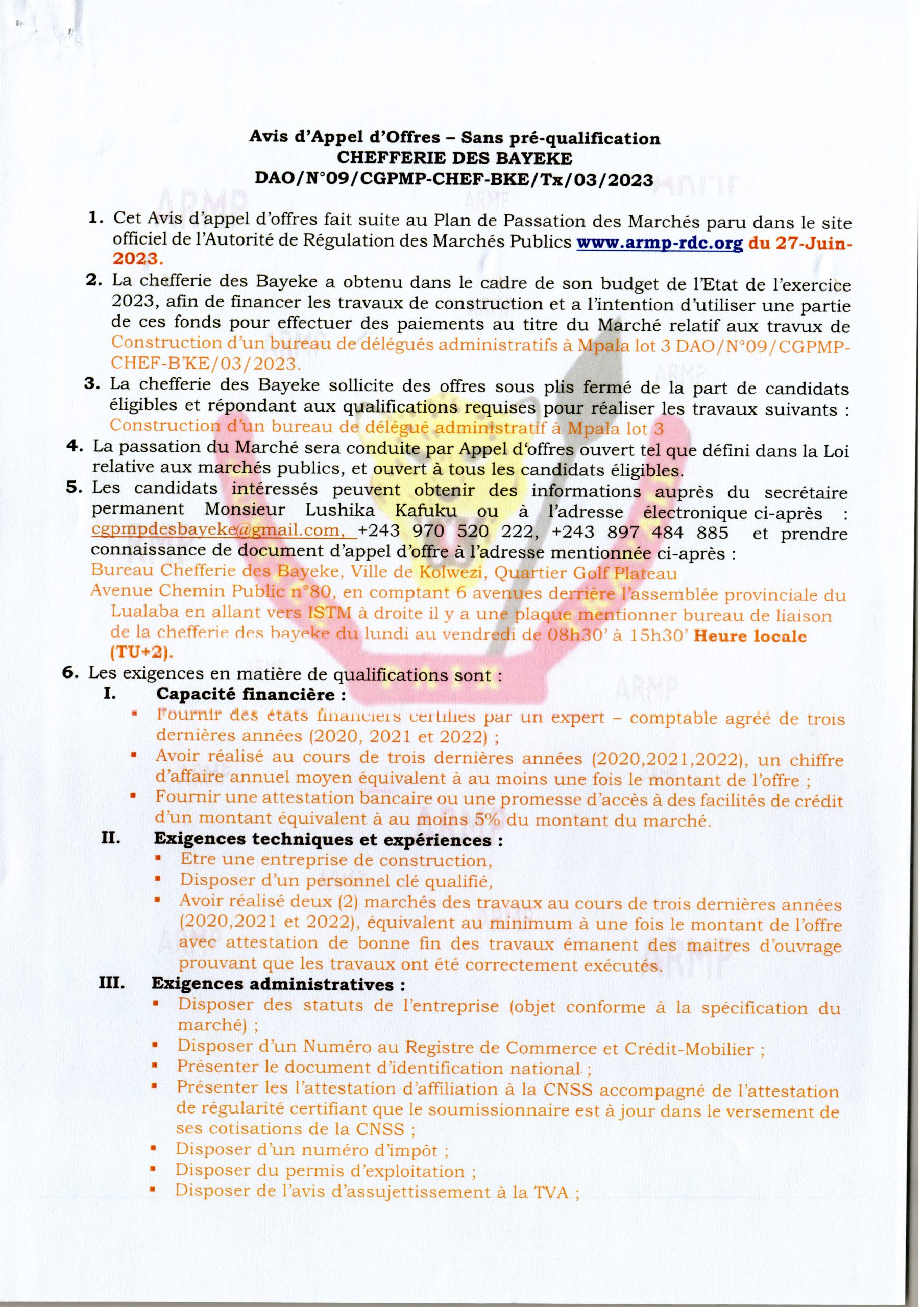 CONSTRUCTION D’UN BUREAU DE DÉLÉGUÉ ADMINISTRATIF À MPALA LOT 3.