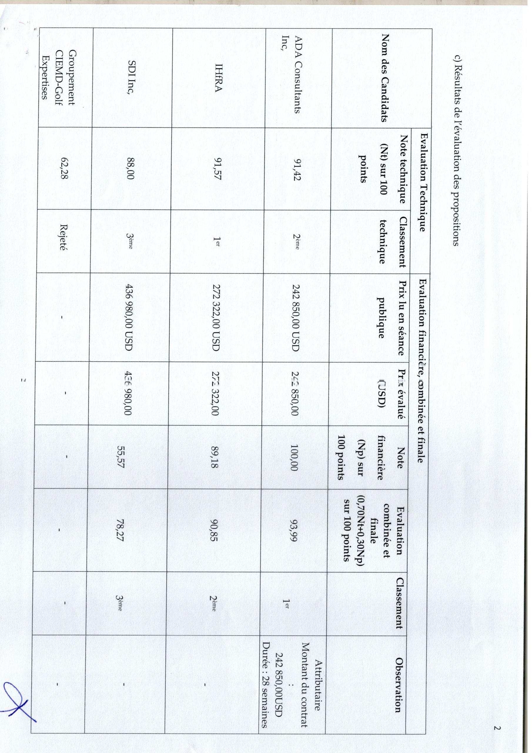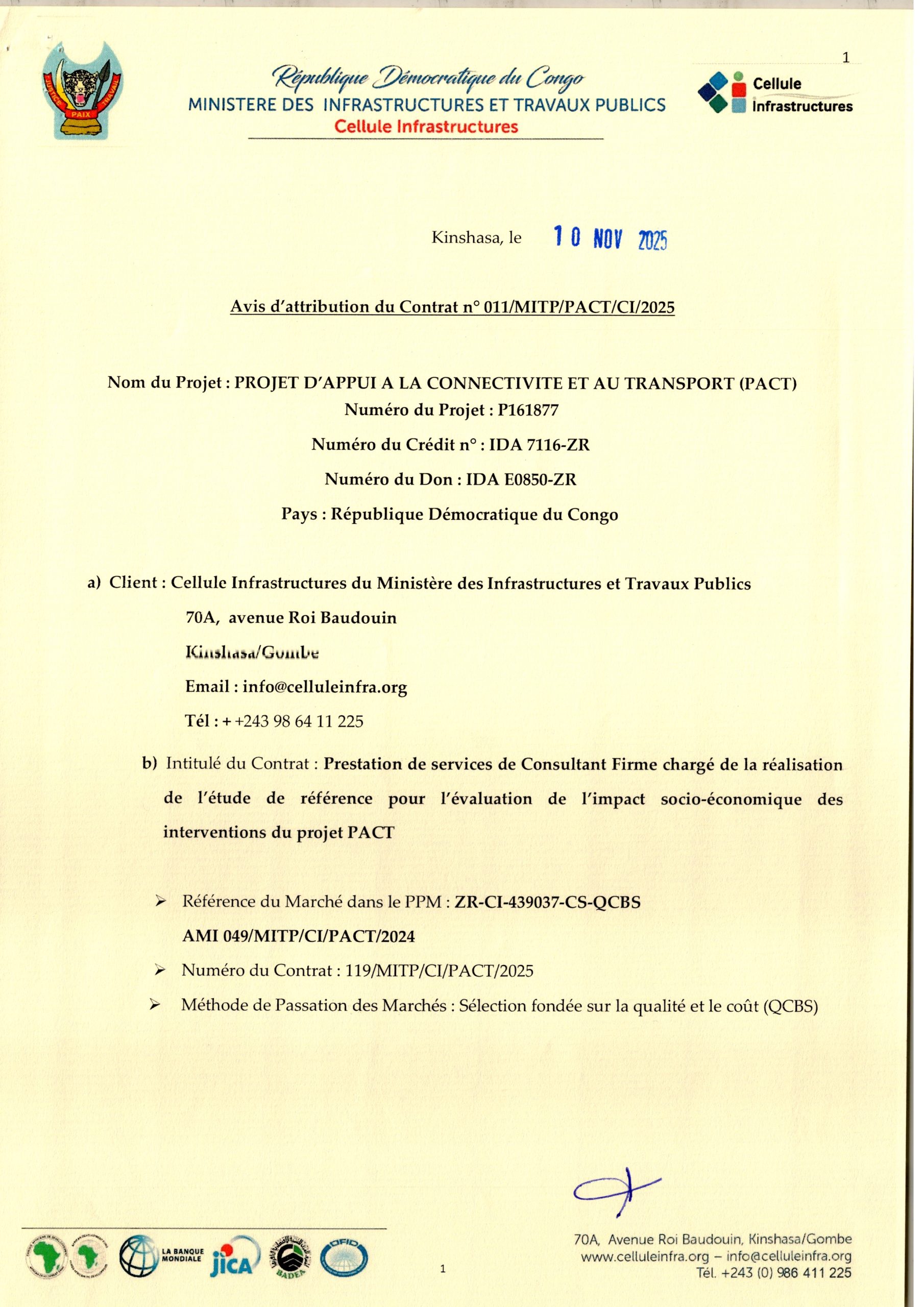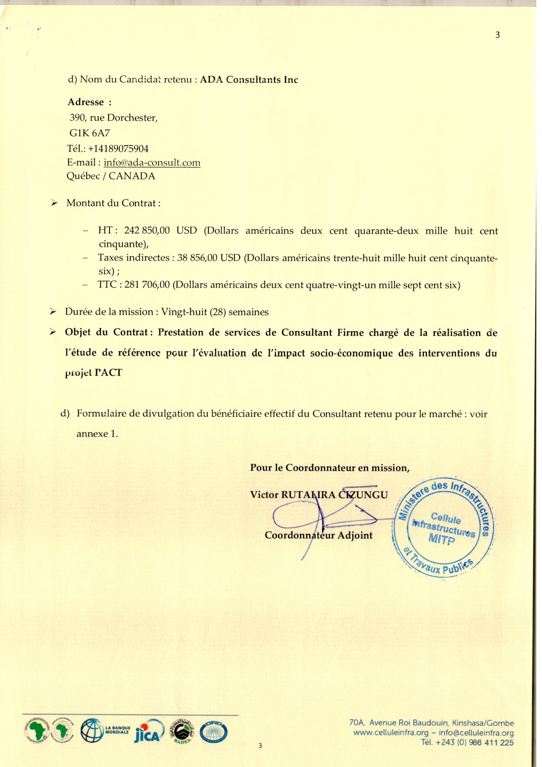Avis d’attribution accordée au candidat ADA Consultants Inc relatif à la prestation de services de consultant firme chargé de la réalisation de l’étude de référence pour l’évaluation de l’impact socio-économique des intervention du projet PACT.