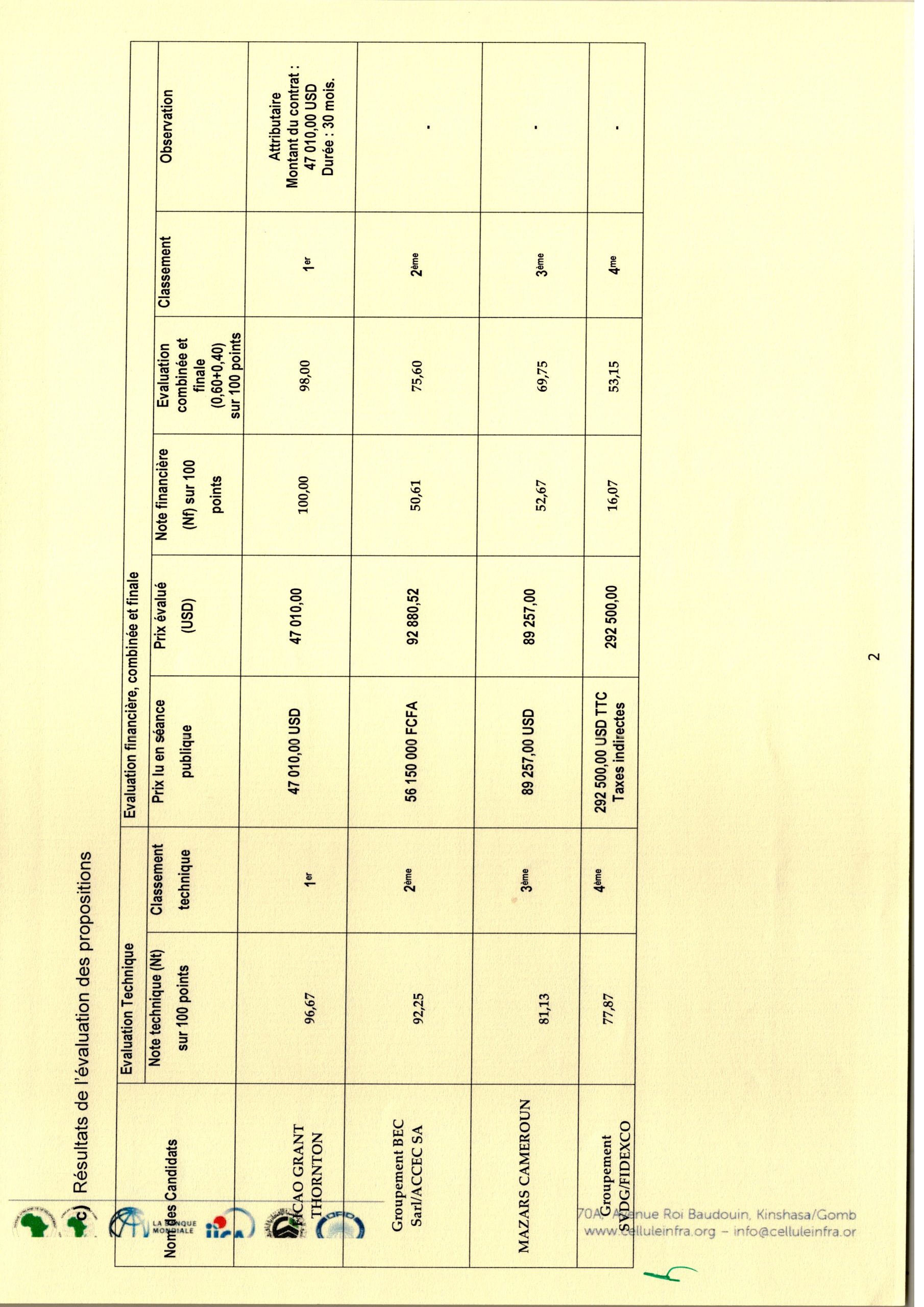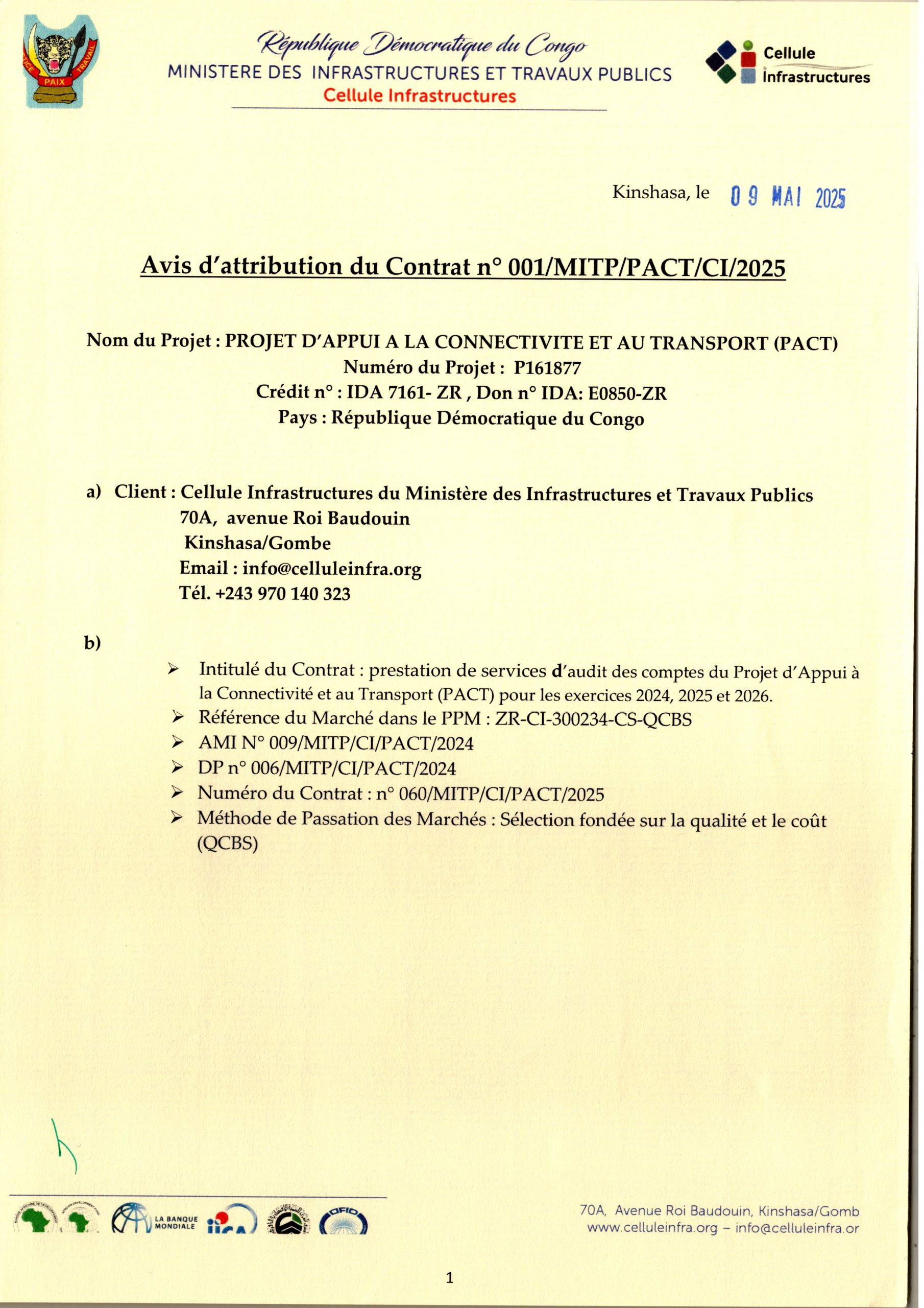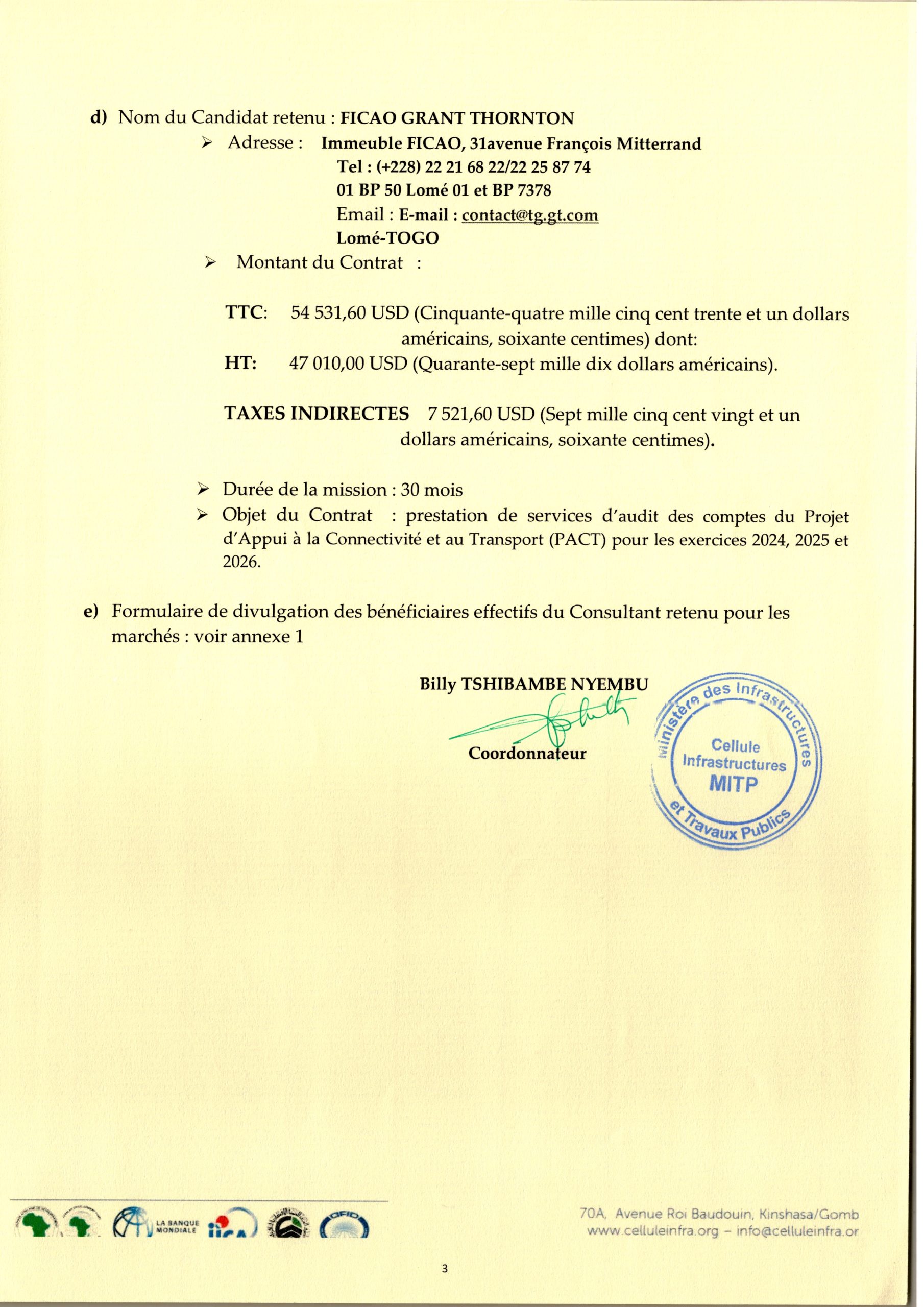 Avis d’attribution accordée au candidat “FICAO GRANT THORNTON “relative au marché de prestation de services d’audit des comptes du projet d’Appui à la connectivité et au transport (PACT) pour les exercices 2024,2025 et 2026.