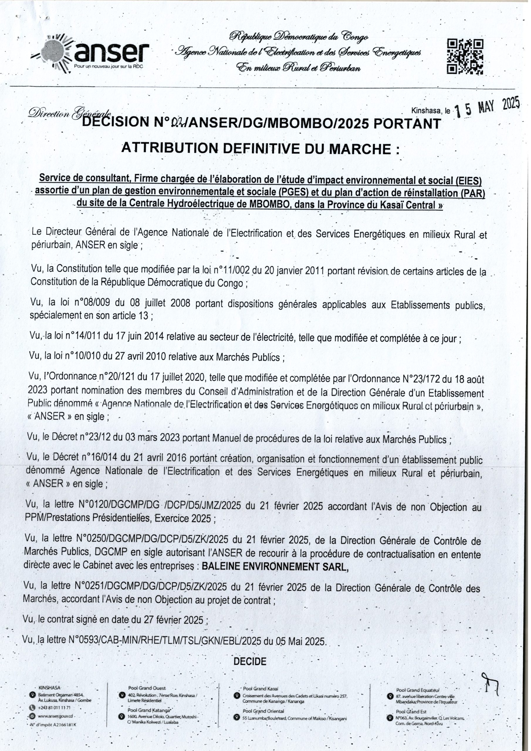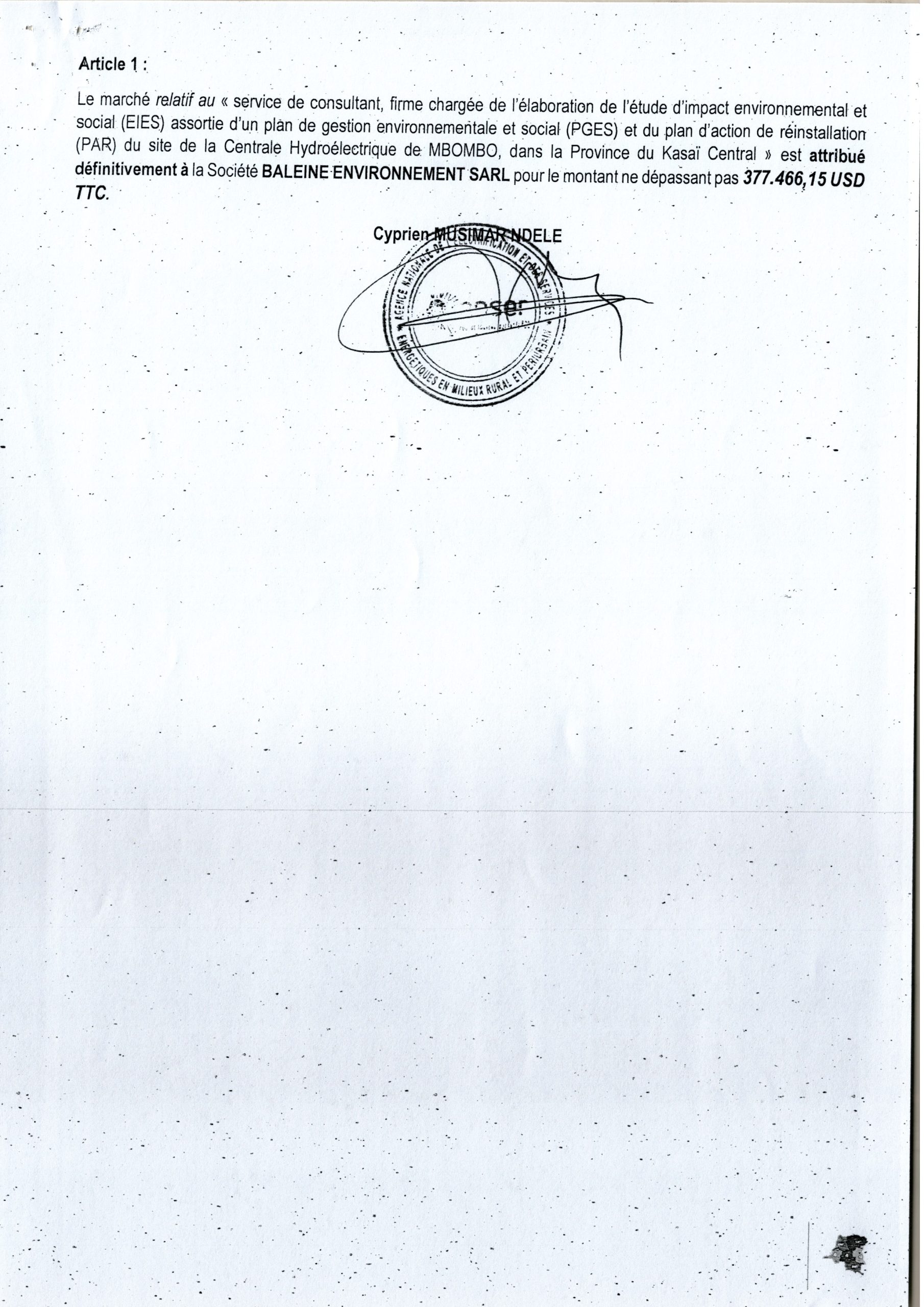 Avis d’attribution définitive accordée à la société BALEINE ENVIRONNEMENT SARL relatif au service de consultant Firme chargée de l’élaboration de l’étude d’impact environnement et social (EIES) assortie d’un plan de gestion…