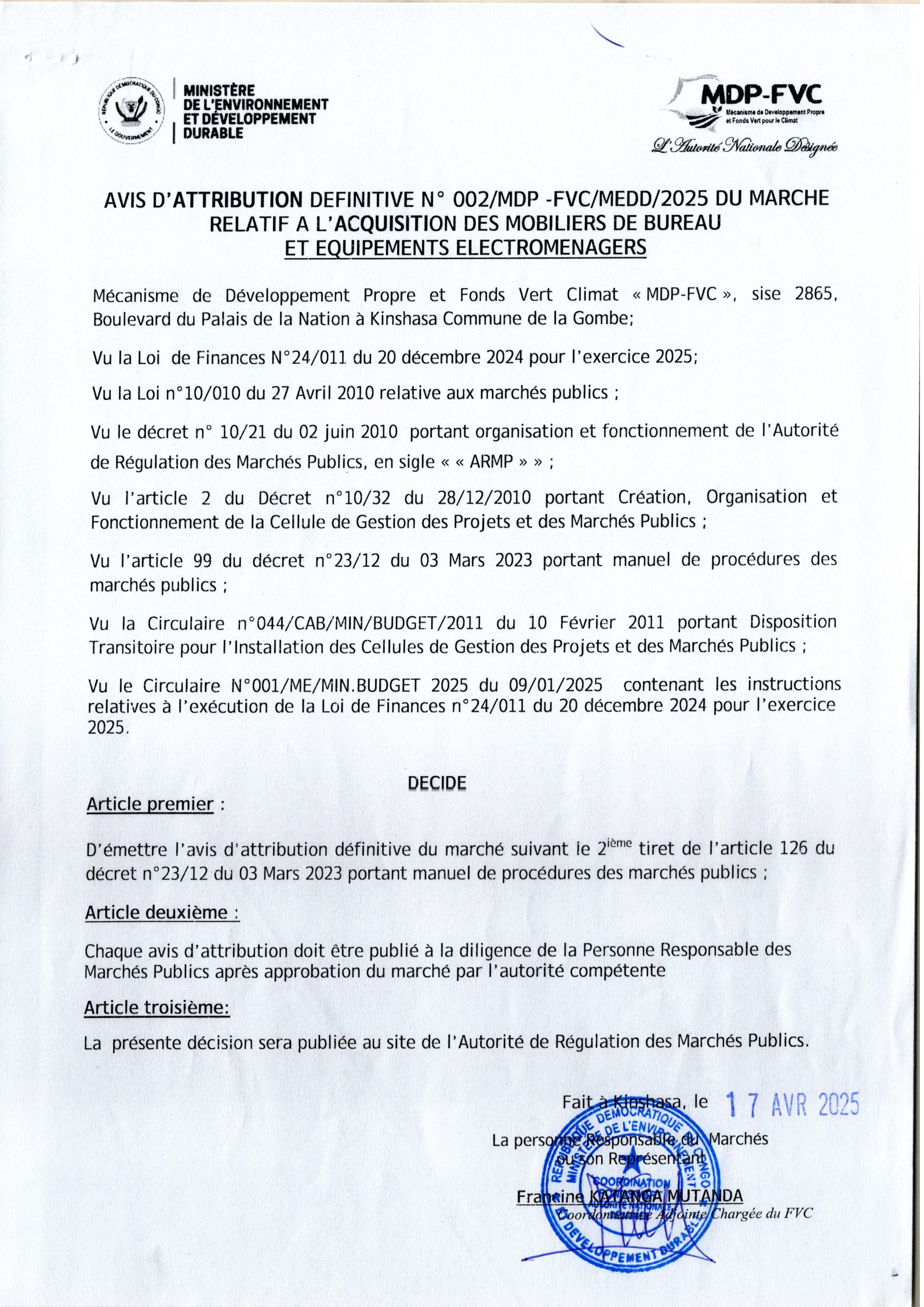 Avis d’attribution définitive n°002/MDP-FVC/MEDD/2025 du marché relatif à l’acquisition des mobiliers de bureau et équipements électroménagers.