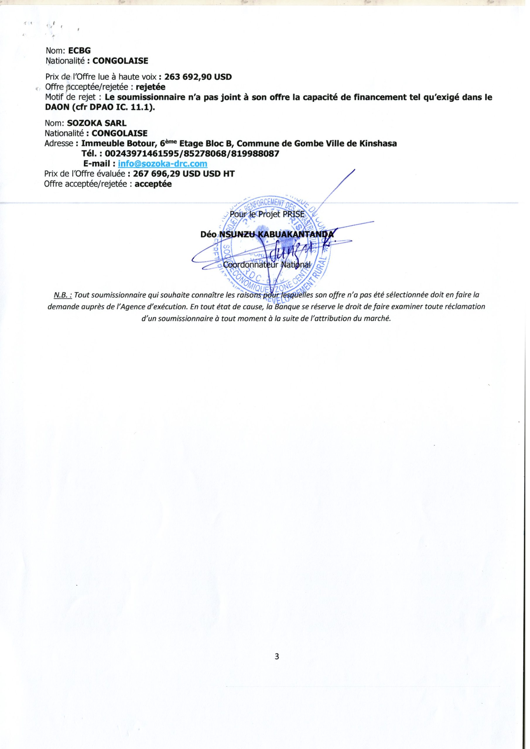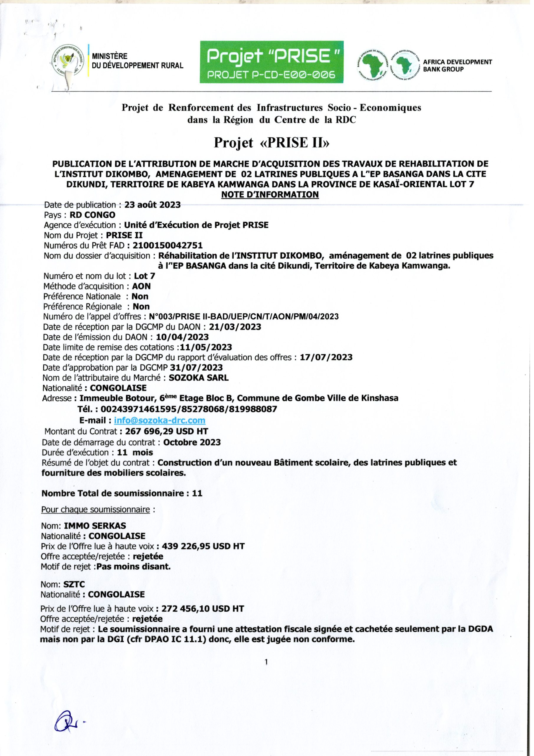 ATTRIBUTION DU MARCHÉ ACCORDEE AUX ENTREPRISES … RELATIVE AUX TRAVAUX DE RÉHABILITATION DE L’INSTITUT DIKOMO, AMÉNAGEMENT DE 02 LATRINES PUBLIQUES À L’EP BASANGA DANS LA CITÉ DIKUNDI, TERRITOIRE DE KABEYA KAMWANGA DANS LA PROVINCE DE KASAI- …