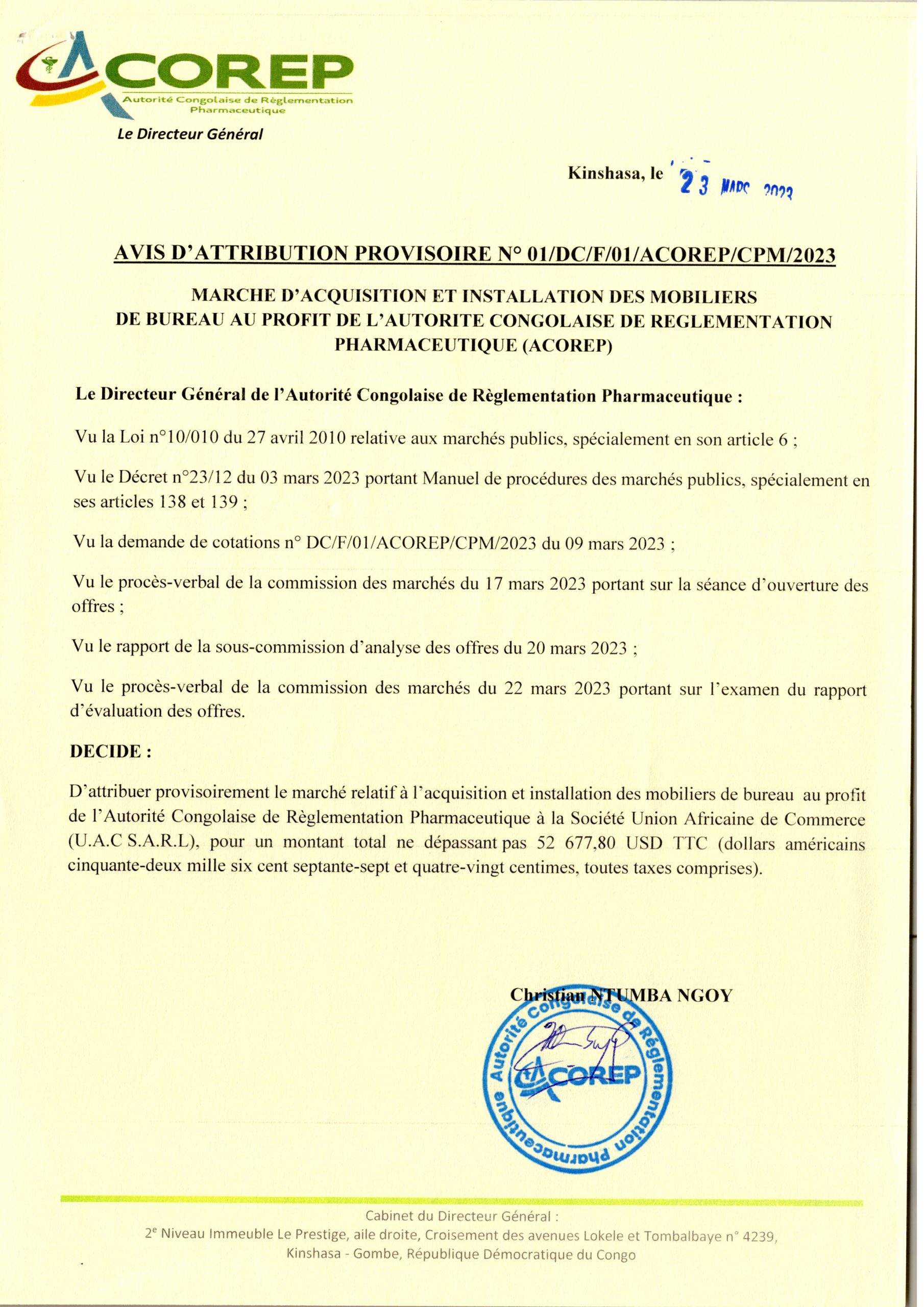 ATTRIBUTION PROVISOIRE DU MARCHE RELATIF A L’ACQUISITION ET INSTALLATION DES MOBILIERS DE BUREAU AU PROFIT DE L’AUTORITE CONGOLAISE DE REGLEMENTATION PHARMACEUTIQUE