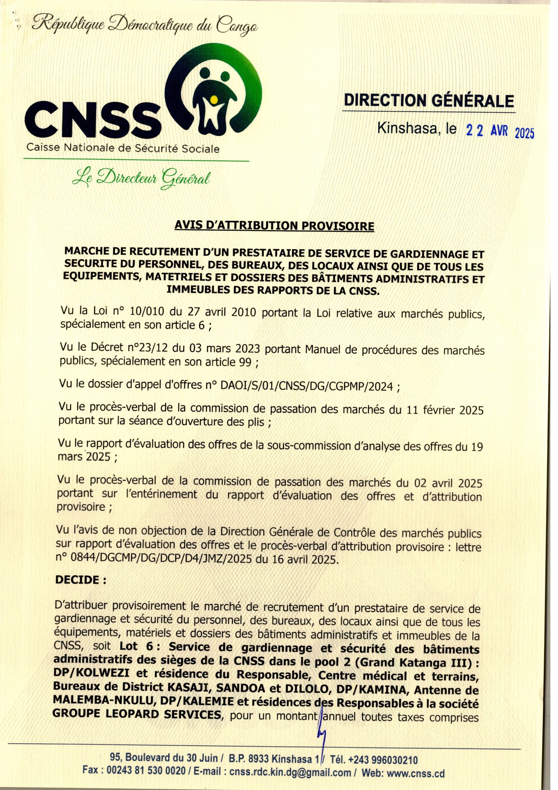 Avis d’attribution provisoire accordée à la société GROUPE LEOPARD SERVICES marché relatif au recrutement d’un prestataire de service de gardiennage et sécurité du personnel, des bureaux, des locaux ainsi que de tous les équipements, matériels et dossiers des bâtiments administratifs et immeuble de la CNSS (lot6).
