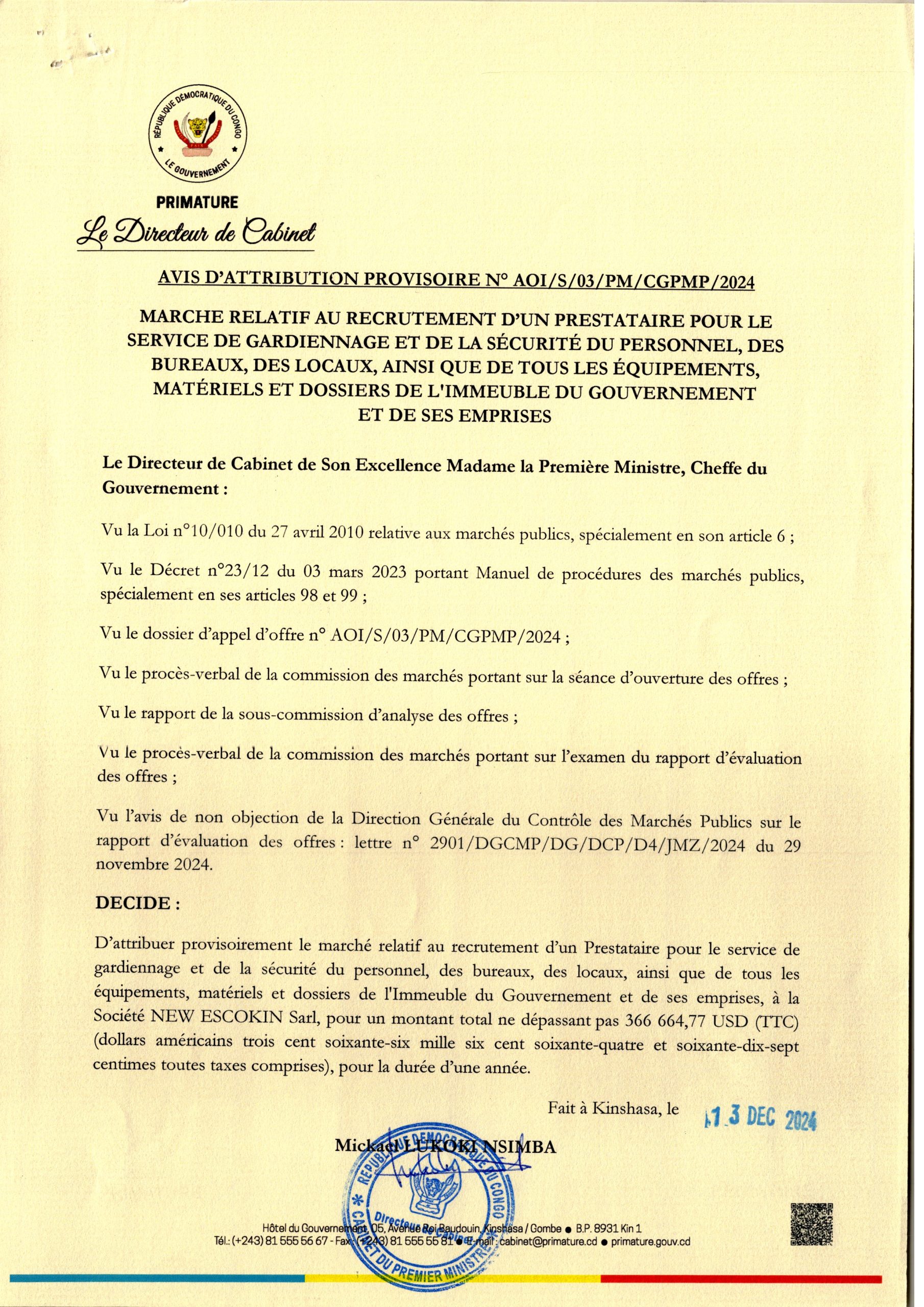 Avis d’attribution provisoire accordée à la Société NEW ESCOKIN relatif au recrutement d’un prestataire pour le service de gardiennage et de la sécurité du personnel, des bureaux, des locaux ainsi que de tous les équipements, matériels …